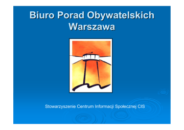 Biuro Porad Obywatelskich Warszawa Stowarzyszenie Centrum Informacji Społecznej CIS Czym jest poradnictwo obywatelskie? Informowaniem obywateli: o przysługujących im prawach i obowiązkach, o tym, w jaki sposób mogą dochodzić swoich praw, z pomocy jakich instytucji mogą korzystać, aby rozwiązać trudną sytuację w jakiej się znaleźli, ale i o tym jakie mogą być konsekwencje ich działań, wspieraniem w samodzielnym podejmowaniu decyzji. Zasady poradnictwa obywatelskiego bezpłatność, bezstronność, otwartość dla wszystkich, poufność, niezaleŜność, aktualność i rzetelność informacji, samodzielność klienta. Zgłaszane problemy Kiedy rozpoczęło się poradnictwo obywatelskie w Polsce? 1996 r. powstaje pierwsze Biuro Porad Obywatelskich w Warszawie, a potem kolejne w ŁomŜy, Przemyślu i Wrocławiu Punkty Porad Obywatelskich Bielany Mokotów Praga Północ Wola Bemowo OŜarów Mazowiecki Mińsk Mazowiecki Punkty w Zakładach Karnych Warszawa SłuŜewiec Warszawa Grochów Grodzisk Mazowiecki Poradnictwo obywatelskie dla osób zagroŜonych utratą mieszkania Projekt współfinansowany ze środków Funduszu Inicjatyw Obywatelskich realizowany był od lipca do grudnia 2008r. Celem projektu była edukacja obywatelska osób z zadłuŜeniem czynszowym tak, aby w wyniku poradnictwa obywatelskiego zrozumieli swoje połoŜenie, poznali konsekwencje biernej postawy oraz podjęli aktywne i samodzielne działania zmierzające do zminimalizowania negatywnych skutków zadłuŜeń. Poradnictwo obywatelskie dla osób zagroŜonych utratą mieszkania Cel szczegółowy projektu: zachęcenie do podejmowania aktywnego działania prowadzącego do rozwiązania problemu poprzez: - zmniejszenie wysokości zadłuŜeń czynszowych zapobieganie utracie mieszkania w wyniku eksmisji Poradnictwo obywatelskie dla osób zagroŜonych utratą mieszkania Praca z osobami zadłuŜonymi: - szczegółowa diagnoza sytuacji prowadzących do zadłuŜenia analiza obecnej sytuacji - indywidualne plany działania - systematyczny monitoring podejmowanych działań - Poradnictwo obywatelskie dla osób zagroŜonych utratą mieszkania We współpracy z Biurem Polityki Społecznej i Biurem Polityki Lokalowej została przeprowadzona akcja informacyjna. - - Plakaty i ulotki skierowane do osób zadłuŜonych trafiły do: Zakładów Gospodarowania Nieruchomościami Ośrodków Pomocy Społecznej we wszystkich dzielnicach m. st. Warszawy. Poradnictwo obywatelskie dla osób zagroŜonych utratą mieszkania Przyczyny powstania zadłuŜeń czynszowych Średnia wysokość zadłuŜenia 13.218 zł Rezultaty Udzielono 645 porad osobom zadłuŜonym, w wyniku których: - 83% podjęło działania 12% spłaciło zadłuŜenie, a 32% jest w trakcie spłaty 56% płaci bieŜący czynsz w całości Bezpłatny poradnik dostępny w siedzibie BPO i Punktach Porad (1.000 ezg.) oraz na stronie www.warszawa.bpo.engo.pl Dalsze działania Działania rozpoczęte w ramach projektu „Poradnictwo obywatelskie dla osób zagroŜonych utratą mieszkania” będą kontynuowane przez najbliŜsze półtora roku dzięki środkom Mechanizmu Finansowego EOG i Norweskiego Mechanizmu Finansowego Dziękujemy za uwagę Stowarzyszenie Centrum Informacji Społecznej CIS Biuro Porad Obywatelskich Ul. Gałczyńskiego 3 00- 362 Warszawa Tel. (022) 828 12 95 www.warszawa.bpo.engo.pl [email protected]