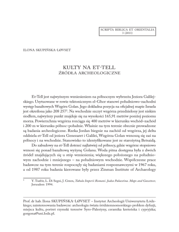 SCRIPTA BIBLICA ET ORIENTALIA 3 (2011) ILONA SKUPIŃSKA-LØVSET KULTY NA ET-TELL. ŹRÓDŁA ARCHEOLOGICZNE Et-Tell jest najwyższym wzniesieniem na północnym wybrzeżu Jeziora Galilejskiego. Usytuowane w rowie tektonicznym el-Ghor stanowi południowo-zachodni występ bazaltowych Wzgórz Golan. Jego dokładna pozycja na oficjalnej mapie Izraela jest określona jako 208 2571. Na wschodzie szczyt wzgórza przedzielony jest niskim siodłem, najwyższy punkt znajduje się na wysokości 165,91 metrów poniżej poziomu morza. Powierzchnia wzgórza rozciąga się 400 metrów w kierunku wschód–zachód i 200 m w kierunku północ–południe. Właśnie na tym terenie obecnie prowadzone są badania archeologiczne. Rzeka Jordan biegnie na zachód od wzgórza, jej delta oddziela et-Tell od jeziora Genezaret i Galilei, Wzgórza Golan wznoszą się zaś na północy i na wschodzie. Stanowisko to identyfikowane jest ze starożytną Betsaidą. Do zabudowy na et-Tell dotrzeć najłatwiej od północy, gdzie wzgórze stopniowo wznosi się ponad bazaltową wyżynę Golanu. Woda pitna dostępna była z dwóch źródeł znajdujących się u stóp wzniesienia; większego położonego na południowym zachodzie i mniejszego – na południowym wschodzie. Współczesne prace badawcze na tym terenie rozpoczęły się badaniami rozpoznawczymi w 1967 roku, a od 1987 roku badania kierowane były przez Zinman Institute of Archaeology 1 Y. Tsafrir, L. Di Segni, J. Green, Tabula Imperii Romani. Judea Palaestina. Maps and Gazetteer, Jerusalem 1994. Prof. dr hab. Ilona SKUPIŃSKA-LØVSET – Instytut Archeologii Uniwersytetu Łódzkiego; zainteresowania badawcze: archeologia świata śródziemnomorskiego problem dyfuzji, miejsca kultu, portret rzymski terenów Syro-Palestyny, ceramika kreteńska i cypryjska; [email protected]. 110 ILONA SKUPIŃSKA-LØVSET Uniwersytetu w Haifie, w międzyczasie (1981) stworzone zostało Międzynarodowe Konsorcjum Uniwersytów i Instytucji Badawczych, z siedzibą w University of Nebraska w Omaha2. Konsorcjum to z czasem przejęło kierownictwo wykopalisk. Misja polska Uniwersytetu Łódzkiego i Uniwersytetu Kardynała Stefana Wyszyńskiego w Warszawie uczestniczyła w tych badaniach w latach 1998–2000. Naszym zadaniem było zakończenie prac archeologicznych na szczycie akropolis, terenie zniszczonym podczas działań wojennych i już wcześniej częściowo przebadanym. 1. OPIS MIEJSCA KULTU PRZY BRAMIE MIEJSKIEJ Znaczenie badań w Betsaidzie, jako miejscu związanym z działalnością nauczycielską Jezusa, zostało dawno zauważone; na możliwość identyfikacji et-Tell z biblijną Betsaidą wskazują źródła odnoszące się do położenia geograficznego i topografii tego stanowiska3. Odkrycie odnoszące się do kultów poprzedzających przekazy biblijne, jakim jest miejsce kultu przy bramie miejskiej, było jednak całkowitą nowością i wzbudziło duże zainteresowanie w świecie naukowym. W czerwcu 1997 roku przy bramie miejskiej, w niszy obok występu północnej baszty murów, datowanych na Okres Żelaza, odkryto stelę z przedstawieniem ikonicznym (Fig. 1 a,b). Należy ona do rzadkiego typu znalezisk4. Odnaleziona stela była rozbita na pięć części, lecz po konserwacji okazało się, że jest prawie kompletna. Późniejsze badania wykazały, że teren znaleziska stanowił podwórzec między bramą zewnętrzną a wewnętrzną. Brama wewnętrzna, mieszcząca cztery pomieszczenia, jest jedną z największych znanych do tej pory konstrukcji tego typu z Epoki Żelaza, na terenie północnej Palestyny i Transjordanii5. Sądzono, że brama ta należała do umocnień geszurickiego miasta Cer6. 2 3 4 5 6 Niniejszy artykuł nie uwzględnia długiej historii poszukiwań i wstępnych badań nad starożytną Betsaidą. Szersze omówienie znaleźć można m.in. w: I. Skupińska-Løvset, The Temple Area of Bethsaida. Polish Excavations on et-Tell in the Years 1998-2000, Łódź 2006, 25-47. Skupińska-Løvset, The Temple Area of Bethsaida, wraz z odniesieniami do literatury przedmiotu. I. Skupińska-Løvset, „The Results of the excavations at et-Tell, Roman Bethsaida. The cult site at the gate” w: The Orient and the Aegean. Papers presented at the Warsaw Symposium, 9th April 1999, Instytut Archeologii UW, red. F.M. Stępniowski, Warsaw 2003, 131–142. Tamże bibliografia tematu do roku 2002. Por. R. Chadwick, „Changing forms of gate architecture in Bronze and Iron Age Transjordan”, w: Studies on Iron Age Moab and Neighboring Areas in honor of Michèle Daviau, red. P. Bienkowski (Ancient Near Eastern Studies. Supplement 29) Leuven 2009, 200-211. R. Arav, „Bethsaida, Tzer, and the Fortified Cities of Naphtali”, w: Bethsaida. A City by the North Shore of the Sea of Galilee, Volume One, red. R. Arav, R.A. Freund, Kirksville 1995, 103-203. KULTY NA ET-TELL. ŹRÓDŁA ARCHEOLOGICZNE 111 Kompleks kultowy przy bramie miejskiej (Fig. 4) datowany jest do IX–VIII wieku p.n.e. Stary Testament (1 Krl 22; 2 Krl 23,8; Ezd 8,3-5; Ps 121,8) wskazuje, że praktyki religijne przy bramie miejskiej mogły mieć wieloraki charakter: być może były związane z faktem przekraczania granic miasta, zarówno w czasach pokoju, jak i podczas działań wojennych; rytuał przy bramie miejskiej mógł także dotyczyć działań wymaganych przepisami prawa lub szerzej: sądownictwa (Rdz 23,10; 34,20-24; Pwt 17,5; 21,19; 22,15; 25,7 itd.); ponadto obszar przyległy do bramy miejskiej mógł być związany z kultem przodków7. Miejsce kultowe (Fig.1 a,b) zbudowane było z bloków bazaltu pokrytych cienką warstwą gipsu. Składało się ono z dwóch stopni z kwadratową płytą o długości boku równej 153 cm na szczycie, na niej spoczywał bazaltowy pojemnik o wymiarach 69 cm x 50 cm x 35 cm, z wgłębieniem wielkości 53 cm x 35 cm x 10 cm. Znajdowała sie tam również, ustawiona pionowo, wspomniana już ikoniczna stela. Całkowita wysokość miejsca kultu (bez steli) wynosiła 80 cm. W chwili odk
