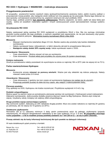 RO 3333 + Hydropox + NS200/300 – instrukcja stosowania Przygotowanie powierzchni W przypadku powierzchni bardzo zwartych (stary epoksyd/mechanicznie zacierany beton, płytki) musimy zadbać o przyczepność nowej powłoki, aby następnie wózki widłowe lub inne pojazdy jej nie pozrywały. Można tego dokonać na dwa sposoby: schropowacić powierzchnię (np. papierem ściernym) lub użyć podkładu 3333. Oprócz tego, podłoże powinno być starannie odtłuszczone. Musimy zapewnić, że beton, płytki lub stara farba jest czysta, wolna od wszelkich materiałów sypkich i innych zanieczyszczeń przed wprowadzeniem nowego systemu powłok. Gruntowanie RO 3333 Należy zastosować jedną warstwę RO 3333 wydajność w przybliżeniu 35m2 z litra. Nie ma wymogu minimalnej grubości suchej powłoki dla tego podkładu, a ważnym aspektem jest zapewnienie, że nie jest stosowany zbyt grubo, stąd wysoki wskaźnik pokrycia. Minimalnie musimy wymalować 25m2 z litra 3333. Mieszanie – Mieszać mechanicznie (wiertarka) długo 2-5 min. Bardzo ważne aby produkty były bardzo dokładnie wymieszane. – Należy wymieszać bazę z aktywatorem, w takim stosunku jak jest to przygotowane fabrycznie – Następnie należy dodać 20% czystej wody i także wymieszać razem z 3333. Utwardzanie / Stosowanie – Czas utwardzania : Można używać od razu po wymieszniu – Czas stosowania : Produkt wtedy jest przydatny do użycia przez 2h (potem stwardnieje). Kolejne malowanie Grunt po pomalowaniu należy pozostawić do wyschnięcia na okres co najmniej 16h w 20 0C (ale nie więcej niż na 72 h). Farba nawierzchniowa Hydropox Mieszanie – Koniecznie proszę mieszać za pomocą wiertarki. Ważne jest aby składniki się dobrze połączyły. Należy mieszać nawet przez 2-5 minut. Utwardzanie / Stosowanie – Czas stosowania: 2 godziny (po tym czasie od wymieszania Hydropox nie nadaje się do użycia!!) – Proponuję podzielić puszkę na dwie lub trzy części, aby zdążyć z wykorzystaniem farby. Pierwsza powłoka: Przy aplikacji na 3333, Hydropoxu nie trzeba rozcieńczać. Przybliżona wydajność 4-5 m2 z kg. Dodatek antypoślizgowy Można sypać na wierzch zaraz po pomalowaniu pierwszej warstwy lub wymieszać z Hydropoxem przed malowaniem. Zalecamy wymieszanie. Jedna puszka dodatku powinna starczyć nawet na 8kg Hydropoxu. Można użyć mniej lub więcej. Uzyskamy wtedy mniejszy lub większy efekt antypoślizgowy. Druga powłoka (opcja wzmacniająca system): Aby wzmocnić system. Zalecamy po 24h nałożenie drugiej powłoki. Musi ona zostać nałożona co najmniej 24 godziny po pierwszej, ale nie więcej niż 72 godziny (w 200C). Ostateczne użytkowanie: Normalnie (20 st C) zalecamy minimum 3 doby zanim powierzchnia wróci do pełnego użytkowania (pojazdy mechaniczne). W niższych temperaturach należałoby ty ten czas wydłużyć (10 st. C 6 dni). W przypadku mocnego ruchu pojazdów – o ile to możliwe proszę powłokę zostawić na 7 dni (20 st C) – aż się w pełni utwardzi. Proszę odnieść się do karty informacji technicznej dla tych powłok na dalszych informacji. W razie dodatkowych pytań prosimy o kontakt: Noxan Sp. z o.o. ul. Pułtuska 13 61-052 Poznań Tel. +48 61 870 87 03 Fax +48 61 624 32 98 www.noxan.pl