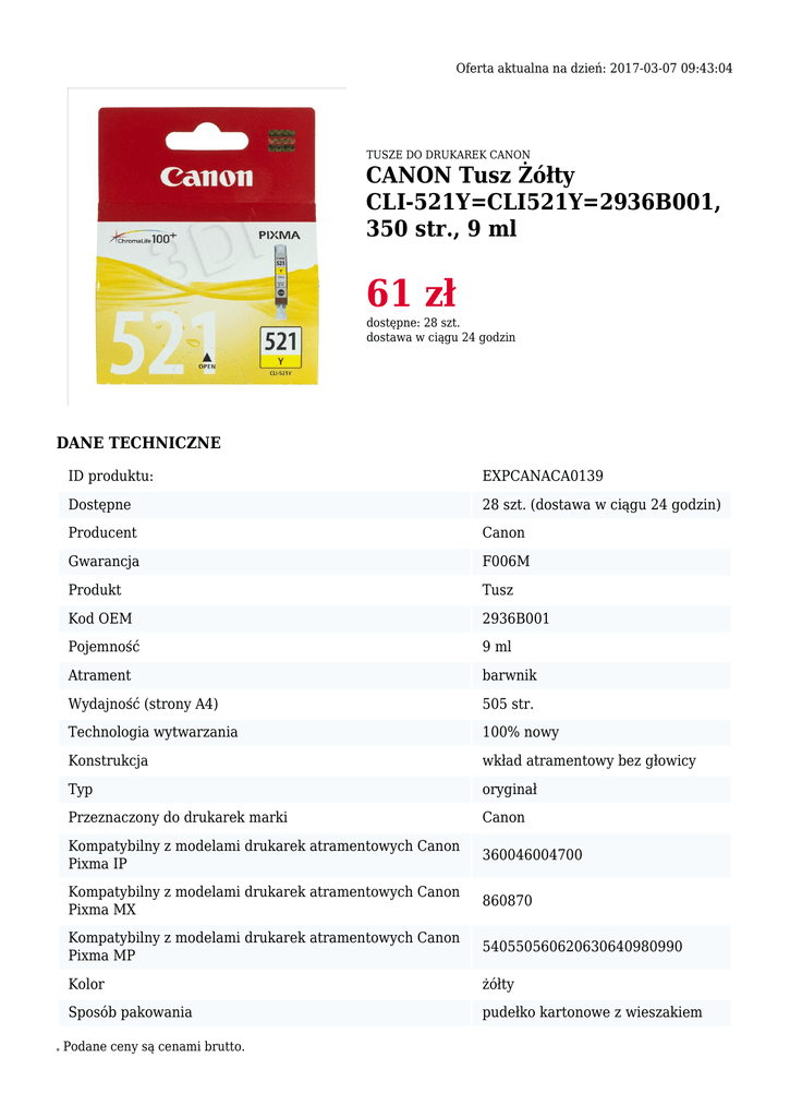 Oferta aktualna na dzień: 2017-03-07 09:43:04 TUSZE DO DRUKAREK CANON CANON Tusz Żółty CLI-521Y=CLI521Y=2936B001, 350 str., 9 ml 61 zł dostępne: 28 szt. dostawa w ciągu 24 godzin DANE TECHNICZNE * ID produktu: EXPCANACA0139 Dostępne 28 szt. (dostawa w ciągu 24 godzin) Producent Canon Gwarancja F006M Produkt Tusz Kod OEM 2936B001 Pojemność 9 ml Atrament barwnik Wydajność (strony A4) 505 str. Technologia wytwarzania 100% nowy Konstrukcja wkład atramentowy bez głowicy Typ oryginał Przeznaczony do drukarek marki Canon Kompatybilny z modelami drukarek atramentowych Canon Pixma IP 360046004700 Kompatybilny z modelami drukarek atramentowych Canon Pixma MX 860870 Kompatybilny z modelami drukarek atramentowych Canon Pixma MP 540550560620630640980990 Kolor żółty Sposób pakowania pudełko kartonowe z wieszakiem Podane ceny są cenami brutto. Mimo dołożenia wszelkich starań nie gwarantujemy, że publikowane dane techniczne nie zawierają uchybień lub błędów. Ewentualne błędne opisy nie mogą być podstawą do roszczeń, dlatego w przypadku jakichkolwiek wątpliwości prosimy przed podjęciem decyzji o zakupie o kontakt z handlowcem. ** GALERIA