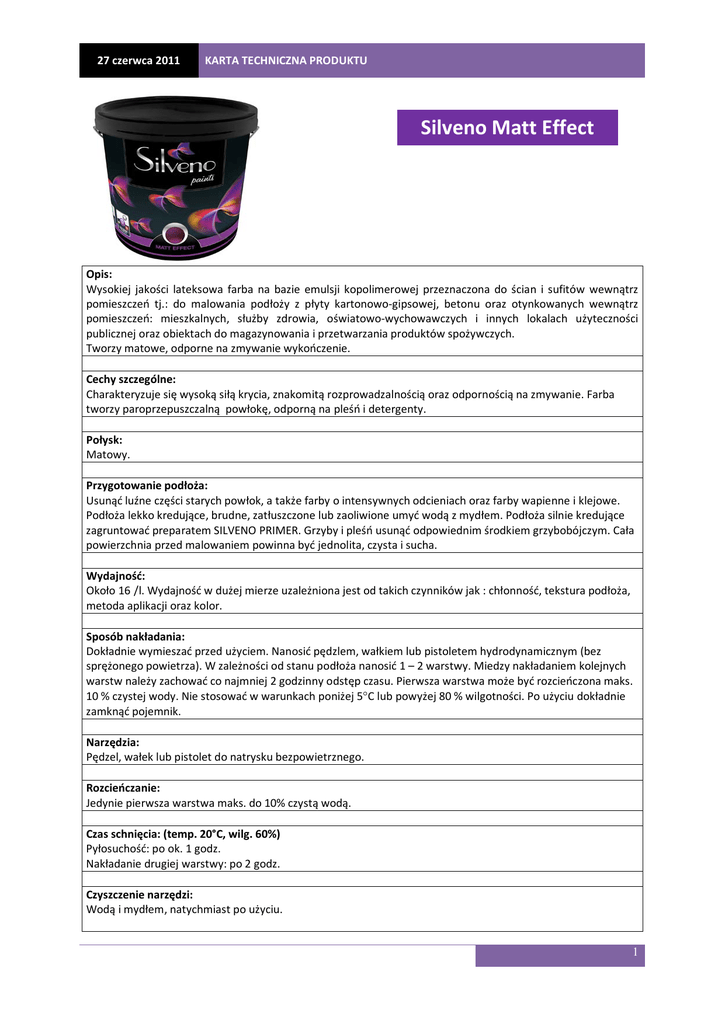 27 czerwca 2011 KARTA TECHNICZNA PRODUKTU Silveno Matt Effect Opis: Wysokiej jakości lateksowa farba na bazie emulsji kopolimerowej przeznaczona do ścian i sufitów wewnątrz pomieszczeń tj.: do malowania podłoży z płyty kartonowo-gipsowej, betonu oraz otynkowanych wewnątrz pomieszczeń: mieszkalnych, służby zdrowia, oświatowo-wychowawczych i innych lokalach użyteczności publicznej oraz obiektach do magazynowania i przetwarzania produktów spożywczych. Tworzy matowe, odporne na zmywanie wykończenie. Cechy szczególne: Charakteryzuje się wysoką siłą krycia, znakomitą rozprowadzalnością oraz odpornością na zmywanie. Farba tworzy paroprzepuszczalną powłokę, odporną na pleśń i detergenty. Połysk: Matowy. Przygotowanie podłoża: Usunąć luźne części starych powłok, a także farby o intensywnych odcieniach oraz farby wapienne i klejowe. Podłoża lekko kredujące, brudne, zatłuszczone lub zaoliwione umyć wodą z mydłem. Podłoża silnie kredujące zagruntować preparatem SILVENO PRIMER. Grzyby i pleśń usunąć odpowiednim środkiem grzybobójczym. Cała powierzchnia przed malowaniem powinna być jednolita, czysta i sucha. Wydajność: Około 16 /l. Wydajność w dużej mierze uzależniona jest od takich czynników jak : chłonność, tekstura podłoża, metoda aplikacji oraz kolor. Sposób nakładania: Dokładnie wymieszać przed użyciem. Nanosić pędzlem, wałkiem lub pistoletem hydrodynamicznym (bez sprężonego powietrza). W zależności od stanu podłoża nanosić 1 – 2 warstwy. Miedzy nakładaniem kolejnych warstw należy zachować co najmniej 2 godzinny odstęp czasu. Pierwsza warstwa może być rozcieńczona maks. 10 % czystej wody. Nie stosować w warunkach poniżej 5°C lub powyżej 80 % wilgotności. Po użyciu dokładnie zamknąć pojemnik. Narzędzia: Pędzel, wałek lub pistolet do natrysku bezpowietrznego. Rozcieńczanie: Jedynie pierwsza warstwa maks. do 10% czystą wodą. Czas schnięcia: (temp. 20°C, wilg. 60%) Pyłosuchość: po ok. 1 godz. Nakładanie drugiej warstwy: po 2 godz. Czyszczenie narzędzi: Wodą i mydłem, natychmiast po użyciu. 1 27 czerwca 2011 KARTA TECHNICZNA PRODUKTU Silveno Matt Effect Przechowywanie: Przechowywać i transportować w szczelnie zamkniętych pojemnikach, w temp. powyżej 5°C.W celu uzyskania szczegółowych informacji należy zapoznać się z kartą techniczną produktu. Trwałość: Minimum 3 lata od daty produkcji, w nie otwieranych pojemnikach. Pojemność: Biała: 0,75l; 2,5l; 5l; 10l. Baza 10, 20 lub 30: 0,75l; 2,25l; 4,5l; 9l Dodatkowe informacje: W przypadku użycia wyrobu niezgodnie z zaleceniami, producent nie ponosi odpowiedzialności. Wyrób zgodny z PN – C – 81914:2002 Produkt posiada Atest PZH Wartość graniczna LZO w g/l dla tego produktu (kat.a, pkt.1): 30g/l (2010). Produkt ten zawiera maks. 1g/l LZO. Wyprodukowano w Unii Europejskiej dla Konsorcjum Handlowego „STOFARB” S.A ul. Gościnna 1 41-500 Chorzów Polska, tel. 32 241-69-77 www.silveno.pl 2