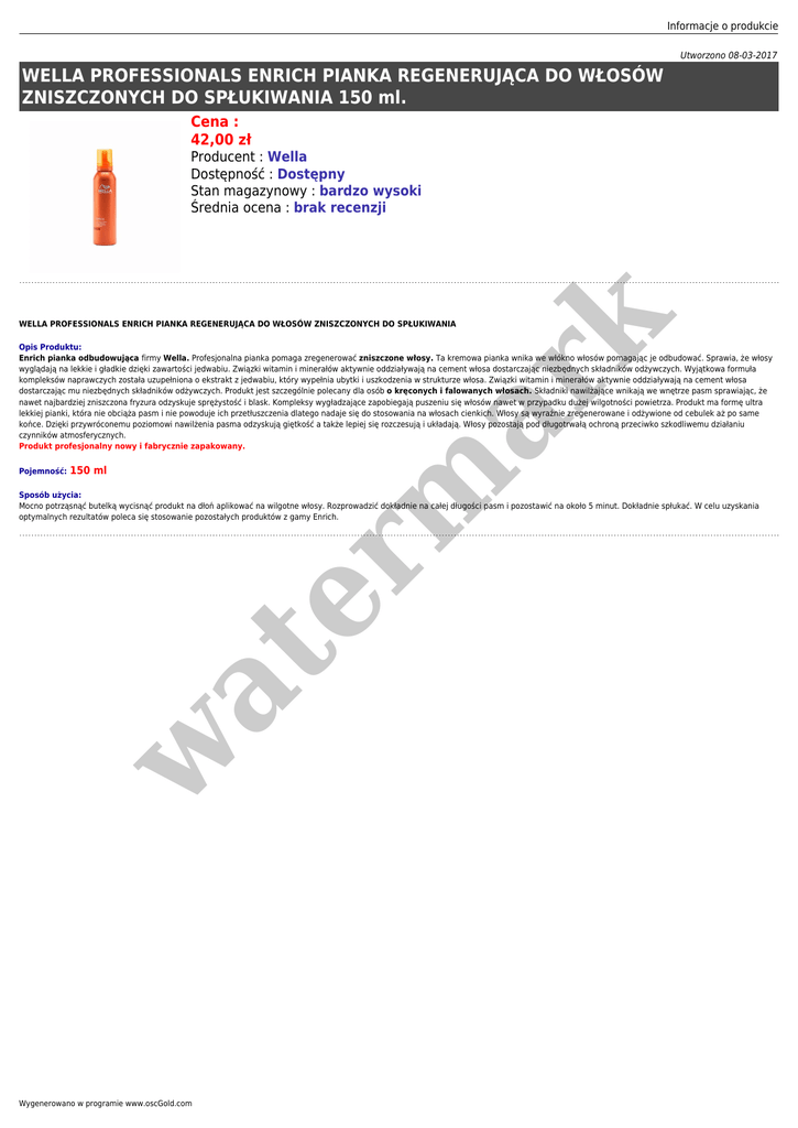 Informacje o produkcie Utworzono 08-03-2017 WELLA PROFESSIONALS ENRICH PIANKA REGENERUJĄCA DO WŁOSÓW ZNISZCZONYCH DO SPŁUKIWANIA 150 ml. Cena : 42,00 zł er m ar k Producent : Wella Dostępność : Dostępny Stan magazynowy : bardzo wysoki Średnia ocena : brak recenzji WELLA PROFESSIONALS ENRICH PIANKA REGENERUJĄCA DO WŁOSÓW ZNISZCZONYCH DO SPŁUKIWANIA Opis Produktu: Enrich pianka odbudowująca firmy Wella. Profesjonalna pianka pomaga zregenerować zniszczone włosy. Ta kremowa pianka wnika we włókno włosów pomagając je odbudować. Sprawia, że włosy wyglądają na lekkie i gładkie dzięki zawartości jedwabiu. Związki witamin i minerałów aktywnie oddziaływają na cement włosa dostarczając niezbędnych składników odżywczych. Wyjątkowa formuła kompleksów naprawczych została uzupełniona o ekstrakt z jedwabiu, który wypełnia ubytki i uszkodzenia w strukturze włosa. Związki witamin i minerałów aktywnie oddziaływają na cement włosa dostarczając mu niezbędnych składników odżywczych. Produkt jest szczególnie polecany dla osób o kręconych i falowanych włosach. Składniki nawilżające wnikają we wnętrze pasm sprawiając, że nawet najbardziej zniszczona fryzura odzyskuje sprężystość i blask. Kompleksy wygładzające zapobiegają puszeniu się włosów nawet w przypadku dużej wilgotności powietrza. Produkt ma formę ultra lekkiej pianki, która nie obciąża pasm i nie powoduje ich przetłuszczenia dlatego nadaje się do stosowania na włosach cienkich. Włosy są wyraźnie zregenerowane i odżywione od cebulek aż po same końce. Dzięki przywróconemu poziomowi nawilżenia pasma odzyskują giętkość a także lepiej się rozczesują i układają. Włosy pozostają pod długotrwałą ochroną przeciwko szkodliwemu działaniu czynników atmosferycznych. Produkt profesjonalny nowy i fabrycznie zapakowany. Pojemność: 150 ml w at Sposób użycia: Mocno potrząsnąć butelką wycisnąć produkt na dłoń aplikować na wilgotne włosy. Rozprowadzić dokładnie na całej długości pasm i pozostawić na około 5 minut. Dokładnie spłukać. W celu uzyskania optymalnych rezultatów poleca się stosowanie pozostałych produktów z gamy Enrich. Wygenerowano w programie www.oscGold.com