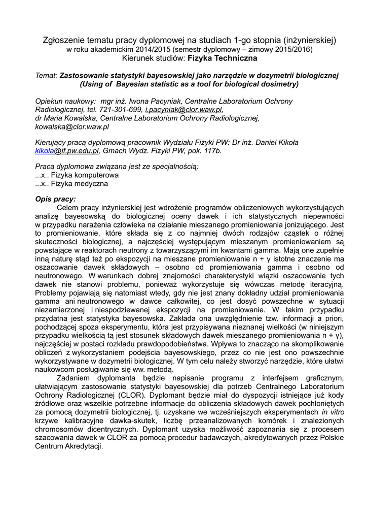 Zgłoszenie tematu pracy dyplomowej na studiach 1-go stopnia (inżynierskiej) w roku akademickim 2014/2015 (semestr dyplomowy – zimowy 2015/2016) Kierunek studiów: Fizyka Techniczna Temat: Zastosowanie statystyki bayesowskiej jako narzędzie w dozymetrii biologicznej (Using of Bayesian statistic as a tool for biological dosimetry) Opiekun naukowy: mgr inż. Iwona Pacyniak, Centralne Laboratorium Ochrony Radiologicznej, tel. 721-301-699, [email protected], dr Maria Kowalska, Centralne Laboratorium Ochrony Radiologicznej, [email protected] Kierujący pracą dyplomową pracownik Wydziału Fizyki PW: Dr inż. Daniel Kikoła [email protected], Gmach Wydz. Fizyki PW, pok. 117b. Praca dyplomowa związana jest ze specjalnością: ...x.. Fizyka komputerowa ...x.. Fizyka medyczna Opis pracy: Celem pracy inżynierskiej jest wdrożenie programów obliczeniowych wykorzystujących analizę bayesowską do biologicznej oceny dawek i ich statystycznych niepewności w przypadku narażenia człowieka na działanie mieszanego promieniowania jonizującego. Jest to promieniowanie, które składa się z co najmniej dwóch rodzajów cząstek o różnej skuteczności biologicznej, a najczęściej występującym mieszanym promieniowaniem są powstające w reaktorach neutrony z towarzyszącymi im kwantami gamma. Mają one zupełnie inną naturę stąd też po ekspozycji na mieszane promieniowanie n + γ istotne znaczenie ma oszacowanie dawek składowych – osobno od promieniowania gamma i osobno od neutronowego. W warunkach dobrej znajomości charakterystyki wiązki oszacowanie tych dawek nie stanowi problemu, ponieważ wykorzystuje się wówczas metodę iteracyjną. Problemy pojawiają się natomiast wtedy, gdy nie jest znany dokładny udział promieniowania gamma ani neutronowego w dawce całkowitej, co jest dosyć powszechne w sytuacji niezamierzonej i niespodziewanej ekspozycji na promieniowanie. W takim przypadku przydatna jest statystyka bayesowska. Zakłada ona uwzględnienie tzw. informacji a priori, pochodzącej spoza eksperymentu, która jest przypisywana nieznanej wielkości (w niniejszym przypadku wielkością tą jest stosunek składowych dawek mieszanego promieniowania n + γ), najczęściej w postaci rozkładu prawdopodobieństwa. Wpływa to znacząco na skomplikowanie obliczeń z wykorzystaniem podejścia bayesowskiego, przez co nie jest ono powszechnie wykorzystywane w dozymetrii biologicznej. W tym celu należy stworzyć narzędzie, które ułatwi naukowcom posługiwanie się ww. metodą. Zadaniem dyplomanta będzie napisanie programu z interfejsem graficznym, ułatwiającym zastosowanie statystyki bayesowskiej dla potrzeb Centralnego Laboratorium Ochrony Radiologicznej (CLOR). Dyplomant będzie miał do dyspozycji istniejące już kody źródłowe oraz wszelkie potrzebne informacje do obliczenia składowych dawek pochłoniętych za pomocą dozymetrii biologicznej, tj. uzyskane we wcześniejszych eksperymentach in vitro krzywe kalibracyjne dawka-skutek, liczbę przeanalizowanych komórek i znalezionych chromosomów dicentrycznych. Dyplomant uzyska możliwość zapoznania się z procesem szacowania dawek w CLOR za pomocą procedur badawczych, akredytowanych przez Polskie Centrum Akredytacji. Problem inżynierski z zakresu fizyki technicznej, którego rozwiązanie ma opracować dyplomant: 1. Stworzenie programu z interfejsem graficznym, ułatwiającego zastosowanie statystyki bayesowskiej do obliczenia składowych dawek pochłoniętych promieniowania n + γ. Dyplomant będzie miał możliwość wykorzystania istniejących kodów źródłowych stworzonych w CLOR. Środowisko programistyczne (C++, C#, Java …) do uzgodnienia z opiekunem pracy. 2. Wykonanie obliczeń oraz porównanie otrzymanych wartości dawek pochłoniętych z dawkami rzeczywistymi. Uwagi: 1. Wymagana jest umiejętność programowania i znajomość podstawowych zagadnień związanych ze statystyką. 2. Możliwa jest publikacja wyników uzyskanych podczas realizacji pracy. Bibliografia: [1] Pacyniak I., Fornalski K.W., Kowalska M. 'Employment of Bayesian and Monte Carlo methods for biological dose assessment following accidental overexposures of people to nuclear reactor radiation'. Konferencja: The Second International Conference on Radiation and Dosimetry in Various Fields of Research (RAD 2014), Uniwersytet w Nisz (Serbia), 27-30.05.2014, pp. 49-52 [2] Fornalski K.W. 'Alternative statistical methods for cytogenetic radiation biological dosimetry'. Cornell University Library, arXiv.org/abs/1412.2048, 2014