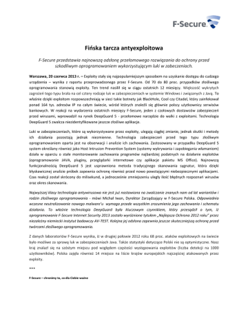 Fińska tarcza antyexploitowa F-Secure przedstawia najnowszą odsłonę przełomowego rozwiązania do ochrony przed szkodliwym oprogramowaniem wykorzystującym luki w zabeczeniach. Warszawa, 20 czerwca 2013 r. – Exploity stały się najpopularniejszym sposobem na uzyskanie dostępu do cudzego urządzenia – wynika z raportu przeprowadzonego przez F-Secure. Od 70 do 80 proc. przypadków złośliwego oprogramowania stanowią exploity. Ten trend nasilił się w ciągu ostatnich 12 miesięcy. Większość wykrytych zagrożeń tego typu brała na cel cztery rodzaje luk w zabezpieczeniach w systemie Windows i związanych z Javą. To właśnie dzięki exploitom rozpowszechniają w sieci takie botnety jak BlackHole, Cool czy Citadel, który zainfekował ponad 164 tys. adresów IP na całym świecie, wśród których znaleźli się głównie polscy użytkownicy serwisów bankowych. W reakcji na wydarzenia ostatnich miesięcy F-Secure, jeden z czołowych dostawców zabezpieczeń przed wirusami, wprowadził na rynek DeepGuard 5 - przełomowe narzędzie do walki z exploitami. Technologia DeepGuard 5 zwalcza niezidentyfikowane jeszcze złośliwe aplikacje. Luki w zabezpieczeniach, które są wykorzystywane przez exploity, ulegają ciągłej zmianie, jednak skutki i metody ich działania pozostają jednak niezmienne. Technologia zabezpieczeń przed tego typu złośliwym oprogramowaniem oparta jest na obserwacji i analizie ich zachowania. Zastosowany w przypadku DeepGuard 5 system określany również jako Host Intrusion Prevention System (systemy wykrywania i zapobiegania włamaniom) działa w oparciu o stałe monitorowanie zachowania programów najbardziej podatnych na działanie exploitów (oprogramowanie JAVA, pluginy, przeglądarki internetowe czy aplikacje pakietu MS Office). Najnowszą funkcjonalnością DeepGuard 5 jest usprawniona metoda tradycyjnego skanowania sygnatur, która dzięki błyskawicznej analizie próbek zapewnia ochronę również przed nowo powstającymi niebezpiecznymi aplikacjami. Czas reakcji został skrócony do milisekund, a jednocześnie zmniejszeniu uległy ilość błędnych rozpoznań wirusów oraz okres skanowania. Najwyższej klasy technologia antywirusowa nie jest już nastawiona na zwalczanie znanych nam od lat wariantów i rodzin złośliwego oprogramowania - mówi Michał Iwan, Dyrektor Zarządzający w F-Secure Polska. Odpowiednio wczesne neutralizowanie nowego malware’u wymaga przede wszystkim zrozumienia jego zachowania i schematu działania. To właśnie technologia DeepGuard była kluczowym czynnikiem, który przesądził o tym, iż oprogramowanie F-Secure Internet Security 2013 zostało wyróżnione tytułem „Najlepsza Ochrona 2012 roku” przez niezależny niemiecki instytut badawczy AV-TEST. Kolejna jej odsłona zapewnia jeszcze skuteczniejszą ochronę przed twórcami złośliwego oprogramowania. Z danych laboratoriów F-Secure wynika, iż w drugiej połowie 2012 roku 68 proc. ataków exploitowych na świecie było możliwe za sprawą luk w zabezpieczeniach Java. Także statystyki dotyczące Polski nie są optymistyczne. Nasz kraj znalazł się na szóstym miejscu pod względem częstości występowania exploitów (liczba detekcji na 1000 użytkowników). Polska zajęła również 14 miejsce na liście krajów europejskich najczęściej atakowanych przez exploity. *** F-Secure – chronimy to, co dla Ciebie ważne Kiedy Ty koncentrujesz się na tym co dla Ciebie ważne i przyjemne, my zajmujemy się ochroną i zapewniamy Ci pełne bezpieczeństwo podczas korzystania z sieci. Dodatkowo robimy backup Twoich cennych plików, a także uniemożliwiamy kradzież poufnych informacji. Firma F-Secure jest znana z częstych aktualizacji automatycznych, natychmiastowego czasu reakcji i szybkiego zwalczania nowych i pojawiających się zagrożeń. Jakość gwarantują Laboratoria F-Secure, działające 24 godziny na dobę na całym świecie. Nasze usługi są dostępne u ponad 200 operatorów na całym świecie. Zaufały nam miliony użytkowników i firm. Korporacja F-Secure została założona w 1988 r. i jest notowana na giełdzie w Helsinkach. Więcej informacji o nas na stronie www.f-secure.com lub www.f-secure.pl oraz na naszym profilu na Facebooku: facebook.com/pages/F-Secure-Polska. Dodatkowych informacji udzielają: Maciej Parol Vision Group [email protected] kom. 604 442 900 f-secure.com | twitter.com/fsecure | facebook.com/pages/F-Secure-Polska Sebastian Bazylak F-Secure Corporation [email protected] kom. 669 112 115