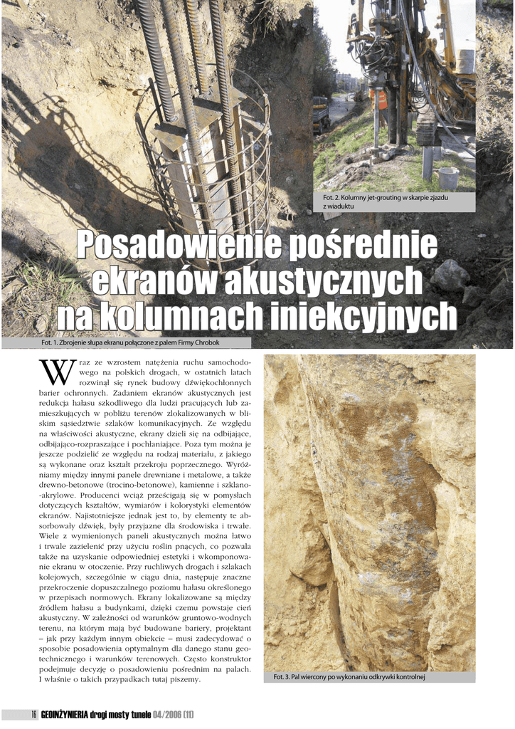 geoinżynieria geoinżynieria Fot. 2. Kolumny jet-grouting w skarpie zjazdu z wiaduktu Posadowienie pośrednie ekranów akustycznych na kolumnach iniekcyjnych Fot. 1. Zbrojenie słupa ekranu połączone z palem Firmy Chrobok W raz ze wzrostem natężenia ruchu samochodowego na polskich drogach, w ostatnich latach rozwinął się rynek budowy dźwiękochłonnych barier ochronnych. Zadaniem ekranów akustycznych jest redukcja hałasu szkodliwego dla ludzi pracujących lub zamieszkujących w pobliżu terenów zlokalizowanych w bliskim sąsiedztwie szlaków komunikacyjnych. Ze względu na właściwości akustyczne, ekrany dzieli się na odbijające, odbijająco-rozpraszające i pochłaniające. Poza tym można je jeszcze podzielić ze względu na rodzaj materiału, z jakiego są wykonane oraz kształt przekroju poprzecznego. Wyróżniamy między innymi panele drewniane i metalowe, a także drewno-betonowe (trocino-betonowe), kamienne i szklano-akrylowe. Producenci wciąż prześcigają się w pomysłach dotyczących kształtów, wymiarów i kolorystyki elementów ekranów. Najistotniejsze jednak jest to, by elementy te absorbowały dźwięk, były przyjazne dla środowiska i trwałe. Wiele z wymienionych paneli akustycznych można łatwo i trwale zazielenić przy użyciu roślin pnących, co pozwala także na uzyskanie odpowiedniej estetyki i wkomponowanie ekranu w otoczenie. Przy ruchliwych drogach i szlakach kolejowych, szczególnie w ciągu dnia, następuje znaczne przekroczenie dopuszczalnego poziomu hałasu określonego w przepisach normowych. Ekrany lokalizowane są między źródłem hałasu a budynkami, dzięki czemu powstaje cień akustyczny. W zależności od warunków gruntowo-wodnych terenu, na którym mają być budowane bariery, projektant – jak przy każdym innym obiekcie – musi zadecydować o sposobie posadowienia optymalnym dla danego stanu geotechnicznego i warunków terenowych. Często konstruktor podejmuje decyzję o posadowieniu pośrednim na palach. I właśnie o takich przypadkach tutaj piszemy. 16 GEOINŻYNIERIA drogi mosty tunele 04/2006 (11) Fot. 3. Pal wiercony po wykonaniu odkrywki kontrolnej geoinżynieria geoinżynieria Inwestycją, w ramach której Firma Chrobok wykonała pośrednie posadowienie fundamentów pod ekrany w postaci par mikropali o długości od 4 m do 10 m, była budowa barier akustycznych wzdłuż DK 1 w Czechowicach–Dziedzicach, realizowana w dwóch etapach: pierwszy – w grudniu 2005 r. oraz drugi – w październiku 2006 r. Łącznie na obu odcinkach o długości prawie 2 km w rozstawie co 4 m wykonaliśmy 6.534 mb mikropali iniekcyjnych o średnicy 182 mm, zbrojonych rurą stalową φ 76,1 x 8 mm, w tym: – długości 10 m – 515 szt., – długości 9 m – 8 szt., – długości 8 m – 72 szt., – długości 7 m – 12 szt., – długości 6 m – 18 szt., – długości 5 m – 16 szt., – długości 4 m – 116 szt. Wykonane pale połączone zostały ze sobą w oczepie fundamentowym o przekroju kwadratowym 0,5 x 0,5 m, posadowionym na głębokości 0,55 m poniżej poziomu gruntu. Roboty wykonano w obu etapach w bardzo krótkim okresie. Maksymalne skrócenie czasu realizacji było niezbędne z uwagi na konieczność zamknięcia pasa drogowego (utrudnienia w ruchu, kilkukilometrowe korki na drodze – ekrany buduje się zazwyczaj przy drogach klasy G) i opłaty związane z zajęciem terenu. Do iniekcji wykorzystaliśmy zestaw składający się z wiertnicy KLEMM KR806, pompy wysokociśnieniowej Halliburton HT400 oraz mieszalnika MP18. Ze względu na występowanie w rejonie robót wody o charakterze agresywnym w stosunku do betonu, iniekt był modyfikowany, by uodpornić go na działanie wody. Inną inwestycją, w której braliśmy udział jesienią tego roku, była budowa ekranów akustycznych wzdłuż DK-86 na odcinku ekspresowym w rejonie ul. Pogodnej i Zimowej w Katowicach. Prace związane z fundamentami pośrednimi pierwszego etapu w nasypach stanowiących dojazdy do wiaduktu były wykonane w technologii iniekcji strumieniowej jet-grouting. Z poziomu terenu wykonano odwiert przy użyciu korony wiertniczej osadzonej na żerdzi, a następnie formowano kolumnę zaczynem cementowym na bazie cementu CEM 32,5. Po uformowaniu kolumny zabudowano przy użyciu wibromłota zbrojenie sztywne (dwuteownik IPE240), kontrolując położenie profilu w planie. Na odcinku drugim i trzecim, w związku z występowaniem w tym rejonie gruntów zwartych (włącznie z przewarstwieniami piaskowca), nie dających gwarancji właściwego uformowania kolumn w technologii iniekcji strumieniowej jet-grouting - po konsultacji z projektantem – zmodyfikowano technologię na pale wiercone mechanicznie. Odwierty przy użyciu głowic do gruntów skalistych wykonano za pomocą wiertnicy ABI MDBA 3000 na podwoziu samojezdnym typ TM 12/15. Po wywierceniu otworu na żądaną rzędną i potwierdzeniu prawidłowości wykonanego odwiertu następowało formowanie pala przy użyciu betonu klasy B25 wraz z zabudową zbrojenia sztywnego (dwuteownik IPE240). Dla tej inwestycji wykonaliśmy 92 szt. pali o długości 8 m oraz 128 szt. pali długości 6 m i średnicy 508 mm, łącznie 1.504 mb. Zapewne dziwi Państwa, że Firma Chrobok znana z zabezpieczeń wykopów i robót przewiertowych, wciąż dywersyfikuje swoją działalność, ale chcąc umacniać pozycję na rynku trzeba poznawać i wdrażać nowe technologie i rozwiązania. autor mgr Magdalena Berkop, mgr Zuzanna Palka Firma CHROBOK Fot. 4. Zbrojenie kolumny przed rozkuciem główki pala Fot. 5. Z lewej strony zabudowa zbrojenia przy użyciu wibromłota, z prawej – wykonywanie kolumny jet-grouting Fot. 6. Ciąg technologiczny GEOINŻYNIERIA drogi mosty tunele 04/2006 (11) 17