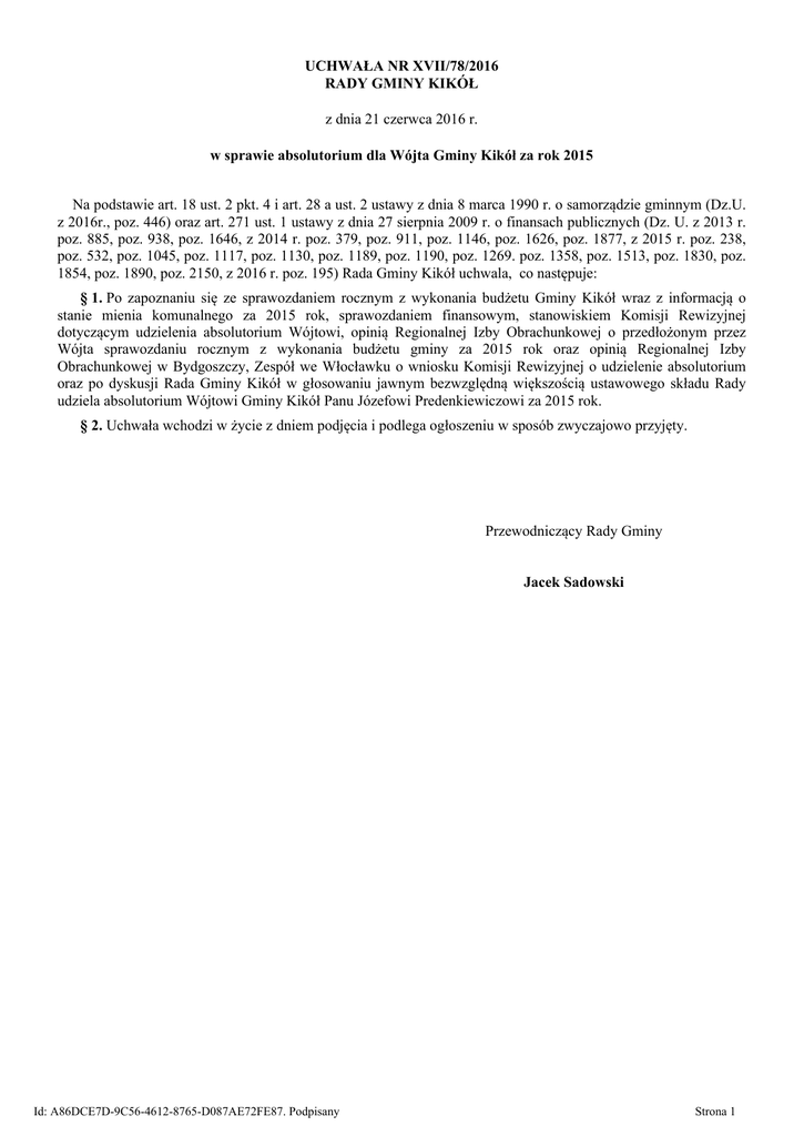 UCHWAŁA NR XVII/78/2016 RADY GMINY KIKÓŁ z dnia 21 czerwca 2016 r. w sprawie absolutorium dla Wójta Gminy Kikół za rok 2015 Na podstawie art. 18 ust. 2 pkt. 4 i art. 28 a ust. 2 ustawy z dnia 8 marca 1990 r. o samorządzie gminnym (Dz.U. z 2016r., poz. 446) oraz art. 271 ust. 1 ustawy z dnia 27 sierpnia 2009 r. o finansach publicznych (Dz. U. z 2013 r. poz. 885, poz. 938, poz. 1646, z 2014 r. poz. 379, poz. 911, poz. 1146, poz. 1626, poz. 1877, z 2015 r. poz. 238, poz. 532, poz. 1045, poz. 1117, poz. 1130, poz. 1189, poz. 1190, poz. 1269. poz. 1358, poz. 1513, poz. 1830, poz. 1854, poz. 1890, poz. 2150, z 2016 r. poz. 195) Rada Gminy Kikół uchwala, co następuje: § 1. Po zapoznaniu się ze sprawozdaniem rocznym z wykonania budżetu Gminy Kikół wraz z informacją o stanie mienia komunalnego za 2015 rok, sprawozdaniem finansowym, stanowiskiem Komisji Rewizyjnej dotyczącym udzielenia absolutorium Wójtowi, opinią Regionalnej Izby Obrachunkowej o przedłożonym przez Wójta sprawozdaniu rocznym z wykonania budżetu gminy za 2015 rok oraz opinią Regionalnej Izby Obrachunkowej w Bydgoszczy, Zespół we Włocławku o wniosku Komisji Rewizyjnej o udzielenie absolutorium oraz po dyskusji Rada Gminy Kikół w głosowaniu jawnym bezwzględną większością ustawowego składu Rady udziela absolutorium Wójtowi Gminy Kikół Panu Józefowi Predenkiewiczowi za 2015 rok. § 2. Uchwała wchodzi w życie z dniem podjęcia i podlega ogłoszeniu w sposób zwyczajowo przyjęty. Przewodniczący Rady Gminy Jacek Sadowski Id: A86DCE7D-9C56-4612-8765-D087AE72FE87. Podpisany Strona 1 Uzasadnienie Komisja Rewizyjna Rady Gminy Kikół po rozpatrzeniu sprawozdania Wójta Gminy za 2015 rok i sprawozdania finansowego oraz po zapoznaniu się z opinią Regionalnej Izby Obrachunkowej pozytywnie oceniła wykonanie budżetu, co zostało zawarte w uchwale Komisji Rewizyjnej Nr 1/2016 z dnia 24 maja 2016 r. i opinii stanowiącej Złącznik Nr 1 do tej uchwały. Regionalna Izba Obrachunkowa po otrzymaniu sprawozdania z wykonania budżetu za 2015 rok wraz z załącznikami i uchwały Komisji Rewizyjnej zaopiniowała w/w pozytywnie. Przewodniczący Rady Gminy Jacek Sadowski Id: A86DCE7D-9C56-4612-8765-D087AE72FE87. Podpisany Strona 1