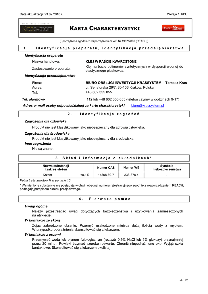 Data aktualizacji: 23.02.2010 r. Wersja 1.1/PL KARTA CHARAKTERYSTYKI [Sporządzona zgodnie z rozporządzeniem WE Nr 1907/2006 (REACH)] 1. Identyfikacja preparatu, Identyfikacja przedsiębiorstwa Identyfikacja preparatu Nazwa handlowa: KLEJ W PAŚCIE KWARCSTONE Zastosowanie preparatu: Klej na bazie polimerów syntetycznych w dyspersji wodnej do elastycznego piaskowca. Identyfikacja przedsiębiorstwa BIURO OBSŁUGI INWESTYCJI KRASSYSTEM – Tomasz Kras ul. Senatorska 26/7, 30-106 Kraków, Polska +48 602 355 055 Firma: Adres: Tel. 112 lub +48 602 355 055 (telefon czynny w godzinach 9-17) Tel. alarmowy Adres e- mail osoby odpowiedzialnej za kartę charakterystyki 2. [email protected] Identyfikacja zagrożeń Zagrożenia dla człowieka Produkt nie jest klasyfikowany jako niebezpieczny dla zdrowia człowieka. Zagrożenia dla środowiska Produkt nie jest klasyfikowany jako niebezpieczny dla środowiska. Inne zagrożenia Nie są znane. 3. Skład i informacja o składnikach* Nazwa substancji i zakres stężeń Krzem <0,1% Numer CAS Numer WE Symbole niebezpieczeństwa 14808-60-7 238-878-4 - Pełna treść zwrotów R w punkcie 16 * Wymienione substancje nie posiadają w chwili obecnej numeru rejestracyjnego zgodnie z rozporządzeniem REACH, podlegają przepisom okresu przejściowego. 4. Pierwsza pomoc Uwagi ogólne Należy przestrzegać uwag dotyczących bezpieczeństwa i użytkowania zamieszczonych na etykiecie. W kontakcie ze skórą Zdjąć zabrudzone ubranie. Przemyć uszkodzone miejsca dużą ilością wody z mydłem. W przypadku podrażnienia skonsultować się z lekarzem. W kontakcie z oczami Przemywać wodą lub płynem fizjologicznym (roztwór 0,9% NaCl lub 5% glukozy) przynajmniej przez 20 minut. Powieki trzymać szeroko rozwarte. Chronić niepodrażnione oko. Wyjąć szkła kontaktowe. Skonsultować się z lekarzem okulistą. str. 1/6 KARTA CHARAKTERYSTYKI Nazwa handlowa: Identyfikacja przedsiębiorstwa: Adres: Telefon: Data aktualizacji: KLEJ NA SPECJALNE PODŁOŻA – ŻYWICA KWARCSTONE BIURO OBSŁUGI INWESTYCJI KRASSYSTEM – Tomasz Kras ul. Senatorska 26/7, 30-106 Kraków, Polska +48 602 355 055 23.02.2010 r. Wersja: 1.1/PL W przypadku spożycia Podać do wypicia dużą ilość wody. Zasięgnąć porady lekarza, pokazać opakowanie lub etykietę. Po narażeniu drogą oddechową Wyprowadzić poszkodowaną osobę ze skażonego pomieszczenia i przenieść na świeże powietrze. Zapewnić ciepło i spokój. W razie potrzeby wykonać sztuczne oddychanie lub podać tlen. W przypadku wystąpienia niepokojących objawów skonsultować się z lekarzem. 5. Postępowanie w przypadku pożaru Odpowiednie środki gaśnicze CO2, proszek gaśniczy, piana, rozpylony strumień wody. Nieodpowiednie środki gaśnicze Zwarty strumień wody – ryzyko rozprzestrzeniania się pożaru. Uwagi dodatkowe Środki ochrony ogólnej typowe w przypadku pożaru. Nie należy przebywać w zagrożonej ogniem strefie bez odpowiedniego ubrania odpornego na chemikalia oraz aparatu do oddychania z niezależnym obiegiem powietrza. Nie należy dopuścić do przedostania się wody gaśniczej do kanalizacji, wód powierzchniowych i gruntowych. Uwaga! Produkt po odparowaniu zawartej w nim wody tworzy masę polimeru, która może ulec zapaleniu. Palne są również odpady skoagulowanego produktu. 6. Po st ęp o w an ie w p r z yp ad ku n i ez am ie rz o n e g o u w o ln i en i a d o ś ro d o w isk a Indywidualne środki ostrożności Przestrzegać przepisów prawnych w zakresie ochrony i bezpieczeństwa. Zakładać odzież ochronną. Patrz także pkt 8 karty. Niezbędne środki w zakresie ochrony środowiska Należy poczynić odpowiednie kroki w celu niedopuszczenia do rozprzestrzenienia się w środowisku naturalnym. W przypadku poważnej awarii wezwać odpowiednie służby ratownicze. Metody oczyszczania/wchłaniania Produkt zebrać za pomocą materiałów wchłaniajacych ciecze (np. piasek, ziemia, uniwersalne substancje wiążące, krzemionka, trociny itp.) i umieścić w kontenerach na odpady. Zebrany materiał potraktować jak odpady i dalej postępować wg pkt 13. Oczyścić skażone miejsce. 7. Postępowanie z preparatem i jego magazynowanie Postępowanie z produktem Przestrzegać przepisów prawnych w zakresie ochrony i bezpieczeństwa. Unikać kontaktu ze skórą i oczami. Pracować tylko w dobrze wentylowanych pomieszczeniach. Nie wdychać par. Magazynowanie Przechowywać w temperaturze pokojowej, suchych i dobrze wentylowanych miejscach, w szczelnie zamkniętych, oryginalnych opakowaniach producenta. Czas przechowywania preparatu 365 dni. Specyficzne zastosowania Klej. 8. Kontrola narażania i środki ochrony indywidualnej Wartości graniczne narażania Krzem krystaliczny – NDS 2 mg/m3 str. 2/6 KARTA CHARAKTERYSTYKI Nazwa handlowa: Identyfikacja przedsiębiorstwa: Adres: Telefon: Data aktualizacji: KLEJ NA SPECJALNE PODŁOŻA – ŻYWICA KWARCSTONE BIURO OBSŁUGI INWESTYCJI KRASSYSTEM – Tomasz Kras ul. Senatorska 26/7, 30-106 Kraków, Polska +48 602 355 055 23.02.2010 r. Wersja: 1.1/PL Kontrola narażenia w miejscu pracy Przestrzegać ogólnych zasad bezpieczeństwa i higieny. Unikać kontaktu ze skórą i oczami. Pracować tylko w dobrze wentylowanym pomieszczeniu. Podczas pracy nie jeść, nie pić, nie palić tytoniu oraz nie zażywać leków. Przed przerwą i po pracy należy dokładnie umyć ręce. Ochrona dróg oddechowych – w przypadku niewłaściwej wentylacji stosować ochronę dróg oddechowych. Ochrona rąk i ciała - zalecane rękawice ochronne oraz ubrania ochronne. Materiał, z którego wykonane są rękawice musi być nieprzepuszczalny i odporny na działanie produktu. Wyboru materiału należy dokonać przy uwzględnieniu czasów przebicia, szybkości przenikania i degradacji. Ponadto wybór odpowiednich rękawic nie zależy tylko od materiału, lecz także od innych cech jakościowych i zmienia się w zależności od producenta. Od producenta rękawic należy uzyskać informacje na temat dokł