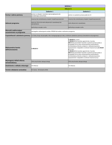 MODUŁ I Obszar A Zadanie 1 Formy i zakres pomocy Adresat programu Warunki wykluczające uczestnictwo w programie Zadanie 2 pomoc w zakupie i montażu oprzyrządowania do posiadanego samochodu pomoc w uzyskaniu prawa jazdy kat. B znaczny lub umiarkowany stopień niepełnosprawności znaczny lub umiarkowany stopień niepełnosprawności wiek do 18 lat lub wiek aktywności zawodowej lub zatrudnienie wiek aktywności zawodowej dysfunkcja narządu ruchu dysfunkcja narządu ruchu wymagalne zobowiązania wobec PFRON lub wobec realizatora programu Częstotliwość udzielania pomocy co 3 lata, licząc od początku roku następującego po roku, w którym udzielono pomocy (niezależnie od programu) Maksymalna kwota dofinansowania 5.000,00 zł 2.100,00 zł, w tym: 1.500,00 zł dla kosztów egzaminów i kursów 600 zł dla pozostałych kosztów uzyskania prawa jazdy w przypadku kursu poza miejscowością zamieszkania wnioskodawcy (koszty związane z zakwaterowaniem, wyżywieniem i dojazdem w okresie trwania kursu)2.100,00 zł, w tym: 1.500,00 zł dla kosztów egzaminów i kursów 600 zł dla pozostałych kosztów uzyskania prawa jazdy w przypadku kursu poza miejscowością zamieszkania wnioskodawcy (koszty związane z zakwaterowaniem, wyżywieniem i dojazdem w okresie trwania kursu) Wymagany wkład własny wnioskodawcy 15% ceny brutto zakupu/usługi 25% ceny brutto zakupu/usługi Zwolnienie z wkładu własnego nie dotyczy nie dotyczy Termin składania wniosków 01 marca - 30 sierpnia 2016 MODUŁ I Obszar B Zadanie 1 Formy i zakres pomocy pomoc w zakupie sprzętu elektronicznego lub jego elementów oraz oprogramowania Zadanie 2 dofinansowanie szkoleń w zakresie obsługi nabytego w ramach programu sprzętu elektornicznego i oprogramowania znaczny stopień niepełnosprawności Adresat programu wiek do 18 lat lub wiek aktywności zawodowej lub zatrudnienie dysfunkcja obu kończyn górnych lub narządu wzroku Warunki wykluczające uczestnictwo w programie wymagalne zobowiązania wobec PFRON lub wobec realizatora programu Częstotliwość udzielania pomocy co 3 lata, licząc od początku roku następującego po roku, w którym udzielono pomocy (niezależnie od programu) 20.000,00 zł dla osoby niewidomej, z czego na urządzenie brajlowskie 12.000,00 zł20.000,00 zł dla osoby niewidomej, z czego na urządzenie brajlowskie 12.000,00 zł Maksymalna kwota dofinansowania Wymagany wkład własny wnioskodawcy Zwolnienie z wkładu własnego Termin składania wniosków 8.000,00 zł dla pozostałych osób z dysfunkcją narządu wzroku8.000,00 zł dla pozostałych osób z dysfunkcją narządu wzroku 4.000,00 zł dla osoby głuchoniewidomej4.000,00 zł dla osoby głuchoniewidomej 5.000,00 zł dla osoby z dysfunkcją obu kończyn górnych5.000,00 zł dla osoby z dysfunkcją obu kończyn górnych 2.000,00 zł dla pozostałych adresatów obszaru2.000,00 zł dla pozostałych adresatów obszaru 10% ceny brutto zakupu/usługi nie dotyczy nie dotyczy nie dotyczy 01 marca - 30 sierpnia 2016 MODUŁ I Obszar C Zadanie 2 Formy i zakres pomocy Zadanie 3 Zadanie 4 pomoc w utrzymaniu sprawności technicznej pomoc w zakupie protezy kończyny, w której pomoc w utrzymaniu sprawności technicznej posiadanej protezy kończyny, w której zastosowano nowoczesne rozwiązania posiadanego wózka inwalidzkiego o napędzie zastosowano nowoczesne rozwiązania techniczne, tj. protezy co najmniej na III elektrycznym techniczne (co najmniej na III poziomie poziomie jakości jakości) stopień niepełnosprawności wiek aktywności zawodowej lub zatrudnienie Adresat programu znaczny stopień o niepełnosprawności potwierdzona opinią eksperta PFRON stabilność procesu chorobowego potwierdzone opinią eksperta PFRON rokowania uzyskania zdolności do pracy w wyniku wsparcia udzielonego w programie Warunki wykluczające uczestnictwo w programie wymagalne zobowiązania wobec PFRON lub wobec realizatora programu Częstotliwość udzielania pomocy po zakończeniu okresu gwarancji co 3 lata, licząc od początku roku następującego po roku, w którym udzielono pomocy (niezależnie od programu) po zakończeniu okresu gwarancji 9.000,00 zł w zakresie ręki9.000,00 zł w zakresie ręki 20.000,00 zł przedramienia20.000,00 zł przedramienia Maksymalna kwota dofinansowania 26.000,00 zł ramienia i wyłuszczeniu w stawie barkowym26.000,00 zł ramienia i wyłuszczeniu w stawie barkowym 2.000,00 zł 14.000,00 zł na poziomie podudzia14.000,00 do 30% kwot zadania C3 zł na poziomie podudzia 20.000,00 zł na wysokości uda (także przez staw kolanowy)20.000,00 zł na wysokości uda (także przez staw kolanowy) 25.000,00 zł uda i wyłuszczeniu w stawie biodrowym Wymagany wkład własny wnioskodawcy Zwolnienie z wkładu własnego Termin składania wniosków nie dotyczy 10% ceny brutto zakupu/usługi 10% ceny brutto zakupu/usługi nie dotyczy nie dotyczy nie dotyczy 01 marca - 30 sierpnia 2016 MODUŁ I Obszar D Formy i zakres pomocy pomoc w utrzymaniu aktywności zawodowej poprzez zapewnienie opieki dla osoby zależnej znaczny lub umiarkowany stopień niepełnosprawności Adresat programu aktywność zawodowa pełnienie roli opiekuna prawnego dziecka Warunki wykluczające uczestnictwo w programie wymagalne zobowiązania wobec PFRON lub wobec realizatora programu Częstotliwość udzielania pomocy nie dotyczy Maksymalna kwota dofinansowania 200,00 zł miesięcznie, nie więcej niż 2.400,00 zł w ciągu roku - tytułem kosztów opieki nad jedną (każdą) osobą zależną200,00 zł miesięcznie, nie więcej niż 2.400,00 zł w ciągu roku - tytułem kosztów opieki nad jedną (każdą) osobą zależną Wymagany wkład własny wnioskodawcy 15% ceny brutto zakupu/usługi Zwolnienie z wkładu własnego nie dotyczy Termin składania wniosków 01 marca - 30 sierpnia 2016 MODUŁ II Formy i zakres pomocy pomoc w uzyskaniu wykształcenia na poziomie wyższym znaczny lub umiarkowany stopień niepełnosprawności Adresat programu nauka w szkole wyższej lub szkole police