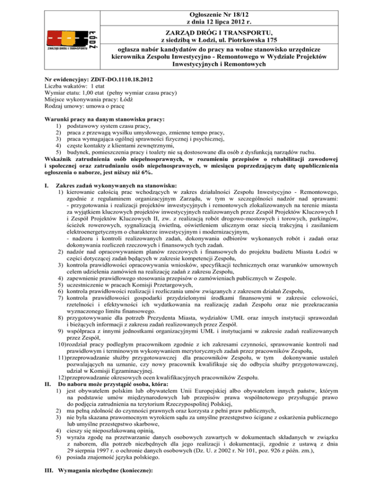 Ogłoszenie Nr 18/12 z dnia 12 lipca 2012 r. ZARZĄD DRÓG I TRANSPORTU, z siedzibą w Łodzi, ul. Piotrkowska 175 ogłasza nabór kandydatów do pracy na wolne stanowisko urzędnicze kierownika Zespołu Inwestycyjno - Remontowego w Wydziale Projektów Inwestycyjnych i Remontowych Nr ewidencyjny: ZDiT-DO.1110.18.2012 Liczba wakatów: 1 etat Wymiar etatu: 1,00 etat (pełny wymiar czasu pracy) Miejsce wykonywania pracy: Łódź Rodzaj umowy: umowa o pracę Warunki pracy na danym stanowisku pracy: 1) podstawowy system czasu pracy, 2) praca z przewagą wysiłku umysłowego, zmienne tempo pracy, 3) praca wymagająca ogólnej sprawności fizycznej i psychicznej, 4) częste kontakty z klientami zewnętrznymi, 5) budynek, pomieszczenia pracy i toalety nie są dostosowane dla osób z dysfunkcją narządów ruchu. Wskaźnik zatrudnienia osób niepełnosprawnych, w rozumieniu przepisów o rehabilitacji zawodowej i społecznej oraz zatrudnianiu osób niepełnosprawnych, w miesiącu poprzedzającym datę upublicznienia ogłoszenia o naborze, jest niższy niż 6%. Zakres zadań wykonywanych na stanowisku: 1) kierowanie całością prac wchodzących w zakres działalności Zespołu Inwestycyjno - Remontowego, zgodnie z regulaminem organizacyjnym Zarządu, w tym w szczególności nadzór nad sprawami: - przygotowania i realizacji projektów inwestycyjnych i remontowych zlokalizowanych na terenie miasta za wyjątkiem kluczowych projektów inwestycyjnych realizowanych przez Zespół Projektów Kluczowych I i Zespół Projektów Kluczowych II, zw. z realizacją robót drogowo-mostowych i torowych, parkingów, ścieżek rowerowych, sygnalizacją świetlną, oświetleniem ulicznym oraz siecią trakcyjną i zasilaniem elektroenergetycznym o charakterze inwestycyjnym i modernizacyjnym, - nadzoru i kontroli realizowanych zadań, dokonywania odbiorów wykonanych robót i zadań oraz dokonywania rozliczeń rzeczowych i finansowych tych zadań. 2) nadzór nad opracowywaniem planów rzeczowych i finansowych do projektu budżetu Miasta Łodzi w części dotyczącej zadań będących w zakresie kompetencji Zespołu, 3) kontrola prawidłowości opracowywania wniosków, specyfikacji technicznych oraz warunków umownych celem udzielenia zamówień na realizację zadań z zakresu Zespołu, 4) zapewnienie prawidłowego stosowania przepisów o zamówieniach publicznych w Zespole. 5) uczestniczenie w pracach Komisji Przetargowych, 6) kontrola prawidłowości realizacji i rozliczania umów związanych z zakresem działań Zespołu, 7) kontrola prawidłowości gospodarki przydzielonymi środkami finansowymi w zakresie celowości, rzetelności i efektywności ich wydatkowania na realizację zadań Zespołu oraz nie przekraczania wyznaczonego limitu finansowego. 8) przygotowywanie dla potrzeb Prezydenta Miasta, wydziałów UMŁ oraz innych instytucji sprawozdań i bieżących informacji z zakresu zadań realizowanych przez Zespół. 9) współpraca z innymi jednostkami organizacyjnymi UMŁ i instytucjami w zakresie zadań realizowanych przez Zespół, 10) rozdział pracy podległym pracownikom zgodnie z ich zakresami czynności, sprawowanie kontroli nad prawidłowym i terminowym wykonywaniem merytorycznych zadań przez pracowników Zespołu, 11) przeprowadzanie służby przygotowawczej dla pracowników Zespołu, w tym dokonywanie ustaleń pozwalających na uznanie, czy nowy pracownik kwalifikuje się do odbycia służby przygotowawczej, udział w Komisji Egzaminacyjnej. 12) przeprowadzanie okresowych ocen kwalifikacyjnych pracowników Zespołu. II. Do naboru może przystąpić osoba, która: 1) jest obywatelem polskim lub obywatelem Unii Europejskiej albo obywatelem innych państw, którym na podstawie umów międzynarodowych lub przepisów prawa wspólnotowego przysługuje prawo do podjęcia zatrudnienia na terytorium Rzeczypospolitej Polskiej, 2) ma pełną zdolność do czynności prawnych oraz korzysta z pełni praw publicznych, 3) nie była skazana prawomocnym wyrokiem sądu za umyślne przestępstwo ścigane z oskarżenia publicznego lub umyślne przestępstwo skarbowe, 4) cieszy się nieposzlakowaną opinią, 5) wyraża zgodę na przetwarzanie danych osobowych zawartych w dokumentach składanych w związku z naborem, dla potrzeb niezbędnych dla jego realizacji i dokumentacji, zgodnie z ustawą z dnia 29 sierpnia 1997 r. o ochronie danych osobowych (Dz. U. z 2002 r. Nr 101, poz. 926 z późn. zm.), 6) posiada znajomość języka polskiego. I. III. Wymagania niezbędne (konieczne): 1) wykształcenie wyższe techniczne o kierunku budownictwo, 2) uprawnienia do pełnienia samodzielnych funkcji technicznych w budownictwie bez ograniczeń w specjalności : drogowej, mostowej, konstrukcyjno –budowlanej, kolejowej lub instalacyjnej, 3) 5 - letni staż pracy, w tym doświadczenie na stanowiskach związanych z przygotowaniem lub realizacją inwestycji (za staż pracy uznawany jest również równoważny okres prowadzenia działalności gospodarczej o charakterze zgodnym z wymaganiami określonymi na ww stanowisku), 4) doświadczenie w pracy na stanowiskach kierowniczych, 5) znajomość ustaw: Prawo budowlane (Dz. U. z 2010 r. Nr. 243, poz. 1623 z późn. zm.), o planowaniu i zagospodarowaniu przestrzennym (Dz. U. z 2012 r., poz. 647), Prawo zamówień publicznych (Dz. U. z 2010 r. Nr 113, poz. 759 z późn. zm.), o drogach publicznych (Dz. U. z 2007 r. Nr 19, poz. 115 z późn. zm.), ustawy o szczególnych zasadach przygotowania i realizacji inwestycji w zakresie dróg publicznych (Dz. U. z 2008 r. Nr 193, poz. 1194), Prawo o ruchu drogowym (Dz. U. z 2005 r. Nr 108, poz. 908 z późn. zm.), ustawy o publicznym transporcie zbiorowym (Dz. U. z 2011 r. Nr 5, poz. 13 z późn. zm.), ustawy z dnia 27 kwietnia 2001 r. Prawo ochrony środowiska (Dz. U. z 2008 r. Nr 25, poz. 150 z późn. zm.), ustawy z dnia 3 października 2008 r. o udostępnianiu informacji o środowisku i jego ochronie, udziale społeczeństwa w ochronie środowiska