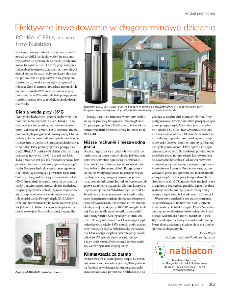 Artykuł promocyjny Efektywne inwestowanie w długoterminowe działanie POMPA CIEPŁA z c.w.u. firmy Nabilaton Szukamy oszczędności, chcemy zminimalizować wydatki na ciepłą wodę i tu zaczynamy podróż po systemach do ciepłej wody użytkowej (w skrócie c.w.u.). Do tej pory jednym z najbardziej energooszczędnych odnawialnych źródeł ciepła do c.w.u. były kolektory słoneczne. Jednak wraz z pojawieniem się pomp ciepła do c.w.u., kolektory zaczęły ustępować im miejsca. Średni wzrost sprzedaży pomp ciepła do c.w.u. o około 25% rocznie pozwala przypuszczać, że w Polsce to właśnie pompy przejmą dominującą rolę w produkcji ciepła do ciepłej wody. Ciepła woda przy -35°C Pompy ciepła do c.w.u. pracują najbardziej ekonomicznie do temperatury -7°C to fakt. Taka temperatura jest granicą, po przekroczeniu której załączą się grzałki jeżeli chcemy, aby to pompa ciepła podgrzewała naszą wodę. I tu powstaje pytanie: jeżeli nie mamy lub nie chcemy innego źródła ciepła niż pompa ciepła do c.w.u. to co dalej? Przy pomocy grzałek pompy ciepła ZUBADAN marki Mitsubishi Electric mogą pracować nawet do -30°C – i to też jest fakt. Taka praca nie jest już tak ekonomiczna jak bez grzałek, ale mamy cały rok zapewnioną ciepłą wodę. Pompy ciepła do centralnego ogrzewania uzyskujące energię z powietrza mają inną budowę. Bez grzałek mogą pracować nawet do -35°C! Specjalnie wyprodukowana do grzania wody i powietrza jednostka, dzięki modulacyjnej pracy sprężarki potrafi płynnie dopasować się do zapotrzebowania systemu grzewczego i do ciepłej wody. Pompy ciepła ZUBADAN przy podgrzewaniu ciepłej wody używają grzałek jedynie do higienicznego zabezpieczenia przed rozwojem flory bakteryjnej Legionella. Zasobnik c.w.u. (po lewej) i system Ecodan: 1) pompa ciepła Zubadan, 2) zasobnik wody pitnej, 3) ogrzewanie podłogowe, 4) punkty dostarczania ciepłej wody, 5) kaloryfer Pompy ciepła montujemy wewnątrz budynku np. w piwnicy lub garażu. Poziom głośności pracy pomp firmy Nabilaton to tylko 49 dB, porównywalnie głośność pracy lodówki to ok. 42-44 dB. Niższe rachunki i niezawodna praca Deszcz, mgła, noc czy dzień – te warunki nie wpływają na pracę pompy ciepła, jedynie temperatura powietrza ogranicza jej działanie. Przy kolektorach słonecznych praca jest możliwa tylko w słoneczny dzień. Pompy ciepła do ciepłej wody użytkowej najczęściej wykorzystują energię zmagazynowaną w powietrzu, wodzie lub ziemi. Jednak to powietrze odgrywa tutaj decydującą rolę. Główna korzyść z użycia pomp ciepła Nabilaton wynika z faktu, że nakłady energetyczne pompy ciepła związane są z przeniesieniem ciepła, a nie jego pełnym wytworzeniem. Pobierając 475 W energii elektrycznej uzyskujemy 1800 W energii cieplnej. Czy ma to dla użytkownika znaczenie? Tak i to ogromne! Elektryczne zasobniki do c.w.u. do wyprodukowania 1 kW energii cieplnej potrzebują około 1 kW energii elektrycznej. Przy pompach ciepła Nabilaton do wytworzenia 1 kW energii cieplnej potrzebujemy zaledwie 0,26 kW energii elektrycznej. Jest to 4 razy mniejsze zużycie energii, a więc mniejszy koszt uzyskania ciepłej wody. wietrza w upalne dni mamy za darmo. Przy podgrzewaniu wody powietrze przepływające przez pompę ciepła Nabilaton jest schładzane o około 5°C. Może być wykorzystane jako klimatyzacja w okresie letnim. A co zrobić ze schłodzonym powietrzem w okresach przejściowych? Oczywiście nie musimy schładzać naszych pomieszczeń, które ogrzaliśmy systemem grzewczym. Schłodzone powietrze po przejściu przez pompę ciepła kierowane jest na zewnątrz budynku. Ciekawym rozwiązaniem jest połączenie pracy pompy ciepła z rekuperatorem Lossnay. Powietrze zużyte, wywiewane przez rekuperator jest kierowane do pompy ciepła – i tak przy temperaturach dochodzących do -20°C gwarantowana jest praca urządzenia bez użycia grzałek. Łącząc te dwa systemy ze sobą mamy przedłużoną pracę pompy ciepła również w okresach zimowych. Wzrostowe tendencje cen paliw zmuszają do poszukiwania najbardziej efektywnych i najtrwalszych źródeł ciepła. Firma Nabilaton bazując na wieloletnim doświadczeniu i technologii Mitsubishi Electric realizuje te idee. Wprowadzając na bieżąco udoskonalenia dążymy do rozwiązań najtańszych w eksploatacji oraz ekologicznych. Jacek Parys Inżynier w firmie Nabilaton Sp. z o.o. Klimatyzacja za darmo Agregat ZUBADAN i zasobnik c.w.u. Dodatkowymi atutami pomp ciepła do c.w.u. jest osuszanie powietrza (szczególnie polecana funkcja w wilgotnych pomieszczeniach) oraz ochładzanie powietrza. Ochładzanie po- Nabilaton Sp. z o.o. ul. Marywilska 34, 03-228 Warszawa tel. 22 811 30 28, faks 22 811 37 43 www.nabilaton.pl budujemy dom 6/2013 203