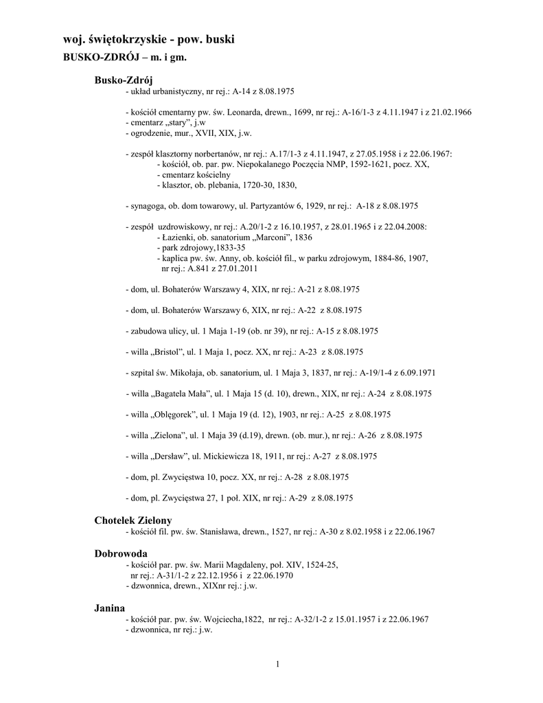 woj. świętokrzyskie - pow. buski BUSKO-ZDRÓJ – m. i gm. Busko-Zdrój - układ urbanistyczny, nr rej.: A-14 z 8.08.1975 - kościół cmentarny pw. św. Leonarda, drewn., 1699, nr rej.: A-16/1-3 z 4.11.1947 i z 21.02.1966 - cmentarz „stary”, j.w - ogrodzenie, mur., XVII, XIX, j.w. - zespół klasztorny norbertanów, nr rej.: A.17/1-3 z 4.11.1947, z 27.05.1958 i z 22.06.1967: - kościół, ob. par. pw. Niepokalanego Poczęcia NMP, 1592-1621, pocz. XX, - cmentarz kościelny - klasztor, ob. plebania, 1720-30, 1830, - synagoga, ob. dom towarowy, ul. Partyzantów 6, 1929, nr rej.: A-18 z 8.08.1975 - zespół uzdrowiskowy, nr rej.: A.20/1-2 z 16.10.1957, z 28.01.1965 i z 22.04.2008: - Łazienki, ob. sanatorium „Marconi”, 1836 - park zdrojowy,1833-35 - kaplica pw. św. Anny, ob. kościół fil., w parku zdrojowym, 1884-86, 1907, nr rej.: A.841 z 27.01.2011 - dom, ul. Bohaterów Warszawy 4, XIX, nr rej.: A-21 z 8.08.1975 - dom, ul. Bohaterów Warszawy 6, XIX, nr rej.: A-22 z 8.08.1975 - zabudowa ulicy, ul. 1 Maja 1-19 (ob. nr 39), nr rej.: A-15 z 8.08.1975 - willa „Bristol”, ul. 1 Maja 1, pocz. XX, nr rej.: A-23 z 8.08.1975 - szpital św. Mikołaja, ob. sanatorium, ul. 1 Maja 3, 1837, nr rej.: A-19/1-4 z 6.09.1971 - willa „Bagatela Mała”, ul. 1 Maja 15 (d. 10), drewn., XIX, nr rej.: A-24 z 8.08.1975 - willa „Oblęgorek”, ul. 1 Maja 19 (d. 12), 1903, nr rej.: A-25 z 8.08.1975 - willa „Zielona”, ul. 1 Maja 39 (d.19), drewn. (ob. mur.), nr rej.: A-26 z 8.08.1975 - willa „Dersław”, ul. Mickiewicza 18, 1911, nr rej.: A-27 z 8.08.1975 - dom, pl. Zwycięstwa 10, pocz. XX, nr rej.: A-28 z 8.08.1975 - dom, pl. Zwycięstwa 27, 1 poł. XIX, nr rej.: A-29 z 8.08.1975 Chotelek Zielony - kościół fil. pw. św. Stanisława, drewn., 1527, nr rej.: A-30 z 8.02.1958 i z 22.06.1967 Dobrowoda - kościół par. pw. św. Marii Magdaleny, poł. XIV, 1524-25, nr rej.: A-31/1-2 z 22.12.1956 i z 22.06.1970 - dzwonnica, drewn., XIXnr rej.: j.w. Janina - kościół par. pw. św. Wojciecha,1822, nr rej.: A-32/1-2 z 15.01.1957 i z 22.06.1967 - dzwonnica, nr rej.: j.w. 1 woj. świętokrzyskie - pow. buski Pęczelice - zbór ariański, ob. budynek gosp. w zagrodzie nr 26, XVI-XVII, nr rej.: A-33 z 6.09.1971 Radzanów - zespół dworski, k. XVIII, XX, nr rej.: A-34/1-2 z 7.06.1947, z 8.02.1958 i z 22.06.1967: - dwór - park Skotniki Małe - młyn wodny, drewn., 1934, nr rej.: A-35 z 3.11.1976 - młyn wodny, drewn., 1929, nr rej.: A-36 z 3.11.1976 Szaniec - kościół par. pw. Wniebowzięcia NMP, k. XV, XVI, XIX, 1914, nr rej.: A-37 z 18.10.1956, z 4.01.1957 i z 21.02.1966 - kaplica cmentarna, 1876, nr rej.: A-38 z 3.12.1958 - dwór, XVI-XVII, nr rej.: A-39 z 18.10.1956 i z 22.06.1967 Szczaworyż - kościół par. pw. św. Jakuba Apostoła, ok. 1630, nr rej.: A-40/1-2 z 2.10.1956 i z 22.06.1967 - plebania „stara”, ob. kaplica przedpogrzebowa, nr rej.: j.w. Widuchowa - kościół fil. pw. NMP, ob. kaplica pw. MB Anielskiej, 1791, nr rej.: A-41 z 15.01.1957 i z 23.06.1967 - zespół dworski, nr rej.: A-42/1-2 z 2.10.1956 i z 12.05.1965 : - dwór, 1620, XVIII, 2 poł. XIX - ogród, XVII-XIX GNOJNO – gm. Balice - kościół par. pw. św. Stanisława Biskupa, pocz. XIX, 1923, nr rej.: A-43 z 31.03.1971 Gnojno - kościół par. pw. św. Jana Chrzciciela, 1596-98, nr rej.: A-44/1-2 z 18.10.1956 i z 22.06.1967 - kostnica, na cmentarzu kościelnym, XV, nr rej.: A-44/1-2 z 28.02.1958 - zespół dworski, nr rej.: 45/1-2 z 13.04.1933, z 13.07.1946, z 11.12.1957 i z 23.06.1967: - dwór, 2 poł. XVI, XVII, 1960 - park, XIX NOWY KORCZYN – gm. Czarkowy - cmentarz wojenny (legionowy 1914-15, z 1939, AK), nr rej.: A.46 z 5.11.1990 Nowy Korczyn - założenie urbanistyczne, nr rej.: A.47 z 14.02.1959 2 woj. świętokrzyskie - pow. buski - zespół kościoła parafialnego, ul. Farna 1, nr rej.: A.48/1-3 z 4.12.1956, z 19.02.1966 i z 18.09.2013 : - kościół pw. Świętej Trójcy, 1608-90, - dzwonnica - brama, 1889 - d. cmentarz przy kościele - zespół klasztorny franciszkanów, nr rej.: A.51/1-2 z 4.12.1956 i z 19.02.1966: - kościół , ob. fil. pw. św. Stanisława, 2 poł. XIII, XIV, po 1945 - klasztor, ob. plebania, 2 poł. XII, XV, XVIII - synagoga, (k. XVIII), 1894-95, nr rej.: A.49 z 8.02.1958 i z 22.06.1967 - cmentarz par., 2 poł. XIX, nr rej.: A.52 z 1.07.1992 - cmentarz par. stary, tzw. ruski, 1 poł. XIX, nr rej.: A.51 z 1.07.1992 - kaplica grobowa rodziny Królikowskich, XIX, nr rej.: j.w. - dom, Rynek 25 (d. 36), XVI, nr rej.: A.53 z 6.08.1971 Ostrowce - cmentarz par., nr rej.: A.54 z 27.08.1992 Piasek Wielki - kościół par. pw. św. Katarzyny, 1340, 1898-1902, nr rej.: A.55 z 22.12.1956 i z 22.06.1967 - cmentarz par., nr rej.: A.56 z 9.08.1992 Podzamcze - ruina zamku, XIV, nr rej.: 84 Aa z 29.03.1993 (dec. archeologia) Stary Korczyn - kościół par. pw. św. Mikołaja, poł. XIV, XV, 2 poł. XX, nr rej.: A.57/1-2 z 21.01.1933 (wypis z księgi orzeczeń), z 11.02.1967 i z 18.03.1999 - dzwonnica, 1920 - cmentarz par., ok. poł. XIX, nr rej.: A.58 z 23.12.1992 Strożyska - kościół par. pw. Wniebowzięcia NMP, 1378, k. XIX, po 1945, nr rej.: A.59 z 13.01.1957 i z 22.06.1967 Ucisków - cmentarz wojenny 1914-1915, nr rej.: A.60 z 5.11.1990 Winiary Wiślickie - park, k. XVIII, nr rej.: A.61 z 14.10.1972 PACANÓW – gm. Pacanów - kościół par. pw. św. Marcina, 2 poł. XIII, XVII, 1906, nr rej.: 781 z 8.02.1958 oraz 147 z 23.06.1967 - cmentarz par., nr rej.: A.63 z 23.06.1992 3 woj. świętokrzyskie - pow. buski Słupia Pacanowska - spichrz dworski, poł. XIX, nr rej.: A.64 z 8.02.1958 i z 11.02.1967 Zborówek - kościół par. pw. św. Idziego Opata, prezbiterium drewn., 1459, nawa mur. 1906-08, nr rej.: A.65 z 15.01.1957 i z 21.02.1966 - cmentarz par., nr rej.: A.66 z 5.08.1992 SOLEC-ZDRÓJ – gm. Solec-Zdrój - cmentarz par., 1 poł. XIX, nr rej.: A.67 z 31.08.1992 Świniary - kościół par. pw. św. Stanisława, drewn., 2 poł. XVII, nr rej.: A.68/1-2 z 15.01.1957 i z 23.06.1967 - 