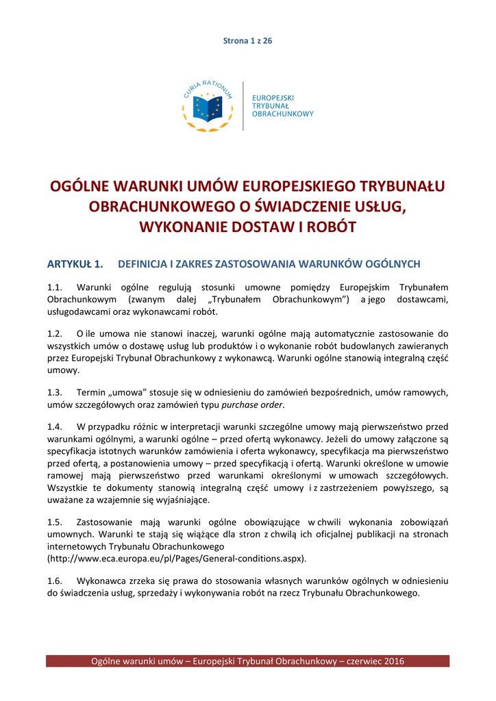 Strona 1 z 26 OGÓLNE WARUNKI UMÓW EUROPEJSKIEGO TRYBUNAŁU OBRACHUNKOWEGO O ŚWIADCZENIE USŁUG, WYKONANIE DOSTAW I ROBÓT ARTYKUŁ 1. DEFINICJA I ZAKRES ZASTOSOWANIA WARUNKÓW OGÓLNYCH 1.1. Warunki ogólne regulują stosunki umowne pomiędzy Europejskim Trybunałem Obrachunkowym (zwanym dalej „Trybunałem Obrachunkowym”) a jego dostawcami, usługodawcami oraz wykonawcami robót. 1.2. O ile umowa nie stanowi inaczej, warunki ogólne mają automatycznie zastosowanie do wszystkich umów o dostawę usług lub produktów i o wykonanie robót budowlanych zawieranych przez Europejski Trybunał Obrachunkowy z wykonawcą. Warunki ogólne stanowią integralną część umowy. 1.3. Termin „umowa” stosuje się w odniesieniu do zamówień bezpośrednich, umów ramowych, umów szczegółowych oraz zamówień typu purchase order. 1.4. W przypadku różnic w interpretacji warunki szczególne umowy mają pierwszeństwo przed warunkami ogólnymi, a warunki ogólne – przed ofertą wykonawcy. Jeżeli do umowy załączone są specyfikacja istotnych warunków zamówienia i oferta wykonawcy, specyfikacja ma pierwszeństwo przed ofertą, a postanowienia umowy – przed specyfikacją i ofertą. Warunki określone w umowie ramowej mają pierwszeństwo przed warunkami określonymi w umowach szczegółowych. Wszystkie te dokumenty stanowią integralną część umowy i z zastrzeżeniem powyższego, są uważane za wzajemnie się wyjaśniające. 1.5. Zastosowanie mają warunki ogólne obowiązujące w chwili wykonania zobowiązań umownych. Warunki te stają się wiążące dla stron z chwilą ich oficjalnej publikacji na stronach internetowych Trybunału Obrachunkowego (http://www.eca.europa.eu/pl/Pages/General-conditions.aspx). 1.6. Wykonawca zrzeka się prawa do stosowania własnych warunków ogólnych w odniesieniu do świadczenia usług, sprzedaży i wykonywania robót na rzecz Trybunału Obrachunkowego. Ogólne warunki umów – Europejski Trybunał Obrachunkowy – czerwiec 2016 Strona 2 z 26 ARTYKUŁ 2. WYKONANIE UMOWY 2.1. Wykonawca zobowiązuje się do dostarczenia produktów, wykonania usług lub robót wyszczególnionych w umowie (zwanych dalej „zadaniami”) po cenie oraz w terminach w niej określonych. 2.2. O ile w umowie nie wskazano inaczej, wszelkie terminy w niej określone oznacza się w dniach kalendarzowych. 2.3. Wykonawca spełnia wymagania określone w specyfikacji istotnych warunków zamówienia. 2.4. Na mocy umowy wykonawcy nie przysługuje wyłączne prawo do wykonania wyszczególnionych w niej zadań. 2.5. Wykonawca wykonuje umowę zgodnie z najwyższymi standardami zawodowymi i ponosi wyłączną odpowiedzialność za przestrzeganie spoczywających na nim prawnych zobowiązań, w szczególności w dziedzinie prawa pracy, prawa podatkowego, prawa socjalnego i prawodawstwa w zakresie ochrony środowiska, ustanowionych w przepisach unijnych, krajowych, układach zbiorowych bądź w przepisach międzynarodowego prawa ochrony środowiska, międzynarodowego prawa socjalnego i międzynarodowego prawa pracy wymienionych w załączniku X do dyrektywy 2014/24/UE. 2.6. Wykonawca ponosi wyłączną odpowiedzialność za podjęcie niezbędnych kroków w celu uzyskania wszelkich zezwoleń i licencji wymaganych w związku z wykonaniem umowy zgodnie z przepisami ustawowymi i wykonawczymi obowiązującymi w miejscu wykonywania powierzonych mu zadań. 2.7. Wykonawca jest zobowiązany podjąć niezbędne kroki, aby sposób wykonywania przez niego umowy nie doprowadził do pozbawienia Trybunału Obrachunkowego oznaczenia SuperDrecksKëscht fir Betriber®. 2.8. Bez uszczerbku dla postanowień art. 4 wszelkie zawarte w umowie odniesienia do personelu wykonawcy dotyczą wyłącznie osób biorących udział w wykonywaniu umowy. Wykonawca zobowiązany jest zapewnić, aby wszystkie osoby wykonujące umowę posiadały kwalifikacje zawodowe i doświadczenie wymagane do realizacji powierzonych im zadań. 2.9. Wykonawca nie może reprezentować Trybunału ani postępować w sposób, który mógłby sprawiać takie wrażenie. Wykonawca informuje osoby trzecie, że nie jest podmiotem należącym do struktur europejskiej służby cywilnej. 2.10. Wykonawca ponosi wyłączną odpowiedzialność za personel wykonujący powierzone mu zadania. Wykonawca reguluje stosunki zatrudnienia lub świadczenia usług ze swoim personelem w następujący sposób: • personel wykonujący zadania powierzone wykonawcy nie może otrzymywać bezpośrednich poleceń od Trybunału Obrachunkowego; • Trybunał Obrachunkowy nie może w żadnym wypadku być uznawany za pracodawcę wspomnianego personelu, a ten zrzeka się wszelkich roszczeń względem Trybunału Ogólne warunki umów – Europejski Trybunał Obrachunkowy – czerwiec 2016 Strona 3 z 26 Obrachunkowego wynikających ze stosunku umownego pomiędzy Trybunałem Obrachunkowym a wykonawcą. 2.11. W przypadku wystąpienia zakłóceń będących wynikiem działania pracownika wykonawcy pracującego w obiektach Trybunału Obrachunkowego lub gdy doświadczenie lub wiedza pracownika wykonawcy nie odpowiadają profilowi określonemu w warunkach umowy, wykonawca niezwłocznie zastąpi tego pracownika innym. Trybunał Obrachunkowy ma prawo zażądać wymiany takiego pracownika, podając uzasadnienie. Osoba zastępująca musi posiadać niezbędne kwalifikacje i być zdolna do wykonywania umowy na niezmienionych warunkach. Wykonawca ponosi odpowiedzialność za wszelkie opóźnienia w realizacji powierzonych mu zadań wynikające z zastąpienia personelu zgodnie z niniejszym artykułem. 2.12. Wykonawca wyraża zgodę na dostarczenie Trybunałowi Obrachunkowemu wszelkich wymaganych informacji na potrzeby zarządzania umową. W przypadku gdy nieoczekiwane zdarzenie, działanie lub zaniechanie pośrednio lub bezpośrednio, w całości lub częściowo utrudni realizację zadań, wykonawca niezwłocznie i z własnej inicjatywy odnotuje ten fakt i zgłosi go Trybunałowi Obrachunkowem
