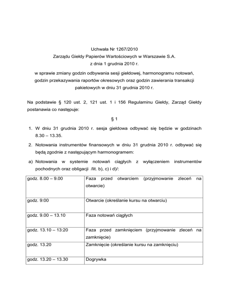 Uchwała Nr 1267/2010 Zarządu Giełdy Papierów Wartościowych w Warszawie S.A. z dnia 1 grudnia 2010 r. w sprawie zmiany godzin odbywania sesji giełdowej, harmonogramu notowań, godzin przekazywania raportów okresowych oraz godzin zawierania transakcji pakietowych w dniu 31 grudnia 2010 r. Na podstawie § 120 ust. 2, 121 ust. 1 i 156 Regulaminu Giełdy, Zarząd Giełdy postanawia co następuje: §1 1. W dniu 31 grudnia 2010 r. sesja giełdowa odbywać się będzie w godzinach 8.30 – 13.35. 2. Notowania instrumentów finansowych w dniu 31 grudnia 2010 r. odbywać się będą zgodnie z następującym harmonogramem: a) Notowania w systemie notowań ciągłych z wyłączeniem instrumentów pochodnych oraz obligacji /lit. b), c) i d)/: godz. 8.00 – 9.00 Faza przed otwarciem (przyjmowanie zleceń na otwarcie) godz. 9:00 Otwarcie (określanie kursu na otwarciu) godz. 9.00 – 13.10 Faza notowań ciągłych godz. 13.10 – 13:20 Faza przed zamknięciem (przyjmowanie zleceń na zamknięcie) godz. 13.20 Zamknięcie (określanie kursu na zamknięciu) godz. 13.20 – 13.30 Dogrywka godz. 13.30 – 13:35 Faza przed otwarciem (przyjmowanie zleceń na otwarcie następnej sesji) b) Notowania w systemie notowań ciągłych dla instrumentów pochodnych (z wyłączeniem kontraktów terminowych na obligacje Skarbu Państwa): godz. 8.00 – 8.30 Faza przed otwarciem (przyjmowanie zleceń na otwarcie) godz. 8:30 Otwarcie (określanie kursu na otwarciu) godz. 8.30 – 13.10 Faza notowań ciągłych godz. 13.10 – 13:20 Faza przed zamknięciem (przyjmowanie zleceń na zamknięcie) godz. 13.20 Zamknięcie (określanie kursu na zamknięciu) godz. 13.20 – 13.30 Dogrywka godz. 13.30 – 13:35 Faza przed otwarciem (przyjmowanie zleceń na otwarcie następnej sesji) c) Notowania w systemie notowań ciągłych dla kontraktów terminowych na obligacje Skarbu Państwa: godz. 8.15 – 8.30 Faza przed otwarciem (przyjmowanie zleceń na otwarcie) godz. 8.30 Otwarcie (określanie kursu otwarcia) godz. 8.30 – 13.20 Faza notowań ciągłych godz.13.20 – 13.30 Faza przed zamknięciem (przyjmowanie zleceń na zamknięcie) godz. 13.30 Zamknięcie (określanie kursu zamknięcia) 2 godz.13.30 – 13.35 Faza przed otwarciem (przyjmowanie zleceń na otwarcie następnej sesji) d) Notowania w systemie notowań ciągłych dla obligacji: godz. 8:00 – 9:00 Faza przed otwarciem (przyjmowanie zleceń na otwarcie) godz. 9:00 Otwarcie (określanie kursu na otwarciu) godz. 9:00 – 13:20 Faza notowań ciągłych godz. 13:20 – 13:30 Faza przed zamknięciem (przyjmowanie zleceń na zamknięcie) godz. 13:30 Zamknięcie (określanie kursu na zamknięciu) godz. 13:30 – 13:35 Faza przed otwarciem (przyjmowanie zleceń na otwarcie następnej sesji) e) Notowania w systemie kursu jednolitego z dwukrotnym określaniem kursu jednolitego: godz. 8:00 – 11:15 Faza przed otwarciem (przyjmowanie zleceń na zleceń na otwarcie) godz. 11:15 Otwarcie (określanie kursu jednolitego) godz. 11:15 – 11:45 Dogrywka godz. 11:45 – 12:30 Faza przed otwarciem (przyjmowanie otwarcie) godz. 12:30 Otwarcie (określanie kursu jednolitego) godz. 12:30 – 13:00 Dogrywka 3 godz. 13:00 – 13:35 Faza przed otwarciem (przyjmowanie zleceń na otwarcie następnej sesji) §2 W dniu 31 grudnia 2010 r. składanie propozycji nabycia lub zbycia oraz przekazywanie zleceń maklerskich dotyczących transakcji odkupu lub odsprzedaży instrumentów finansowych będzie możliwe w godzinach 9.00 - 12.00. §3 1. W dniu 31 grudnia 2010 r. zlecenia maklerskie lub wnioski składane w celu zawarcia transakcji pakietowych mogą być przekazywane na giełdę w następujących godzinach: a) 8.00 – 11.00 - w przypadku transakcji, o których mowa w § 154 ust. 5 oraz § 155 ust. 3 Regulaminu Giełdy, a w przypadku gdy transakcja ma być rozliczona w dniu jej zawarcia – w godz. 8.00 – 10.00, b) 8.00 – 13.30 – w przypadku transakcji, o których mowa w § 155 ust. 1 Regulaminu Giełdy (8.00 – 13.35 w przypadku obligacji), a w przypadku gdy transakcja ma być rozliczona w dniu jej zawarcia – w godz. 8.00 – 12.00, c) 13.30 – 13.50 - w przypadku transakcji, o których mowa w § 155 ust. 2 Regulaminu Giełdy (13.35 – 13.50 w przypadku obligacji), d) 9.00 – 13.30 – w przypadku transakcji, o których mowa w Rozdziale IX, Oddziale 5 Szczegółowych Zasad Obrotu Giełdowego, e) 9.00 – 13.30 w przypadku transakcji, o których mowa w Rozdziale IX, Oddziale 5a Szczegółowych Zasad Obrotu Giełdowego, a w przypadku gdy transakcja ma być rozliczona w dniu jej zawarcia – w godz. 9.00 – 12.00. 2. Wyrażenie lub odmowa wyrażenia zgody na zawarcie w dniu 31 grudnia 2010 r. transakcji pakietowej, o której mowa w ust. 1 lit. a), następuje do godz. 13.30 w tym dniu. §4 1. W związku ze zmianą w dniu 31 grudnia 2010 r. godzin odbywania sesji giełdowej oraz harmonogramu sesji, emitenci instrumentów finansowych notowanych na giełdzie powinni przekazywać raporty okresowe w tym dniu: 4 a) do godz. 8.30 – jeżeli instrumenty finansowe notowane są w systemie notowań ciągłych, b) do godz. 10.45 - jeżeli instrumenty finansowe notowane są w systemie notowań kursu jednolitego z dwukrotnym określaniem kursu. 2. Wznowienie przekazywania raportów okresowych powinno nastąpić po zakończeniu notowań instrumentów finansowych emitenta w danym systemie notowań w tym dniu, a mianowicie: a) o godz. 13.35 - jeżeli instrumenty finansowe emitenta notowane są w systemie notowań ciągłych, b) o godz. 13.00 - jeżeli instrumenty finansowe emitenta notowane są w systemie notowań kursu jednolitego z dwukrotnym określaniem kursu. §5 Uchwała wchodzi w życie z dniem podjęcia. 5
