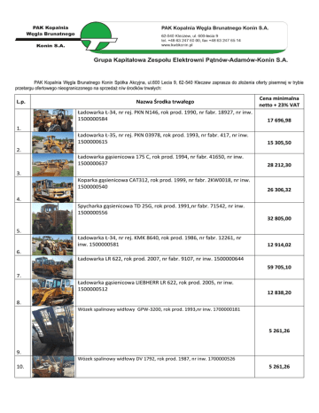 PAK Kopalnia Węgla Brunatnego Konin Spółka Akcyjna, ul.600 Lecia 9, 62-540 Kleczew zaprasza do złożenia oferty pisemnej w trybie przetargu ofertowego nieograniczonego na sprzedaż n/w środków trwałych: L.p. Nazwa Środka trwałego Cena minimalna netto + 23% VAT Ładowarka Ł-34, nr rej. PKN N146, rok prod. 1990, nr fabr. 18927, nr inw. 1500000584 17 696,98 Ładowarka Ł-35, nr rej. PKN 03978, rok prod. 1993, nr fabr. 417, nr inw. 1500000615 15 305,50 Ładowarka gąsienicowa 175 C, rok prod. 1994, nr fabr. 41650, nr inw. 1500000637 28 212,30 1. 2. 3. Koparka gąsienicowa CAT312, rok prod. 1999, nr fabr. 2KW0018, nr inw. 1500000540 26 306,32 4. Spycharka gąsienicowa TD 25G, rok prod. 1991,nr fabr. 71542, nr inw. 1500000556 32 805,00 5. Ładowarka Ł-34, nr rej. KMK 8640, rok prod. 1986, nr fabr. 12261, nr inw. 1500000581 12 914,02 6. Ładowarka LR 622, rok prod. 2007, nr fabr. 9107, nr inw. 1500000644 59 705,10 7. Ładowarka gąsienicowa LIEBHERR LR 622, rok prod. 2005, nr inw. 1500000512 12 838,20 8. Wózek spalinowy widłowy GPW-3200, rok prod. 1993,nr inw. 1700000181 5 261,26 9. Wózek spalinowy widłowy DV 1792, rok prod. 1987, nr inw. 1700000526 10. 5 261,26 Wózek spalinowy widłowy GPW-4000, rok prod. 1995,nr inw. 1700001421 8 250,61 11. Wózek spalinowy widłowy GPW-2504, rok prod. 1994,nr inw. 1700000733, nr fabr. 820437 4000,00 12. Wózek spalinowy widłowy DV 1798.33, rok prod. 1994,nr inw. 1700000719, nr fabr. 94035034285 4500,00 13. Oferty: 1.Oferty będą przyjmowane: do 20.07.2016 r. do godz. 10:00. 2.Oferty należy składać z wykorzystaniem Internetowej Platformy Zakupowej Logintrade lub w zaklejonych kopertach w sekretariacie Działu Zakupów EZ w Kazimierzu Biskupim, pokój nr 17 „z nazwą środka trwałego na kopercie i pozycji”. 3.Oferta będzie wiążąca 30 dni od zakończenia zbierania ofert określonego w niniejszym zaproszeniu. 4.Oferta musi zawierać: - pełne dane Oferenta składającego ofertę, - proponowaną cenę jednostkową netto w PLN za poszczególny środek trwały, - polecenie przelewu wpłaconego wadium (kopia), - aktualny odpis z właściwego rejestru KRS, bądź wydruk z Centralnej Informacji Krajowego Rejestru Sądowego albo aktualne zaświadczenie o wpisie do ewidencji działalności gospodarczej, bądź wydruk z Centralnej Ewidencji i Informacji o Działalności Gospodarczej, wystawione nie wcześniej niż 6 miesięcy przed upływem terminu składania oferty (dotyczy podmiotów gospodarczych), - zaświadczenie o nadaniu numeru Identyfikacji Podatkowej NIP (dotyczy podmiotów gospodarczych), - zaświadczenie o nadaniu numeru identyfikacyjnego REGON (dotyczy podmiotów gospodarczych), - wypełnione „Oświadczenie” wg wzoru w załączniku (poniższy formularz do pobrania w intranecie oraz w Dziale Zakupów EZ pokój nr 17), - podpis Oferenta. 5.W przypadku chęci uczestnictwa w przetargu na kilka środków trwałych Oferent jest zobowiązany do złożenia każdej oferty w osobnej kopercie. 6.Otwarcie ofert nastąpi bez obecności Oferentów. O wynikach przetargu PAK KWB Konin S.A poinformuje wszystkich oferentów drogą elektroniczną. 7.Kryterium wyboru oferty: najkorzystniejsza dla PAK KWB Konin S.A. Za najkorzystniejszą ofertę uznana zostanie oferta, w której zaoferowano najwyższą cenę jednostkową netto zakupu za środek trwały. Wadium: Warunkiem uczestnictwa w przetargu jest wpłacenie wadium w wysokości 10% ceny minimalnej wystawionego do przetargu środka trwałego. Wadium należy wpłacać na : PAK Kopalnia Węgla Brunatnego Konin S.A. BPH S.A., o/Konin, nr konta 64 1060 0076 0000 3210 0022 9700 1.Wadium złożone przez Oferentów, których oferty nie zostały przyjęte, podlega zwrotowi po dokonaniu wyboru oferty, a Oferentowi, którego oferta została przyjęta będzie zarachowane na poczet ceny. 2.W razie ustalenia, że kilku Oferentów zaoferowało tę samą najwyższą cenę prowadzący przetarg będzie kontynuował niezwłocznie przetarg w formie licytacji ustnej miedzy tymi Oferentami, przyjmując jako cenę wywoławczą kwotę zgłoszoną w ofertach. Postąpienie w licytacji ustnej nie może być niższe niż 1% ceny wywoławczej. Podstawa odrzucenia oferty: 1.Niezgodność oferty z kryteriami sprzedaży zawartymi w specyfikacji warunków odbioru środków trwałych. 2.Brak kompletności oferty i załączonych dokumentów. 3.Oferty z zaproponowanymi cenami niższymi od ceny minimalnej. 4.Wadium przepada na rzecz Spółki jeżeli: - Oferent, którego oferta zostanie przyjęta nie uiści ceny nabycia w terminie nie dłuższym niż 14 dni od dnia przetargu, Oferent ten traci również prawo do zakupu środka trwałego. Wystawione do sprzedaży środki trwałe można oglądać w Oddziale TDG lub Energoinwest PAK KWB Konin S.A. (Kazimierz Biskupi, ul. Biurowiec 2) w dniach 18-19.07.2016r. w godz. od 700 do 1300 Informacje: 1.W sprawach formalnych: a) formalnych - Paweł Radzik Dział EZ – Kazimierz Biskupi tel. 63/247 53 95, e-mail: [email protected], b) technicznych : - Jerzy Szczęsny Oddział TDG – tel. 63 247 8190, e-mail: [email protected] - Andrzej Król (Energoinwest) tel. 63 247 6078,e-mail: [email protected] 3.Komunikacja z Oferentami w trakcie procesu sprzedaży środków trwałych będzie prowadzona pocztą elektroniczną , faksem lub telefonicznie. Z uwagi na fakt, że proponowane do sprzedaży maszyny, urządzenia, przedmioty są używane i nie podlegają gwarancji oraz zwrotowi prosimy o dokładne ich obejrzenie przed złożeniem oferty, a w szczególności przed odbiorem gdyż wszelkie reklamacje związane z ich stanem, jakością nie będą rozpatrywane. Podstawą do identyfikacji maszyny, urządzenia, przedmiotów są jego numery fabryczne, rejestracyjne lub ewidencyjne zamieszczone obok opisu. Zdjęcia mają jedynie charakter pomocniczy i poglądowy i nie mogą stanowić podstawy reklamacji PAK Kopalnia Węgla Brunatnego Konin S.A. zastrzega sobie prawo do odwołania przetargu w całości lub