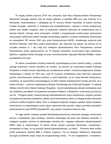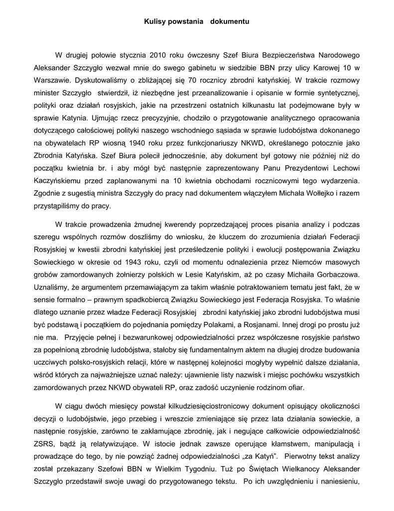 Kulisy powstania dokumentu W drugiej połowie stycznia 2010 roku ówczesny Szef Biura Bezpieczeństwa Narodowego Aleksander Szczygło wezwał mnie do swego gabinetu w siedzibie BBN przy ulicy Karowej 10 w Warszawie. Dyskutowaliśmy o zbliżającej się 70 rocznicy zbrodni katyńskiej. W trakcie rozmowy minister Szczygło stwierdził, iż niezbędne jest przeanalizowanie i opisanie w formie syntetycznej, polityki oraz działań rosyjskich, jakie na przestrzeni ostatnich kilkunastu lat podejmowane były w sprawie Katynia. Ujmując rzecz precyzyjnie, chodziło o przygotowanie analitycznego opracowania dotyczącego całościowej polityki naszego wschodniego sąsiada w sprawie ludobójstwa dokonanego na obywatelach RP wiosną 1940 roku przez funkcjonariuszy NKWD, określanego potocznie jako Zbrodnia Katyńska. Szef Biura polecił jednocześnie, aby dokument był gotowy nie później niż do początku kwietnia br. i aby mógł być następnie zaprezentowany Panu Prezydentowi Lechowi Kaczyńskiemu przed zaplanowanymi na 10 kwietnia obchodami rocznicowymi tego wydarzenia. Zgodnie z sugestią ministra Szczygły do pracy nad dokumentem włączyłem Michała Wołłejko i razem przystąpiliśmy do pracy. W trakcie prowadzenia żmudnej kwerendy poprzedzającej proces pisania analizy i podczas szeregu wspólnych rozmów doszliśmy do wniosku, że kluczem do zrozumienia działań Federacji Rosyjskiej w kwestii zbrodni katyńskiej jest prześledzenie polityki i ewolucji postępowania Związku Sowieckiego w okresie od 1943 roku, czyli od momentu odnalezienia przez Niemców masowych grobów zamordowanych żołnierzy polskich w Lesie Katyńskim, aż po czasy Michaiła Gorbaczowa. Uznaliśmy, że argumentem przemawiającym za takim właśnie potraktowaniem tematu jest fakt, że w sensie formalno – prawnym spadkobiercą Związku Sowieckiego jest Federacja Rosyjska. To właśnie dlatego uznanie przez władze Federacji Rosyjskiej zbrodni katyńskiej jako zbrodni ludobójstwa musi być podstawą i początkiem do pojednania pomiędzy Polakami, a Rosjanami. Innej drogi po prostu już nie ma. Przyjęcie pełnej i bezwarunkowej odpowiedzialności przez współczesne rosyjskie państwo za popełnioną zbrodnię ludobójstwa, stałoby się fundamentalnym aktem na długiej drodze budowania uczciwych polsko-rosyjskich relacji, które w następnej kolejności mogłyby wypełnić dalsze działania, wśród których za najważniejsze uznać należy: ujawnienie listy nazwisk i miejsc pochówku wszystkich zamordowanych przez NKWD obywateli RP, oraz zadość uczynienie rodzinom ofiar. W ciągu dwóch miesięcy powstał kilkudziesięciostronicowy dokument opisujący okoliczności decyzji o ludobójstwie, jego przebieg i wreszcie zmieniające się przez lata działania sowieckie, a następnie rosyjskie, zarówno te zakłamujące zbrodnię, jak i negujące całkowicie odpowiedzialność ZSRS, bądź ją relatywizujące. W istocie jednak zawsze operujące kłamstwem, manipulacją i prowadzące do tego, by nie powziąć żadnej odpowiedzialności „za Katyń”. Pierwotny tekst analizy został przekazany Szefowi BBN w Wielkim Tygodniu. Tuż po Świętach Wielkanocy Aleksander Szczygło przedstawił swoje uwagi do przygotowanego tekstu. Po ich uwzględnieniu i naniesieniu, ostatecznie poprawiony dokument został przekazany ministrowi w dniu 8 kwietnia 2010 roku. Następnego dnia, a było to piątkowe popołudnie 9 kwietnia, Szef BBN powiedział, że tekst mu się podoba i przedstawi go Prezydentowi RP Lechowi Kaczyńskiemu. Kilkanaście godzin później TU 154 z polską delegacją, z niewyjaśnionych do dziś powodów, runął na ziemię opodal pasa lotniska w Smoleńsku. Zginęli: inicjator powstania dokumentu – Aleksander Szczygło i jego odbiorca – Prezydent RP Lech Kaczyński. Już po 10 kwietnia 2010 roku dotarła do mnie informacja, że Aleksander Szczygło zabrał swój egzemplarz tekstu na pokład samolotu. Nie wiemy i nigdy się już nie dowiemy czy podczas tego ostatniego, tragicznego lotu TU 154, minister Aleksander Szczygło omawiał z prezydentem Lechem Kaczyńskim tekst analizy, jej główne tezy, wreszcie zawarte w niej rekomendacje. W ogóle nie wiadomo czy rozmawiali na ten temat na pokładzie samolotu podążającego do Smoleńska, choć nie możemy tego wykluczyć. Nie wiemy też co stało się z egzemplarzem dokumentu, który zabrał ze sobą do samolotu Aleksander Szczygło. Być może w tragicznym miejscu katastrofy, wśród szczątków ciał ofiar, ich rzeczy osobistych i smoleńskiego błota, był również przygotowany dokument. Na to pytanie dzisiaj nie potrafimy odpowiedzieć. Podczas tych jakże trudnych tygodni i miesięcy, które upłynęły od śmierci Prezydenta Polski oraz wielu wybitnych osób, które znalazły się w dniu 10 kwietnia 2010 roku na pokładzie Tu 154, a wśród nich mojego szefa Aleksandra Szczygły zastanawiałem się nie tylko nad okolicznościami i powodami tragedii smoleńskiej, ale także nad jej wymiarem historycznym. Myślałem także nad formułą i możliwościami zaprezentowania tekstu, z którym Państwo możecie się właśnie zapoznać. Powtórzę raz jeszcze - ostatniego dokumentu BBN jaki powstał z inicjatywy Aleksandra Szczygły i ostatniego dokumentu z rekomendacjami dla Prezydenta RP Lecha Kaczyńskiego. Możliwość taka nadarzyła się niedawno. Gdy we wrześniu 2010r. zwalniano mnie z pracy w BBN, zwróciłem się do urzędującego szefa BBN gen. Stanisława Kozieja z prośbą o zgodę na publikację tej właśnie analizy, poza instytucją. Ku memu zaskoczeniu, otrzymałem pozytywną odpowiedź, jednak nie bezwarunkową. Z tekstu, który Państwo otrzymujecie do lektury, usunięty został ostatni i w efekcie najważniejszy rozdział obejmujący swą treścią rekomendacje dla Urzędu Prezydenta Rzeczpospolitej Polskiej w zakresie prowadzenia polityki dotyczącej działań wobec Federacji Rosyjskiej w aspekcie Ludobójstwa Katyńskiego. Rekomendacje te by