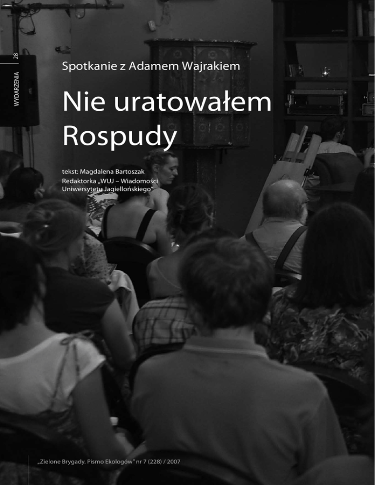 28 WYDARZENIA Spotkanie z Adamem Wajrakiem Nie uratowałem Rospudy tekst: Magdalena Bartoszak Redaktorka „WUJ – Wiadomości Uniwersytetu Jagiellońskiego” „Zielone Brygady. Pismo Ekologów” nr 7 (228) / 2007 21.6.2007 do krakowskiego Klubu Pod Jaszczurami zawitał Adam Wajrak. Był kolejnym gościem PRESSentacji – cyklu spotkań z najważniejszymi dziennikarzami w kraju, które prowadzi Bartek Borowicz. Zróżnicowani wiekowo uczestnicy spotkania mogli posłuchać m.in. o kwestii dotyczącej Doliny Rospudy czy organizacji przez Polskę Euro 2012. Choć okrzyknięty „tym, który uratował Dolinę” gość przyznał, iż bardziej czuje zażenowanie, niż dumę, gdy słyszy podobne słowa. Adam Wajrak podkreślał, że bardzo wielu ludzi przyczyniło się do sukcesu akcji, która tak naprawdę jeszcze nie została zakończona. Rospuda jest mu znana od dekady, kiedy to, dzięki dwóm zaprzyjaźnionym botanikom, zobaczył ją po raz pierwszy – Nigdy czegoś tak pięknego nie widziałem – przyznał. Dziennikarz nie bał się obarczyć winą za zły stan ochrony środowiska w Polsce polityków i urzędników – Oni nie szanują dobra wspólnego, dlatego celują w wartość publiczną, bo ona jest traktowana jak niczyja – mówił Wajrak. – Na szczęście lokalni działacze potrafią bronić tego, co ważne. Podkreślił, jak istotną rolę odgrywa chęć i umiejętność gromadzenia się ludzi i nawiązania współpracy do walki we wspólnym, słusznym celu. – To działa i w końcu urzędniczy potwór pęka – ocenił dziennikarz. Sam nie określa siebie mianem radykała, ale popiera radykalne akcje, które mogą przynieść największe efekty. Adam Wajrak nie jest członkiem żadnej organizacji ekologicznej, ale – jak sam przyznaje – mógłby przypiąć się do drzewa, by powstrzymać głupotę dziejącą się na jego oczach. Czuje się dziennikarzem zmuszonym reagować na ważne sprawy i tak było w przypadku Doliny Rospudy. Alarmował w trakcie spotkania, jak szybko ginie polska przyroda i jak słabym systemem ochrony środowiska dysponujemy w naszym kraju. Gość ujawnił także jedno ze swoich spełnionych marzeń – odnalezienie gniazda dudka. Na spotkaniu poruszono także sprawę polskich ogrodów zoologicznych – Są te bardzo dobre i te zupełnie niepotrzebne, jak w Białymstoku, gdzie w ciasnej klatce miota się niedźwiedź – ocenił publicysta „Gazety Wyborczej”. Adam Wajrak nauczyć się żyć z przyrodą i w przyrodzie. To dla człowieka wyzwanie, którego warto się podjąć – dodał na koniec. „Zielone Brygady. Pismo Ekologów” nr 7 (228) / 2007 WYDARZENIA 29 foto: Instytut Sztuki – Łatwo jest niszczyć, trudno jest zachować to, co jest warte zachowania – słowa Wisławy Szymborskiej mottem Adama Wajraka, obrońcy Doliny Rospudy.