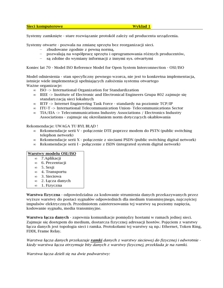 Koniec lat 70 - Model ISO Reference Model for Open System Interconnection - OSI/ISO