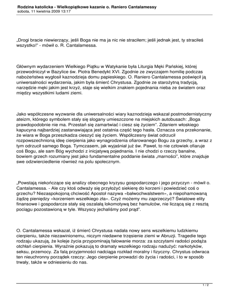 Rodzina katolicka - Wielkopiątkowe kazanie o. Raniero Cantalamessy