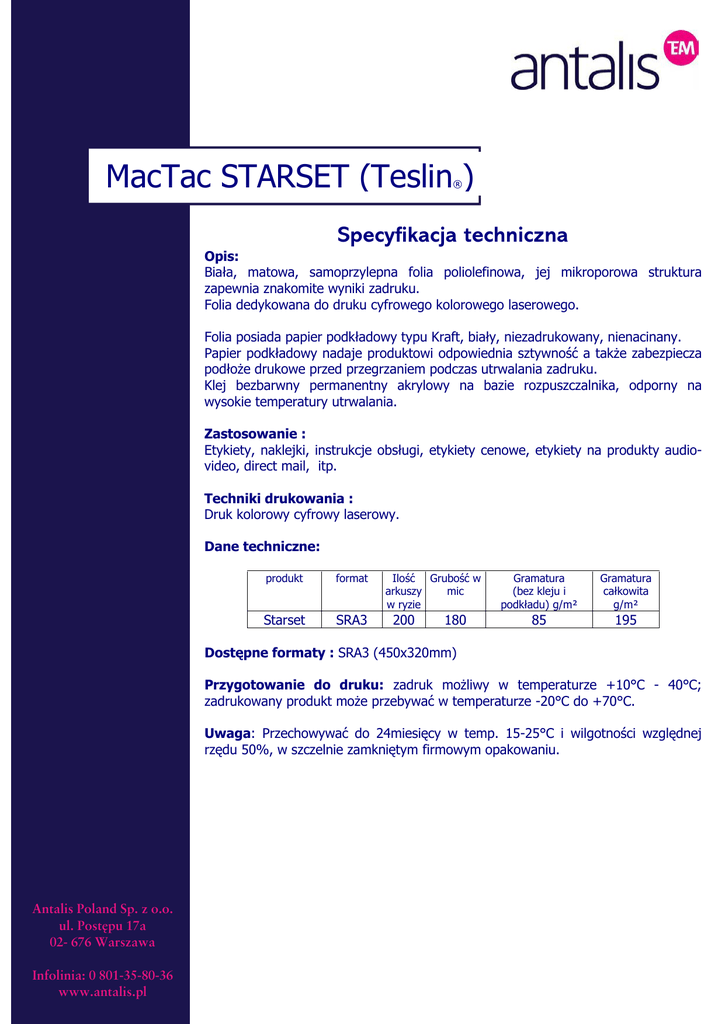 MacTac STARSET (Teslin ) ® Specyfikacja techniczna Opis: Biała, matowa, samoprzylepna folia poliolefinowa, jej mikroporowa struktura zapewnia znakomite wyniki zadruku. Folia dedykowana do druku cyfrowego kolorowego laserowego. Folia posiada papier podkładowy typu Kraft, biały, niezadrukowany, nienacinany. Papier podkładowy nadaje produktowi odpowiednia sztywność a także zabezpiecza podłoże drukowe przed przegrzaniem podczas utrwalania zadruku. Klej bezbarwny permanentny akrylowy na bazie rozpuszczalnika, odporny na wysokie temperatury utrwalania. Zastosowanie : Etykiety, naklejki, instrukcje obsługi, etykiety cenowe, etykiety na produkty audiovideo, direct mail, itp. Techniki drukowania : Druk kolorowy cyfrowy laserowy. Dane techniczne: produkt format Starset SRA3 Ilość Grubość w arkuszy mic w ryzie 200 180 Gramatura (bez kleju i podkładu) g/m² Gramatura całkowita g/m² 85 195 Dostępne formaty : SRA3 (450x320mm) Przygotowanie do druku: zadruk możliwy w temperaturze +10°C - 40°C; zadrukowany produkt może przebywać w temperaturze -20°C do +70°C. Uwaga: Przechowywać do 24miesięcy w temp. 15-25°C i wilgotności względnej rzędu 50%, w szczelnie zamkniętym firmowym opakowaniu. Antalis Poland Sp. z o.o. ul. Postępu 17a 02- 676 Warszawa Infolinia: 0 801-35-80-36 www.antalis.pl