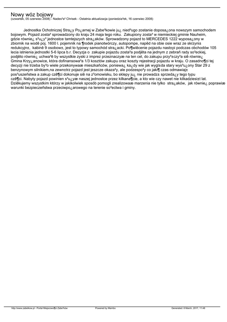 Nowy wóz bojowy (czwartek, 05 czerwiec 2008) - Nades³a³ Chrisek - Ostatnia aktualizacja (poniedzia³ek, 16 czerwiec 2008) Jednostka Ochotniczej Stra¿y Po¿arnej w Zabe³kowie ju¿ nied³ugo zostanie doposa¿ona nowszym samochodem bojowym. Pojazd zosta³ sprowadzony do kraju 24 maja tego roku. Zakupiony zosta³ w niemieckiej gminie Nauheim, gdzie równie¿ s³u¿y³ jednostce tamtejszych stra¿aków. Sprowadzony pojazd to MERCEDES 1222 wyposa¿ony w zbiornik na wodê poj. 1600 l. pojemnik na ¶rodek pianotwórczy, autopompe, napêd na obie osie wraz ze skrzyni± redukcyjn±, kabinê 9 osobow±, jest to typowy samochód stra¿acki. Po¶wiêcenie pojazdu nast±pi podczas obchodów 105 lecia istnienia jednostki 5-6 lipca b.r. Decyzja o zakupie pojazdu zosta³a podjêta na jednym z zebrañ rady so³eckiej, podjêto równie¿ uchwa³ê by wszystkie zyski z imprez przeznaczyæ na ten cel, do zakupu przy³±czy³a siê równie¿ Gmina Krzy¿anowice, która dofinansowa³a 1/3 kosztów zakupu oraz koszty rejestracji pojazdu w kraju. O zasadno¶ci tej decyzji nie trzeba by³o wiele przekonywaæ mieszkañców, poniewa¿ ka¿dy wie jak wygl±da stary wys³u¿ony Star 29 z benzynowym silnikiem,na zewn±trz pojazd jest jeszcze okaza³y, ale podzespo³y co jaki¶ czas odmawiaj± pos³uszeñstwa a zakup czê¶ci dokonuje siê na z³omowisku, bo sklepy ju¿ nie prowadz± sprzeda¿y tego typu czê¶ci. Nabyty pojazd powinien s³u¿yæ naszej jednostce przez kilkana¶cie, a kto wie czy nawet nie kilkadziesi±t lat. Dziêkujemy wszystkim którzy w jakikolwiek sposób pomogli zrealizowaæ marzenia nie tylko stra¿aków, jak równie¿ poprawiæ warunki bezpieczeñstwa przeciwpo¿arowego na terenie so³ectwa i gminy. http://www.zabelkow.pl - Portal Miejscowo¶ci Zabe³ków Powered by Mambo Generated: 8 March, 2017, 11:48 i krótki artyku³ z niemieckej gminy Nauheim Kolejna era dobiega koñca… Dzisiejszego dnia, po 29 latach, podczas odbioru przez kolegów z stra¿y po¿arnej z Zabe³kowa gminy Krzy¿anowice po¿egnali¶my siê z naszym samochodem po¿arniczym 16 FL 16 →Löschgruppenfahrzeug 16. Pojazd, znany pod nazw± „Florian Nauheim 43/2”, ju¿ nigdy nie bêdzie bra³ udzia³u w akcjach w dotychczasowej jednostce. Wraz z zaopatrzeniem siê w roku 1979 w nowy pojazd, tabor stra¿y po¿arnej Nauheim zosta³ powiêkszony o skuteczny wóz. Przez 20 lat LF16 s³u¿y³ jako pojazd zastêpczy w akcjach. Z oddaniem w roku 1996 do u¿ytku LF16/12 przesun±³ siê do drugiego rzêdu. Po tym, jak w roku 2004 wóz stra¿acki 8 (LF 8 → Löschgruppenfahrzeug 8) zosta³ podarowany przez zwi±zek Kolping stra¿y po¿arnej w Republice Nikaragui, z LF 16 korzysta³a nasza m³odzie¿ówka stra¿acka na æwiczeniach. A¿ do koñca pozosta³ w doskona³ym stanie, dziêki znakomitej pracê naszych mechaników. I tak spogl±damy na po¿egnanie z naszym pojazdem z radosnym i zarazem smutnym okiem. Przez oddanie pojazdu tracimy wiernego i niezawodnego towarzysza, jednak jest to dobre uczucie wiedzieæ, ¿e pojazd nadal bêdzie s³u¿y³ w akcjach, by ratowaæ ¿ycie. Zanim pojazd uda³ siê w ok. 700-kilometrow± d³uga podró¿ do polskiej wioski Zabe³kow w gminie Krzy¿anowice, koledzy otrzymali szczegó³owe wprowadzenie do obs³ugi pompy od¶rodkowej. oraz link http://www.feuerwehr-nauheim.de/aid=2182.phtml http://www.zabelkow.pl - Portal Miejscowo¶ci Zabe³ków Powered by Mambo Generated: 8 March, 2017, 11:48