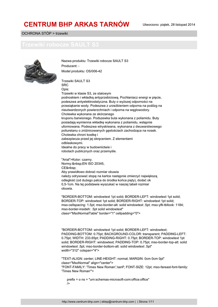 CENTRUM BHP ARKAS TARNÓW Utworzono: piątek, 28 listopad 2014 OCHRONA STÓP > trzewiki Trzewiki robocze SAULT S3 Nazwa produktu: Trzewiki robocze SAULT S3 Producent: Model produktu: OS/006-42 Trzewiki SAULT S3 SRC Opis: Trzewiki w klasie S3, ze stalowym podnoskiem i wkładką antyprzebiciową. Pochłaniacz energi w pięcie, podeszwa antyelektrostatyczna. Buty o wyższej odporności na przesiąkanie wody. Podeszwa z urzeźbieniem odporna na poślizg na nieutwardzonych powierzchniach i odporna na węglowodory. Cholewka wykonana ze skórzanego kruponu barwionego. Podszewka buta wykonana z poliamidu. Buty posiadają wymienna wkładkę wykonana z poliamidu, wstępnie uformowana. Podeszwa wtryskiwana, wykonana z dwuwarstwowego poliuretanu o zróżnicowanych gęstościach zachodząca na nosek. Cholewka chroni kostkę i zabezpiecza przed jej skręceniem. Z elementami odblaskowymi. Idealne do pracy w budownictwie i robotach publicznych oraz przemyśle. "Arial">Kolor: czarny. Normy: EN ISO 20345, CE Aby prawidłowo dobrać rozmiar obuwia należy odrysować stopę na kartce następnie zmierzyć największą odległość (od dużego palca do środka końca pięty), dodać ok 0,5-1cm. Na tej podstawie wyszukać w naszej tabeli rozmiar obuwia. "BORDER-BOTTOM: windowtext 1pt solid; BORDER-LEFT: windowtext 1pt solid; BORDER-TOP: windowtext 1pt solid; BORDER-RIGHT: windowtext 1pt solid; mso-cellspacing: 1.5pt; mso-border-alt: solid windowtext .5pt; mso-yfti-tbllook: 1184; mso-border-insideh: .5pt solid windowtext" class="MsoNormalTable" border="1" cellpadding="0"> "BORDER-BOTTOM: windowtext 1pt solid; BORDER-LEFT: windowtext; PADDING-BOTTOM: 0.75pt; BACKGROUND-COLOR: transparent; PADDING-LEFT: 0.75pt; WIDTH: 233.65pt; PADDING-RIGHT: 0.75pt; BORDER-TOP: windowtext 1pt solid; BORDER-RIGHT: windowtext; PADDING-TOP: 0.75pt; mso-border-top-alt: solid windowtext .5pt; mso-border-bottom-alt: solid windowtext .5pt" width="312" colspan="4"> "TEXT-ALIGN: center; LINE-HEIGHT: normal; MARGIN: 0cm 0cm 0pt" class="MsoNormal" align="center"> "FONT-FAMILY: 'Times New Roman','serif'; FONT-SIZE: 12pt; mso-fareast-font-family: 'Times New Roman'"> prefix = o ns = "urn:schemas-microsoft-com:office:office" /> http://www.centrum-bhp.com | [email protected] | | Strona 1/11 CENTRUM BHP ARKAS TARNÓW Utworzono: piątek, 28 listopad 2014 OCHRONA STÓP > trzewiki Trzewiki robocze SAULT S3 Tabela rozmiarów "BORDER-BOTTOM: windowtext 1pt solid; BORDER-LEFT: windowtext; PADDING-BOTTOM: 0.75pt; BACKGROUND-COLOR: transparent; PADDING-LEFT: 0.75pt; WIDTH: 52.5pt; PADDING-RIGHT: 0.75pt; BORDER-TOP: windowtext 1pt solid; BORDER-RIGHT: windowtext; PADDING-TOP: 0.75pt; mso-border-top-alt: solid windowtext .5pt; mso-border-bottom-alt: solid windowtext .5pt" width="70"> "TEXT-ALIGN: center; LINE-HEIGHT: normal; MARGIN: 0cm 0cm 0pt" class="MsoNormal" align="center"> "FONT-FAMILY: 'Times New Roman','serif'; FONT-SIZE: 12pt; mso-fareast-font-family: 'Times New Roman'"> UK "BORDER-BOTTOM: windowtext 1pt solid; BORDER-LEFT: windowtext; PADDING-BOTTOM: 0.75pt; BACKGROUND-COLOR: transparent; PADDING-LEFT: 0.75pt; WIDTH: 52.5pt; PADDING-RIGHT: 0.75pt; BORDER-TOP: windowtext 1pt solid; BORDER-RIGHT: windowtext; PADDING-TOP: 0.75pt; mso-border-top-alt: solid windowtext .5pt; mso-border-bottom-alt: solid windowtext .5pt" width="70"> "TEXT-ALIGN: center; LINE-HEIGHT: normal; MARGIN: 0cm 0cm 0pt" class="MsoNormal" align="center"> "FONT-FAMILY: 'Times New Roman','serif'; FONT-SIZE: 12pt; mso-fareast-font-family: 'Times New Roman'"> EUR "BORDER-BOTTOM: windowtext 1pt solid; BORDER-LEFT: windowtext; PADDING-BOTTOM: 0.75pt; BACKGROUND-COLOR: transparent; PADDING-LEFT: 0.75pt; WIDTH: 52.5pt; PADDING-RIGHT: 0.75pt; BORDER-TOP: windowtext 1pt solid; BORDER-RIGHT: windowtext; PADDING-TOP: 0.75pt; mso-border-top-alt: solid windowtext .5pt; mso-border-bottom-alt: solid windowtext .5pt" width="70"> "TEXT-ALIGN: center; LINE-HEIGHT: normal; MARGIN: 0cm 0cm 0pt" class="MsoNormal" align="center"> "FONT-FAMILY: 'Times New Roman','serif'; FONT-SIZE: 12pt; mso-fareast-font-family: 'Times New Roman'"> US "BORDER-BOTTOM: windowtext 1pt solid; BORDER-LEFT: windowtext; PADDING-BOTTOM: 0.75pt; BACKGROUND-COLOR: transparent; PADDING-LEFT: 0.75pt; WIDTH: 71.65pt; PADDING-RIGHT: 0.75pt; BORDER-TOP: windowtext 1pt solid; BORDER-RIGHT: windowtext; PADDING-TOP: 0.75pt; mso-border-top-alt: solid windowtext .5pt; mso-border-bottom-alt: solid windowtext .5pt" width="96"> http://www.centrum-bhp.com | [email protected] | | Strona 2/11 CENTRUM BHP ARKAS TARNÓW Utworzono: piątek, 28 listopad 2014 OCHRONA STÓP > trzewiki Trzewiki robocze SAULT S3 "TEXT-ALIGN: center; LINE-HEIGHT: normal; MARGIN: 0cm 0cm 0pt" class="MsoNormal" align="center"> "FONT-FAMILY: 'Times New Roman','serif'; FONT-SIZE: 12pt; mso-fareast-font-family: 'Times New Roman'"> Długosć stopy (cm) "BORDER-BOTTOM: windowtext 1pt solid; BORDER-LEFT: windowtext; PADDING-BOTTOM: 0.75pt; BACKGROUND-COLOR: transparent; PADDING-LEFT: 0.75pt; PADDING-RIGHT: 0.75pt; BORDER-TOP: windowtext 1pt solid; BORDER-RIGHT: windowtext; PADDING-TOP: 0.75pt; mso-border-top-alt: solid windowtext .5pt; mso-border-bottom-alt: solid windowtext .5pt"> "TEXT-ALIGN: center; LINE-HEIGHT: normal; MARGIN: 0cm 0cm 0pt" class="MsoNormal" align="center"> "FONT-FAMILY: 'Times New Roman','serif'; FONT-SIZE: 12pt; mso-fareast-font-family: 'Times New Roman'"> 6,5 "BORDER-BOTTOM: windowtext 1pt solid; BORDER-LEFT: windowtext; PADDING-BOTTOM: 0.75pt; BACKGROUND-COLOR: transparent; PADDING-LEFT: 0.75pt; PADDING-RIGHT: 0.75pt; BORDER-TOP: windowtext 1pt solid; BORDER-RIGHT: windowtext; PADDING-TOP: 0.75pt; mso-border-top-alt: solid windowtext .5pt; mso-border-bottom-alt: solid windowtext .5pt"> "TEXT-ALIGN: center; LINE-HEIGHT: normal; MARGIN: 0cm 0cm 0pt" class="MsoNormal" align="center"> "FONT-FAMILY: 'Times New Roman','serif'; FONT-SIZE: 12pt; mso-fareast-font-family: 'Times New Roman'"> 40 "BORDER-BOTTOM: windowtext 1pt solid; BORDER-LEFT: windowtext; PADDING