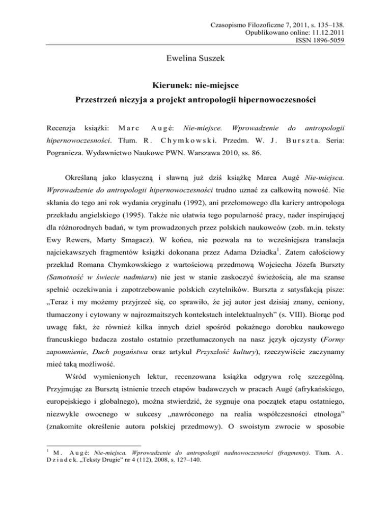 Czasopismo Filozoficzne 7, 2011, s. 135–138. Opublikowano online: 11.12.2011 ISSN 1896-5059 Ewelina Suszek Kierunek: nie-miejsce Przestrzeń niczyja a projekt antropologii hipernowoczesności Recenzja książki: Marc A u g é: hipernowoczesności. Tłum. R . Nie-miejsce. Wprowadzenie C h y m k o w s k i. Przedm. W. J . do antropologii B u r s z t a. Seria: Pogranicza. Wydawnictwo Naukowe PWN. Warszawa 2010, ss. 86. Określaną jako klasyczną i sławną już dziś książkę Marca Augé Nie-miejsca. Wprowadzenie do antropologii hipernowoczesności trudno uznać za całkowitą nowość. Nie skłania do tego ani rok wydania oryginału (1992), ani przełomowego dla kariery antropologa przekładu angielskiego (1995). Także nie ułatwia tego popularność pracy, nader inspirującej dla różnorodnych badań, w tym prowadzonych przez polskich naukowców (zob. m.in. teksty Ewy Rewers, Marty Smagacz). W końcu, nie pozwala na to wcześniejsza translacja najciekawszych fragmentów książki dokonana przez Adama Dziadka1. Zatem całościowy przekład Romana Chymkowskiego z wartościową przedmową Wojciecha Józefa Burszty (Samotność w świecie nadmiaru) nie jest w stanie zaskoczyć świeżością, ale ma szanse spełnić oczekiwania i zapotrzebowanie polskich czytelników. Burszta z satysfakcją pisze: „Teraz i my możemy przyjrzeć się, co sprawiło, że jej autor jest dzisiaj znany, ceniony, tłumaczony i cytowany w najrozmaitszych kontekstach intelektualnych” (s. VIII). Biorąc pod uwagę fakt, że również kilka innych dzieł spośród pokaźnego dorobku naukowego francuskiego badacza zostało ostatnio przetłumaczonych na nasz język ojczysty (Formy zapomnienie, Duch pogaństwa oraz artykuł Przyszłość kultury), rzeczywiście zaczynamy mieć taką możliwość. Wśród wymienionych lektur, recenzowana książka odgrywa rolę szczególną. Przyjmując za Bursztą istnienie trzech etapów badawczych w pracach Augé (afrykańskiego, europejskiego i globalnego), można stwierdzić, że sygnuje ona początek etapu ostatniego, niezwykle owocnego w sukcesy „nawróconego na realia współczesności etnologa” (znakomite określenie autora polskiej przedmowy). O swoistym zwrocie w sposobie 1 M . A u g é: Nie-miejsca. Wprowadzenie do antropologii nadnowoczesności (fragmenty). Tłum. A . D z i a d e k. „Teksty Drugie” nr 4 (112), 2008, s. 127–140. uprawiania antropologii można wnioskować z samych wypowiedzi Augé: „To nie antropologia, znudzona egzotycznymi obszarami, zwraca się w stronę horyzontów bardziej swojskich, gotowa wyzbyć się swojej ciągłości […], lecz sam świat współczesny, z uwagi na coraz szybsze przemiany, przyciąga spojrzenie antropologów […]”. Nie-miejsca bywają więc traktowane również jako przejście od badań szczegółowych do refleksji z zakresu antropologii kulturowej i filozoficznej. Interdyscyplinarny charakter rozważań uwidacznia się szczególnie w swobodzie, płynności i wielorakości odwołań zarówno do zjawisk pochodzących z kultury masowej, jak i do urozmaiconych pod względem metodologicznym tekstów naukowych (socjologicznych, antropologicznych, filozoficznych…), a także literackich. Nie dziwi zatem, że Nie-miejsca ukazały się w serii „Pogranicza”. Tym natomiast, co może zaskakiwać, jest zestawienie wielości odniesień z niedużymi rozmiarami książki – to uświadamia, jak merytorycznie bogaty esej czytelnik dostaje do ręki. Nie tylko merytorycznie bogaty, ale także kompozycyjnie przemyślany. Składa się on z trzech rozdziałów („Bliskie” i „gdzie indziej”, „Miejsce antropologiczne”, „Od miejsc do nie-miejsc”) oraz Przedmowy i Epilogu, które tworzą swoistą klamrę kompozycyjną i stanowią, poprzez losy podróżującego Pierre’a Duponta (współczesny Każdy), egzemplifikację tez wygłoszonych w tekście głównym. Najbardziej cenioną częścią rozważań jest koncepcja tytułowych nie-miejsc, zapewne także dlatego, iż świetnie wpisuje się w silnie eksploatowaną w ostatnich latach problematykę percepcji przestrzeni wobec zmian cywilizacyjnych. Taką też perspektywę badawczą przyjmuje autor, traktujący analizowany fenomen jako wytwór i przejaw kultury hipernowoczesnej, a więc kultury, dla której symbolem jest, opisywana szeroko w pierwszym rozdziale, figura trzech nadmiarów: czasu (przyspieszenie historii), przestrzeni (zmiana skali, przemieszczenie parametrów) oraz ego (indywidualizacja odniesień). Dodatkowo, w charakterystyce, jakiej dokonuje Augé, budowanie opozycji również wydaje się być chwytem metodologicznym – nie sposób bowiem zrozumieć hipernowoczesności bez skontrastowania z nowoczesnością, a nie-miejsca bez odniesienia do tego, czego negację stanowią. Tradycyjne pojęcie miejsca, którym przez lata posługiwali się etnolodzy i socjolodzy, zakłada silny związek z „[...] kulturą zlokalizowaną w czasie i przestrzeni” (s. 20), łączy się zatem z tworzeniem relacji, zanurzeniem w historyczność oraz poczuciem tożsamości: „Rodzić się znaczy rodzić się w pewnym miejscu, być przypisanym do pewnego miejsca zamieszkania. W tym sensie miejsce narodzin jest konstytutywne dla tożsamości jednostkowej” (s. 34). 136 Tak rozumianemu miejscu antropologicznemu zagraża (nigdy do końca skutecznie) ekspansja nie-miejsc – przestrzeni niczyjej, nierelacyjnej, niehistorycznej, nietożsamościowej (co najwyżej tymczasowo-tożsamościowej), odpowiadającej wymogom wzrostu przyspieszenia wszystkiego i zapotrzebowaniom człowieka hipernowoczesnego. Chodzi o lotniska, dworce, porty, stacje, sieci hotelowe, supermarkety, węzły komunikacyjne, środki transportu, autostrady…, czyli – niezależnie od ich lokalizacji – miejsca nadzwyczaj podobne do siebie, prawie nieodróżnialne, wytwarzające, poprzez zastosowanie odpowiednich norm, reguł, zasad, zawarte umowy (pokazanie dokumentu/dowodu) pewien typ ludzi – w tłumie anonim