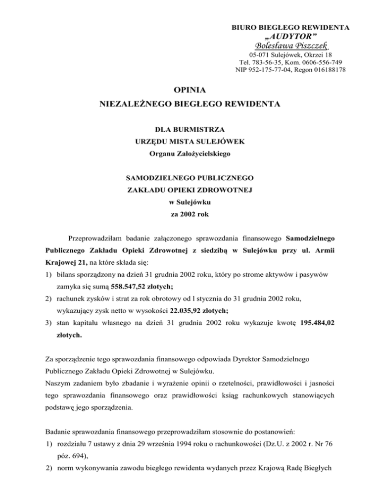 BIURO BIEGŁEGO REWIDENTA „AUDYTOR” Bolesława Piszczek 05-071 Sulejówek, Okrzei 18 Tel. 783-56-35, Kom. 0606-556-749 NIP 952-175-77-04, Regon 016188178 OPINIA NIEZALEŻNEGO BIEGŁEGO REWIDENTA DLA BURMISTRZA URZĘDU MISTA SULEJÓWEK Organu Założycielskiego SAMODZIELNEGO PUBLICZNEGO ZAKŁADU OPIEKI ZDROWOTNEJ w Sulejówku za 2002 rok Przeprowadziłam badanie załączonego sprawozdania finansowego Samodzielnego Publicznego Zakładu Opieki Zdrowotnej z siedzibą w Sulejówku przy ul. Armii Krajowej 21, na które składa się: 1) bilans sporządzony na dzień 31 grudnia 2002 roku, który po strome aktywów i pasywów zamyka się sumą 558.547,52 złotych; 2) rachunek zysków i strat za rok obrotowy od l stycznia do 31 grudnia 2002 roku, wykazujący zysk netto w wysokości 22.035,92 złotych; 3) stan kapitału własnego na dzień 31 grudnia 2002 roku wykazuje kwotę 195.484,02 złotych. Za sporządzenie tego sprawozdania finansowego odpowiada Dyrektor Samodzielnego Publicznego Zakładu Opieki Zdrowotnej w Sulejówku. Naszym zadaniem było zbadanie i wyrażenie opinii o rzetelności, prawidłowości i jasności tego sprawozdania finansowego oraz prawidłowości ksiąg rachunkowych stanowiących podstawę jego sporządzenia. Badanie sprawozdania finansowego przeprowadziłam stosownie do postanowień: 1) rozdziału 7 ustawy z dnia 29 września 1994 roku o rachunkowości (Dz.U. z 2002 r. Nr 76 póz. 694), 2) norm wykonywania zawodu biegłego rewidenta wydanych przez Krajową Radę Biegłych Rewidentów w Polsce (Biuletyn KIBR Nr 53 z 2002 r.), 3) Ustawy o Zakładach Opieki Zdrowotnej (Dz.U. Nr 91 póz. 408 z dnia 14.10.1991 r.) z późniejszymi zmianami, 4) Ustawy o finansach publicznych z dnia 26 listopada 1998 r. (Dz.U. Nr 155 póz. 1014) teks jednolity ogłoszony w (Dz.U. Nr 15 póz. 148) w 2003 roku. Obwieszczenie Marszałka Sejmu Rzeczpospolitej Polskiej z dnia 7 stycznia 2003 r. Badanie sprawozdania finansowego zaplanowałam i przeprowadziłam w taki sposób, aby uzyskać racjonalną pewność, pozwalającą na wyrażenie opinii o sprawozdaniu. W szczególności badanie obejmowało sprawdzenie poprawności zastosowanych przez jednostkę zasad (polityki) rachunkowości i znaczących szacunków, sprawdzenie - w przeważającej mierze w sposób wyrywkowy - dowodów i zapisów księgowych, z których wynikają liczby i informacje zawarte w sprawozdaniu finansowym, jak i całościową ocenę sprawozdania finansowego. Uważam, że badanie dostarczyło wystarczającej podstawy do wyrażenia miarodajnej opinii. Jednostka sporządzająca sprawozdanie za 2001 r. przeksięgowała zysk 2001 r. w kwocie 70.617,42 zł w ciężar straty 2000 roku. Niezgodnie w rozumieniu art. 53 pkt. 3 i art. 54 pkt. l ustawy o rachunkowości. Gdyby zysk ten zgodnie z przepisami wykazano zgodnie z ustawą, wartość bilansowa sald wykazywałaby kwotę 70.617,42 zł, a nie jak ustalono błędnie 8.244,31 złotych. Uzgodnienie sald do bilansu za 2001 rok trwało do października 2002 roku, korekty były przeprowadzane w obrotach roku 2001 i w księgach 2002 roku w sposób sprzeczny z zasadami art. 12 pkt. 5 ustawy o rachunkowości. Zamknięcie ksiąg rachunkowych polega na nieodwracalnym wyłączeniu możliwości dokonywania zapisów księgowych w zbiorach tworzących zamknięcie ksiąg rachunkowych z uwzględnieniem art. 13 ust. 2 i 3 ustawy o rachunkowości. Jednostka wbrew obowiązującym zasadom rachunkowości, w wielu przypadkach dokonywała w dowodach księgowych zamazywań i poprawek w dowodach dotyczących rozrachunków z pracownikami. Niezgodnie z art. 22 pkt. l oraz art. 23 pkt- l ustawy o rachunkowości. Naszym zdaniem, z wyjątkiem zgłoszonego wyżej zastrzeżenia, zbadane sprawozdanie finansowe, obejmujące dane liczbowe i objaśnienia słowne: a) przedstawia rzetelnie i jasno wszystkie informacje istotne dla oceny sytuacji majątkowej i finansowej badanego Zakładu na dzień 31.12.2002 roku, jak też jej wyniku finansowego za rok obrotowy od 01.01.2002 roku do 31.12.2002 roku, b) sporządzone zostało, we wszystkich istotnych aspektach, zgodnie z określonymi w powołanej wyżej ustawie zasadami rachunkowości oraz na podstawie prawidłowo prowadzonych ksiąg rachunkowych, c) jest zgodne z wpływającymi na treść sprawozdania finansowego przepisami prawa i postanowieniami statutu Zakładu. Sprawozdanie z działalności Zakładu jest kompletne w rozumieniu art. 49 ust. 2 ustawy o rachunkowości, a zawarte w nim informacje obejmują dalszy rozwój Zakładu. Przeprowadzone badanie sprawozdania finansowego za 2002 rok Samodzielnego Publicznego Zakładu Opieki Zdrowotnej w Sulejówku nie 'wynikało z obowiązku art. 64 ustawy o rachunkowości (-) Bolesława Piszczek Biegły Rewident Nr ewid. 3146/676 DYREKTOR Biura Biegłego Rewidenta „AUDYTOR" (-) Bolesława Piszczek Biegły Rewident nr. ewid. 3146/676 W imieniu Biura Biegłego Rewidenta „ AUDYTOR" Bolesławy Piszczek wpisanej na listę podmiotów uprawnionych do badania sprawozdań finansowych pod pozycją 2006. (-) Bolesława Piszczek Biuro Biegłego Rewidenta „ AUDYTOR" 05-071 Sulejówek ul. Okrzei 18 Sulejówek,7 lipiec 2003 rok