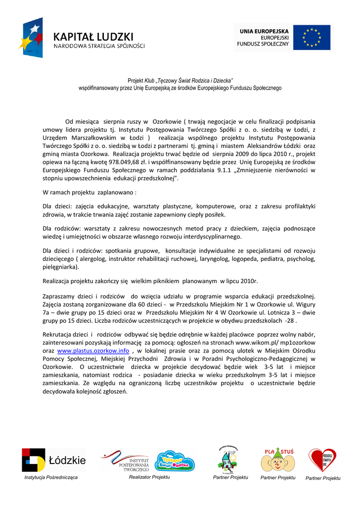 Projekt Klub „Tęczowy Świat Rodzica i Dziecka” współfinansowany przez Unię Europejską ze środków Europejskiego Funduszu Społecznego Od miesiąca sierpnia ruszy w Ozorkowie ( trwają negocjacje w celu finalizacji podpisania umowy lidera projektu tj. Instytutu Postępowania Twórczego Spółki z o. o. siedzibą w Łodzi, z Urzędem Marszałkowskim w Łodzi ) realizacja wspólnego projektu Instytutu Postępowania Twórczego Spółki z o. o. siedzibą w Łodzi z partnerami tj. gminą i miastem Aleksandrów Łódzki oraz gminą miasta Ozorkowa. Realizacja projektu trwać będzie od sierpnia 2009 do lipca 2010 r., projekt opiewa na łączną kwotę 978.049,68 zł. i współfinansowany będzie przez Unię Europejską ze środków Europejskiego Funduszu Społecznego w ramach poddziałania 9.1.1 „Zmniejszenie nierówności w stopniu upowszechnienia edukacji przedszkolnej”. W ramach projektu zaplanowano : Dla dzieci: zajęcia edukacyjne, warsztaty plastyczne, komputerowe, oraz z zakresu profilaktyki zdrowia, w trakcie trwania zajęć zostanie zapewniony ciepły posiłek. Dla rodziców: warsztaty z zakresu nowoczesnych metod pracy z dzieckiem, zajęcia podnoszące wiedzę i umiejętności w obszarze własnego rozwoju interdyscyplinarnego. Dla dzieci i rodziców: spotkania grupowe, konsultacje indywidualne ze specjalistami od rozwoju dziecięcego ( alergolog, instruktor rehabilitacji ruchowej, laryngolog, logopeda, pediatra, psycholog, pielęgniarka). Realizacja projektu zakończy się wielkim piknikiem planowanym w lipcu 2010r. Zapraszamy dzieci i rodziców do wzięcia udziału w programie wsparcia edukacji przedszkolnej. Zajęcia zostaną zorganizowane dla 60 dzieci - w Przedszkolu Miejskim Nr 1 w Ozorkowie ul. Wigury 7a – dwie grupy po 15 dzieci oraz w Przedszkolu Miejskim Nr 4 W Ozorkowie ul. Lotnicza 3 – dwie grupy po 15 dzieci. Liczba rodziców uczestniczących w projekcie w obydwu przedszkolach -28 . Rekrutacja dzieci i rodziców odbywać się będzie odrębnie w każdej placówce poprzez wolny nabór, zainteresowani pozyskają informację za pomocą: ogłoszeń na stronach www.wikom.pl/ mp1ozorkow oraz www.plastus.ozorkow.info , w lokalnej prasie oraz za pomocą ulotek w Miejskim Ośrodku Pomocy Społecznej, Miejskiej Przychodni Zdrowia i w Poradni Psychologiczno-Pedagogicznej w Ozorkowie. O uczestnictwie dziecka w projekcie decydować będzie wiek 3-5 lat i miejsce zamieszkania, natomiast rodzica - posiadanie dziecka w wieku przedszkolnym 3-5 lat i miejsce zamieszkania. Ze względu na ograniczoną liczbę uczestników projektu o uczestnictwie będzie decydowała kolejność zgłoszeń. Instytucja Pośrednicząca Realizator Projektu Partner Projektu Partner Projektu Partner Projektu
