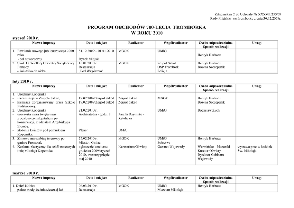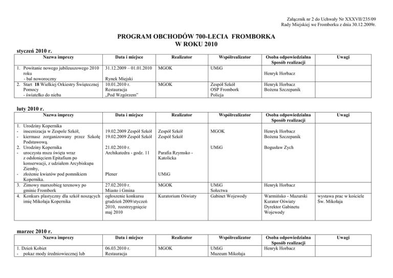 Załącznik nr 2 do Uchwały Nr XXXVII/235/09 Rady Miejskiej we Fromborku z dnia 30.12.2009r. PROGRAM OBCHODÓW 700-LECIA FROMBORKA W ROKU 2010 styczeń 2010 r. Nazwa imprezy Data i miejsce 1. Powitanie nowego jubileuszowego 2010 roku - bal noworoczny 2. Start 18 Wielkiej Orkiestry Świątecznej Pomocy - światełko do nieba 31.12.2009 – 01.01.2010 Realizator MGOK Współrealizator Osoba odpowiedzialna Sposób realizacji Uwagi UMiG Henryk Horbacz Rynek Miejski 10.01.2010 r. Restauracja „Pod Wzgórzem” MGOK Zespół Szkół OSP Frombork Policja Henryk Horbacz BoŜena Szczepanik luty 2010 r. Nazwa imprezy 1. Urodziny Kopernika - inscenizacja w Zespole Szkół, - kiermasz zorganizowany przez Szkołę Podstawową. 2. Urodziny Kopernika - uroczysta msza święta wraz z odsłonięciem Epitafium po konserwacji, z udziałem Arcybiskupa Ziemby, - złoŜenie kwiatów pod pomnikiem Kopernika. 3. Zimowy marszobieg terenowy po gminie Frombork 4. Konkurs plastyczny dla szkół noszących imię Mikołaja Kopernika Data i miejsce 19.02.2009 Zespół Szkół 19.02.2009 Zespół Szkół 21.02.2010 r. Archikatedra - godz. 11 Realizator Zespół Szkół Zespół Szkół Współrealizator Osoba odpowiedzialna Sposób realizacji MGOK Henryk Horbacz BoŜena Szczepanik UMiG Bogusław Zych UMiG Sołectwa Gabinet Wojewody Henryk Horbacz Uwagi Parafia Rzymsko Katolicka Plener UMiG 27.02.2010 r. Miasto i Gmina ogłoszenie konkursu grudzień 2009/styczeń 2010, rozstrzygnięcie maj 2010 MGOK Kuratorium Oświaty Warmińsko - Mazurski Kurator Oświaty Dyrektor Gabinetu Wojewody wystawa prac w kościele Św. Mikołaja marzec 2010 r. Nazwa imprezy 1. Dzień Kobiet - pokaz mody średniowiecznej lub Data i miejsce 06.03.2010 r. Restauracja Realizator MGOK Współrealizator UMiG Muzeum Mikołaja Osoba odpowiedzialna Sposób realizacji Henryk Horbacz Uwagi 2 renesansowej wybór kandydatki na Annę Szyling oraz kandydata na Kopernika 2. 1 Fromborski Zjazd Krystyn i BoŜen Frombork 2010 „Pod Wzgórzem” Kopernika 13. 03.2010 r. Frombork Komitet Organizacyjny Zjazdu UMiG MROK Zespół Szkół Krystyna Lewańska BoŜena Szczepanik 3. 3 Konkurs potraw, palm i pisanek wielkanocnych 26.03.2010 r. Wielkie Wierzno MGOK KGW Wielkie Wierzno Henryk Horbacz Data i miejsce Realizator Współrealizator Przedstawiciele świata nauki z miast Kopernikowskich MGOK Urząd Wojewódzki w Olsztynie Osoba odpowiedzialna Sposób realizacji Gabinet Wojewody Leonard Kotowski Wojewódzki Związek BrydŜa Sportowego Henryk Horbacz Realizator Współrealizator 02.05.2010 r. Plener 2. Zlot przedstawicieli szkół noszących imię 7 - 8.05. Mikołaja Kopernika lub 8 - 9.05.2010 r. MGOK UMiG Rybacy fromborscy Kuratorium Oświaty Osoba odpowiedzialna Sposób realizacji Henryk Horbacz 3. DruŜynowe Mistrzostwa Świata 11 - 16.05.2010 r. w warcabach klasycznych Obiekty na terenie miasta 4. Uroczysty pochówek Mikołaja Kopernika 22.05.2010 r. Archikatedra Światowa Federacja Gier Warcabowych Kuria Biskupia i Kapituła Warmińska - kwiecień 2010 r. Nazwa imprezy 1. Debata popularno - naukowa na temat 9 lub 16.04.2010 r. toŜsamości Mikołaja Kopernika, jego roli Szpital Św. Ducha i historii 2. Grand Prix Warmii, śuław oraz Kujaw 14.04.2010 r. w BrydŜu sportowym Uwagi maj 2010 r. Nazwa imprezy Data i miejsce 1. Fromborskie Święto Rybaka Zespół Szkół we Fromborku UMiG, MGOK, Andrzej Grodecki Parafia RzymskoKatolicka UMiG Uwagi Małgorzata Bogdanowicz Bartnikowska Maria Rogińska BoŜena Szczepanik Henryk Horbacz Reprezentacje ze sztandarami Krystyna Lewańska Toruńska Orkiestra Symfoniczna, występ chóru Astrolabium z WyŜszej Szkoły Bankowej w Toruniu "Cosmopolis" pod batutą Krzesimira Dębskiego 3 5. Inscenizacja uroczystego Kopernika do Fromborka wjazdu 28.05.2010 r. Okolice Wzgórza Katedralnego 6. Widowisko teatralne na Wzgórzu 28.05.2010 r. Wzgórze Katedralnym - premiera Katedralne 7. Zlot Honorowych Obywateli Fromborka 28-30.05.2010 r. Frombork UMiG 8. Zlot Gwiaździsty - Centralny Rajd Kopernikowski - trasy piesze, rowerowe i motocyklowe 28 - 30.05.2010 r. Frombork 9. Ogólnopolski Zjazd Drezyniarzy 10. Międzynarodowe zawody LOK w strzelaniu sportowym plus Bieg na orientację 11. Główne obchody 700-lecia nadania praw miejskich z udziałem Miast Kopernikowskich - cykl imprez sportowo - rekreacyjnych - parada orkiestr mundurowych 12. Otwarcie wystawy „Widoki Fromborka” Teatr im. A. Sewruka w Elblągu Zespół Honorowych Obywateli Fromborka Teatr im. A. Sewruka w Elblągu, Zespół Szkół UMiG Zbigniew Kędziora Mirosław Siedler UMiG Komenda Chorągwi ZHP Jacek Iwulski KT PTTK „Figa” Braniewo PTTK Oddział Ziemi Elbląskiej UMiG Zbigniew Kędziora Marian Tomaszewski 29 - 30.05.2010 r. Okolice Dworca PKP UMiG Zbigniew Kędziora 08.05.2010 r. Strzelnica sportowa nad Baudą 29 - 30.05.2010 r. Teren miasta i gminy LOK PienięŜno Ogólnopolskie Stowarzyszenie Drezyniarzy MGOK, 16 Dywizja Zmechanizowana, UMiG 29.05.2009 r. Muzeum M. Kopernika Muzeum M. Kopernika Połączyć 2 rajdy kopernikowskie: od śuław i z Warmii (trasa 1-dniowa, rajd cykliczny) Henryk Horbacz Data do ustalenia Henryk Horbacz Wg oddzielnego scenariusza Małgorzata Czupajło Wyeksponowanie materiałów związanych z odbudową Wzgórza Katedralnego MGOK UMiG Zespół ds. imprez popularno - naukowych czerwiec 2010 r. Nazwa imprezy Data i miejsce Realizator Współrealizator 1. 3 Zlot Turystyczny „Starych butów” 04 - 06.06.2010 r. Camping Oddział PTTK Ziemi Elbląskiej KT PTTK „Figa” UMiG 2. Obchody 750-lecia Kapituły Warmińskiej Archikatedra Kuria Biskupia i Kapituła Warmińska 3. Noc Świętojańska. Festiwal Piosenki Harcerskiej 20.06.2010 r. Teren miasta MGOK Parafia Rzymsko Katolicka UMiG Hufce ZHP Braniewo i Elbląg Osoba odpowiedzialna Sposób realizacji Zbigniew Kędziora Krystyna Lewańska Henryk Horbacz Uwagi Wg osobnego scenariusza 4 4. Piknik rycerski pn. „Wojna głodowa 1414” w ramach Warmińskich Spotkań z Historią. 5. 4 
