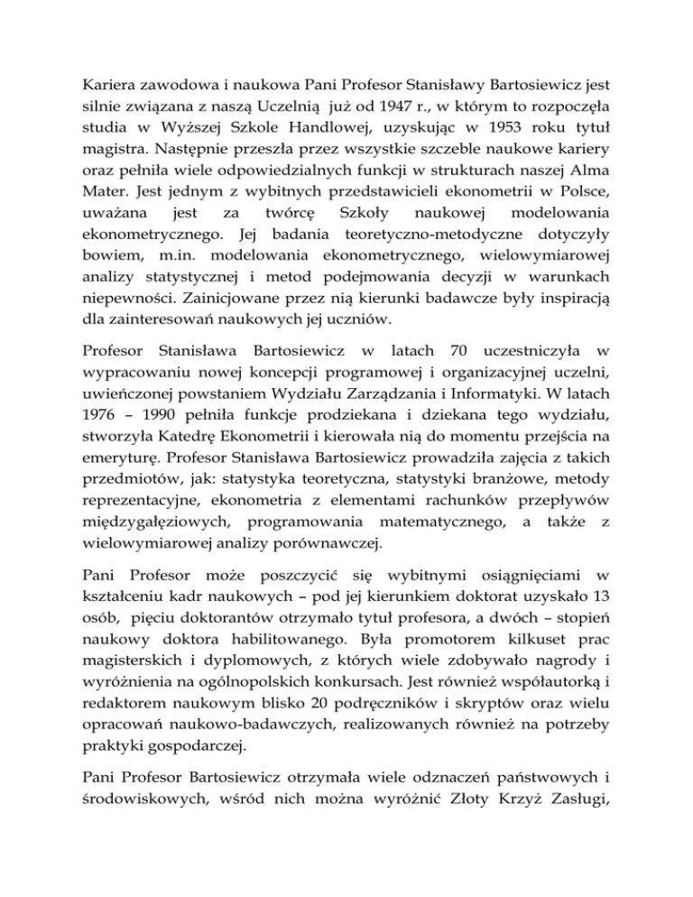 Kariera zawodowa i naukowa Pani Profesor Stanisławy Bartosiewicz jest silnie związana z naszą Uczelnią już od 1947 r., w którym to rozpoczęła studia w Wyższej Szkole Handlowej, uzyskując w 1953 roku tytuł magistra. Następnie przeszła przez wszystkie szczeble naukowe kariery oraz pełniła wiele odpowiedzialnych funkcji w strukturach naszej Alma Mater. Jest jednym z wybitnych przedstawicieli ekonometrii w Polsce, uważana jest za twórcę Szkoły naukowej modelowania ekonometrycznego. Jej badania teoretyczno-metodyczne dotyczyły bowiem, m.in. modelowania ekonometrycznego, wielowymiarowej analizy statystycznej i metod podejmowania decyzji w warunkach niepewności. Zainicjowane przez nią kierunki badawcze były inspiracją dla zainteresowań naukowych jej uczniów. Profesor Stanisława Bartosiewicz w latach 70 uczestniczyła w wypracowaniu nowej koncepcji programowej i organizacyjnej uczelni, uwieńczonej powstaniem Wydziału Zarządzania i Informatyki. W latach 1976 – 1990 pełniła funkcje prodziekana i dziekana tego wydziału, stworzyła Katedrę Ekonometrii i kierowała nią do momentu przejścia na emeryturę. Profesor Stanisława Bartosiewicz prowadziła zajęcia z takich przedmiotów, jak: statystyka teoretyczna, statystyki branżowe, metody reprezentacyjne, ekonometria z elementami rachunków przepływów międzygałęziowych, programowania matematycznego, a także z wielowymiarowej analizy porównawczej. Pani Profesor może poszczycić się wybitnymi osiągnięciami w kształceniu kadr naukowych – pod jej kierunkiem doktorat uzyskało 13 osób, pięciu doktorantów otrzymało tytuł profesora, a dwóch – stopień naukowy doktora habilitowanego. Była promotorem kilkuset prac magisterskich i dyplomowych, z których wiele zdobywało nagrody i wyróżnienia na ogólnopolskich konkursach. Jest również współautorką i redaktorem naukowym blisko 20 podręczników i skryptów oraz wielu opracowań naukowo-badawczych, realizowanych również na potrzeby praktyki gospodarczej. Pani Profesor Bartosiewicz otrzymała wiele odznaczeń państwowych i środowiskowych, wśród nich można wyróżnić Złoty Krzyż Zasługi, Krzyż Kawalerski i Oficerski Orderu Odrodzenia Polski, Medal KEN. Nasza Uczelnia uhonorowała Profesor Stanisławę Bartosiewicz tytułem Honorowego Profesora Uniwersytetu Ekonomicznego we Wrocławiu. Tytuł Kryształowy Alumnus nadany w imieniu Uniwersytetu Ekonomicznego jest wyrazem uznania dla wieloletnich dokonań Pani Profesor w pracy naukowej i dydaktycznej oraz podziwu dla tak aktywnej postawy zaangażowania w pracę dla środowiska akademickiego.