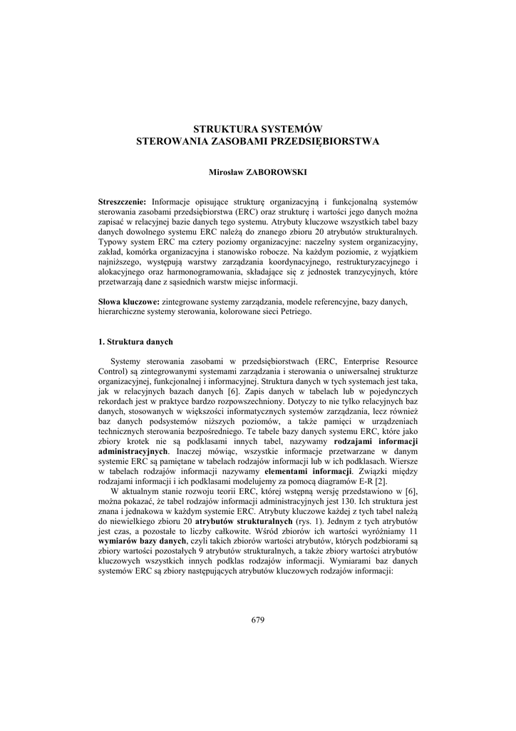STRUKTURA SYSTEMÓW STEROWANIA ZASOBAMI PRZEDSIĘBIORSTWA Mirosław ZABOROWSKI Streszczenie: Informacje opisujące strukturę organizacyjną i funkcjonalną systemów sterowania zasobami przedsiębiorstwa (ERC) oraz strukturę i wartości jego danych można zapisać w relacyjnej bazie danych tego systemu. Atrybuty kluczowe wszystkich tabel bazy danych dowolnego systemu ERC należą do znanego zbioru 20 atrybutów strukturalnych. Typowy system ERC ma cztery poziomy organizacyjne: naczelny system organizacyjny, zakład, komórka organizacyjna i stanowisko robocze. Na każdym poziomie, z wyjątkiem najniższego, występują warstwy zarządzania koordynacyjnego, restrukturyzacyjnego i alokacyjnego oraz harmonogramowania, składające się z jednostek tranzycyjnych, które przetwarzają dane z sąsiednich warstw miejsc informacji. Słowa kluczowe: zintegrowane systemy zarządzania, modele referencyjne, bazy danych, hierarchiczne systemy sterowania, kolorowane sieci Petriego. 1. Struktura danych Systemy sterowania zasobami w przedsiębiorstwach (ERC, Enterprise Resource Control) są zintegrowanymi systemami zarządzania i sterowania o uniwersalnej strukturze organizacyjnej, funkcjonalnej i informacyjnej. Struktura danych w tych systemach jest taka, jak w relacyjnych bazach danych [6]. Zapis danych w tabelach lub w pojedynczych rekordach jest w praktyce bardzo rozpowszechniony. Dotyczy to nie tylko relacyjnych baz danych, stosowanych w większości informatycznych systemów zarządzania, lecz również baz danych podsystemów niższych poziomów, a także pamięci w urządzeniach technicznych sterowania bezpośredniego. Te tabele bazy danych systemu ERC, które jako zbiory krotek nie są podklasami innych tabel, nazywamy rodzajami informacji administracyjnych. Inaczej mówiąc, wszystkie informacje przetwarzane w danym systemie ERC są pamiętane w tabelach rodzajów informacji lub w ich podklasach. Wiersze w tabelach rodzajów informacji nazywamy elementami informacji. Związki między rodzajami informacji i ich podklasami modelujemy za pomocą diagramów E-R [2]. W aktualnym stanie rozwoju teorii ERC, której wstępną wersję przedstawiono w [6], można pokazać, że tabel rodzajów informacji administracyjnych jest 130. Ich struktura jest znana i jednakowa w każdym systemie ERC. Atrybuty kluczowe każdej z tych tabel należą do niewielkiego zbioru 20 atrybutów strukturalnych (rys. 1). Jednym z tych atrybutów jest czas, a pozostałe to liczby całkowite. Wśród zbiorów ich wartości wyróżniamy 11 wymiarów bazy danych, czyli takich zbiorów wartości atrybutów, których podzbiorami są zbiory wartości pozostałych 9 atrybutów strukturalnych, a także zbiory wartości atrybutów kluczowych wszystkich innych podklas rodzajów informacji. Wymiarami baz danych systemów ERC są zbiory następujących atrybutów kluczowych rodzajów informacji: 679 (q) q∈Q - numery parametrów zasobów (m, s, c, w, k, j, b, o, g, p, z, v, n, nn, e, l, h, t, y, q) xq(m, s, c, w, k, j, b, o, g, p, z, v, n, nn, e, l, h, t, y, q) – wektor wartości atrybutów opisowych q-tego parametru określonego zasobu w określonym wykonaniu czynności umiejscowionej lub w określonej fazie danego okresu czasu h∈H - numery skal czasu t ∈T - chwile próbkowania y∈Y - numery faz przetwarzania danych (h, t, y) identyfikatory okresów czasu i ich faz (m, k, b, o, z, n, e) (m, s, c, w, k, j, b, o, g, p, z, v, n, nn, e, identyfikatory informacji o bytach czynnych i biernych m∈M k∈K b∈B o∈O z∈Z n∈N e∈E numery szeroko pojętych miejsc informacji (w tym informacji o systemach organizacyjnych) numery szeroko pojętych tranzycji w określonym systemie organizacyjnym numery bazowych układów sterowania w określonych systemach elementarnych numery rodzajów szeroko pojętych czynności numery rodzajów zasobów uogólnionych (szeroko pojętych zasobów i informacji) numery szeroko pojętych wykonań określonych czynności umiejscowionych numery egzemplarzy lub partii określonych zasobów uogólnionych Rys.1. Poglądowy diagram struktury kostki danych w szkieletowym systemie ERC m z e q numer szeroko rozumianych miejsc informacji, m∈M, numer rodzajów zasobów uogólnionych, obejmujących zarówno zasoby, jak i informacje administracyjne, z∈Z = R ∪ I, numer egzemplarzy i partii zasobów uogólnionych danego rodzaju, e∈E, (z, e)∈EZ ⊂ Z × E, numer parametrów zasobów, q∈Q, 680 o k b n h t y numer szeroko rozumianych rodzajów czynności, o∈O, numer szeroko rozumianych tranzycji w danym systemie organizacyjnym, k∈K, (s, k)∈TR⊂ S × K, numer bazowych układów sterowania w danym systemie elementarnym, b∈B, (s, b)∈SB⊂ S × B, numer szeroko rozumianych wykonań czynności umiejscowionych, n∈N, przykład: zlecenie produkcyjne (s, o, n)∈S × O × N, numer skal czasu i poziomów organizacyjnych, h∈H, chwile początkowe okresów próbkowania w danej skali czasu, t∈T, (h, t)∈HT⊂ H × T, numer faz przetwarzania danych w danej skali czasu, y∈Y, (h, y)∈HY⊂ H × Y, Pozostałe atrybuty strukturalne to s numer systemów i podsystemów organizacyjnych i roboczych, s∈S, S = S(MS), MS⊂M, który jest funkcją numeru „m” miejsc informacji z ich określonego podzbioru, oraz numery bytów zagregowanych, do których należą inne byty indeksowane przez atrybuty należące do tych samych wymiarów: c numer kont agregacji miejsc informacji, c∈C⊂ M, v numer kategorii zasobów, v∈V⊂ R⊂ Z, l numer partii zasobów, l∈L⊂ E, g numer grup czynności, g∈G⊂ O, p numer rodzajów procesów, czyli rodzajów czynności nadrzędnych, p∈P⊂ O, j numer jednostek tranzycyjnych w danym systemie organizacyjnym, j∈J⊂ K, (s, j)∈TJ⊂ S × J, TJ⊂ TR, w numer systemów i podsystemów roboczych, w∈W⊂ S, nn numer zleceń zagregowanych, nn∈NN⊂ N, grupujących podzlecenia „n” utworzone z rozmaitych powodów, w tym zlecenia wykonania czynności należących do teg