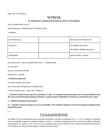 Sygn. akt I ACa 408/15 WYROK W IMIENIU RZECZYPOSPOLITEJ POLSKIEJ Dnia 2 października 2015 r. Sąd Apelacyjny w Białymstoku I Wydział Cywilny w składzie: Przewodniczący : SSA Krzysztof Chojnowski Sędziowie : SA Elżbieta Borowska SA Elżbieta Bieńkowska (spr.) Protokolant : Sylwia Radek - Łuksza po rozpoznaniu w dniu 2 października 2015 r. w Białymstoku na rozprawie sprawy z powództwa E. B. przeciwko (...)w W. o zadośćuczynienie na skutek apelacji obu stron od wyroku Sądu Okręgowego w Białymstoku z dnia 18 lutego 2015 r. sygn. akt I C 883/14 I. zmienia zaskarżony wyrok w punkcie I o tyle, że zasądza od pozwanego na rzecz powódki kwotę 80.000 (osiemdziesiąt tysięcy) złotych z ustawowymi odsetkami od dnia 24 kwietnia 2014 roku; II. oddala apelację pozwanego; III. zasądza od pozwanego na rzecz powódki 2.196 złotych tytułem zwrotu kosztów postępowania odwoławczego. (...) UZASADNIENIE Powódka E. B. po ostatecznym sprecyzowaniu powództwa wnosiła o zasądzenie od (...) w W. w związku ze śmiercią syna w wypadku drogowym, mającym miejsce w dniu (...), tytułem zadośćuczynienia za naruszenie dóbr osobistych na podstawie art. 448 k.c. w zw. z art. 24 § 1 k.c. łącznej kwoty 90.000 złotych wraz z ustawowymi odsetkami od dnia 24 kwietnia 2014 roku do dnia zapłaty, a także kosztów procesu. Pozwana (...) w W. wnosiła o oddalenie powództwa w całości, żądając również zasądzenia od powódki na jej rzecz kosztów postępowania, w tym kosztów zastępstwa procesowego, według norm przepisanych. Wskazywała, że żądane zadośćuczynienie jest nadmierne. Wyrokiem z dnia 18 lutego 2015 roku Sąd Okręgowy w Białymstoku zasądził od pozwanej na rzecz powódki kwotę 80.000 złotych wraz z odsetkami w wysokości 8% do dnia zapłaty (pkt I), oddalił powództwo w pozostałym zakresie (pkt III), umorzył postępowanie o zapłatę kwoty 10.000 złotych (pkt III), a także zasądził od pozwanej na rzecz powódki kwotę 5.118,95 złotych tytułem zwrotu kosztów sądowych oraz kwotę 3.617 złotych tytułem zwrotu kosztów zastępstwa procesowego (pkt IV). Powyższe orzeczenie zostało oparte na następujących ustaleniach faktycznych. W dniu (...) w S. kierujący samochodem osobowym marki F. (...) o nr rej. (...) umyślnie naruszył zasady bezpieczeństwa w ruchu lądowym w ten sposób, że przekroczył dopuszczalną prędkość, prowadząc ten pojazd w terenie zabudowanym z prędkością 95 km/h, przez co na łuku drogi utracił kontrolę nad samochodem i uderzył nim w drzewo. Na skutek opisanego zdarzenia, w wyniku doznanych obrażeń ciała, śmierć poniósł pasażer pojazdu – Ł. B., syn powódki. Prawomocnym wyrokiem Sądu Rejonowego w Bielsku Podlaskim II Wydziału Karnego z dnia 2 grudnia 2002 roku wydanym w sprawie II K 555/02 sprawca zdarzenia został uznany winnym popełnienia czynu z art. 177 § 2 k.k., a następnie skazany na karę 2 lat pozbawienia wolności z warunkowym zawieszeniem jej wykonania na okres próby wynoszący 4 lata. Sprawca wypadku posiadał ubezpieczenie odpowiedzialności cywilnej posiadaczy pojazdów mechanicznych w pozwanym towarzystwie ubezpieczeniowym. W dacie zdarzenia syn powódki miał 16 lat, był uczniem I klasy technikum rolniczego. Poza nim powódka jest jeszcze matką 30-letniej obecnie córki. W dacie zdarzenia powódka mieszkała wspólnie z mężem i synem. Aktualnie powódka nie pracuje, prowadzi gospodarstwo domowe, pozostaje na utrzymaniu męża. Wydzierżawia gospodarstwo rolne. Po śmierci syna zamknęła się w sobie. Leczy się psychiatrycznie w B. i C., pozostaje pod opieką lekarzy, nieustannie przyjmuje lekarstwa. Nie potrafi porozumieć się z najbliższymi, co doprowadza do napiętych sytuacji, kończących się kłótniami. Wskazując na zasadność swoich roszczeń, powódka w dniu 20 marca 2014 roku zgłosiła pozwanemu szkodę, domagając się zadośćuczynienia w kwocie 100.000 złotych. Przedłożyła dokumentację medyczną w postaci zaświadczeń lekarskich i historii choroby na okoliczność zaburzeń w sferze psychiki, a mających związek z utratą syna. Odizolowanie i wycofanie się powódki z życia towarzyskiego, niemożliwość pogodzenia się z utratą dziecka, wręcz załamanie psychiczne potwierdzili zeznający w charakterze świadków E. G. i A. G.. Opiniująca w sprawie biegła sądowa z zakresu psychologii M. S. wskazywała na silne więzi emocjonalne pomiędzy powódką a synem, o dodatnim kierunku, z zachowanym dobrym kontaktem. Pomimo upływu lat proces żałoby nie został u niej zakończony, co utrudnia stan psychiczny zdiagnozowany jeszcze przed śmiercią syna. Powódka choruje na zaburzenia depresyjne lękowe (zaburzenia mieszane), przebyła epizod umiarkowany, a głębokość tych objawów osiowych była i jest uzależniona od czasu śmierci syna, a także zerwania z nim więzi. Obrazy procesu żałoby i zaburzeń depresyjnych nakładają się na siebie. Zaburzenia post-traumatyczne utrzymują się nadal. Biegła podała, iż śmierć syna i proces żałoby nadal niedokończony zrodziły zaburzenia adaptacyjne, stąd można mówić o doznanym przez nią uszczerbku na zdrowiu w aspekcie psychologicznym na poziomie 8%. Stan psychiczny i emocjonalny powódki jest zły, nie rokujący w najbliższym czasie pozytywnie. W ocenie biegłej śmierć osoby, zwłaszcza bliskiej, wywołuje szereg charakterystycznych objawów związanych przede wszystkim ze sferą emocji i stanowi swoistego rodzaju uraz psychiczny, silniejszy w przypadkach, kiedy występuje nagle i niespodziewanie. Zazwyczaj towarzyszą temu objawy ujawniające się pod postacią lęku, niepokoju, zaburzeń snu i łaknienia, apatii. Zaznaczył się także żal, poczucie krzywdy, osamotnienie, rozpacz, izolacja od otoczenia, pogłębione zaburzenia nastroju i napędu. Powódka ma duże trudności z przebyciem procesu żałoby, który do chwili obecnej nie został ukończony, a stan ten ma bezpośrednie przełoż