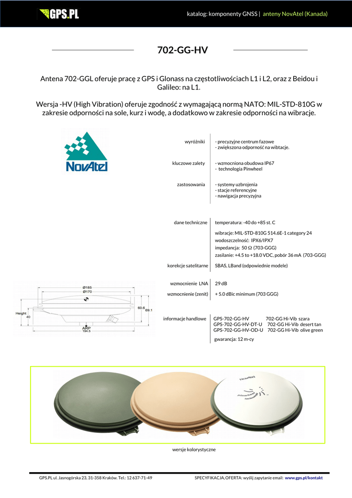 katalog: komponenty GNSS | anteny NovAtel (Kanada) 702-GG-HV Antena 702-GGL oferuje pracę z GPS i Glonass na częstotliwościach L1 i L2, oraz z Beidou i Galileo: na L1. Wersja -HV (High Vibration) oferuje zgodność z wymagającą normą NATO: MIL-STD-810G w zakresie odporności na sole, kurz i wodę, a dodatkowo w zakresie odporności na wibracje. wyróżniki kluczowe zalety zastosowania dane techniczne - precyzyjne centrum fazowe - zwiększona odporność na wibtacje. - wzmocniona obudowa IP67 - technologia Pinwheel - systemy uzbrojenia - stacje referencyjne - nawigacja precyzyjna temperatura: -40 do +85 st. C wibracje: MIL-STD-810G 514.6E-1 category 24 wodoszczelność: IPX6/IPX7 impedancja: 50 Ω (703-GGG) zasilanie: +4.5 to +18.0 VDC, pobór 36 mA (703-GGG) korekcje satelitarne wzmocnienie LNA wzmocnienie (zenit) informacje handlowe SBAS, LBand (odpowiednie modele) 29 dB + 5.0 dBic minimum (703 GGG) GPS-702-GG-HV 702-GG Hi-Vib szara GPS-702-GG-HV-DT-U 702-GG Hi-Vib desert tan GPS-702-GG-HV-OD-U 702-GG Hi-Vib olive green gwarancja: 12 m-cy wersje kolorystyczne GPS.PL ul. Jasnogórska 23, 31-358 Kraków. Tel.: 12 637-71-49 SPECYFIKACJA, OFERTA: wyślij zapytanie email: www.gps.pl/kontakt