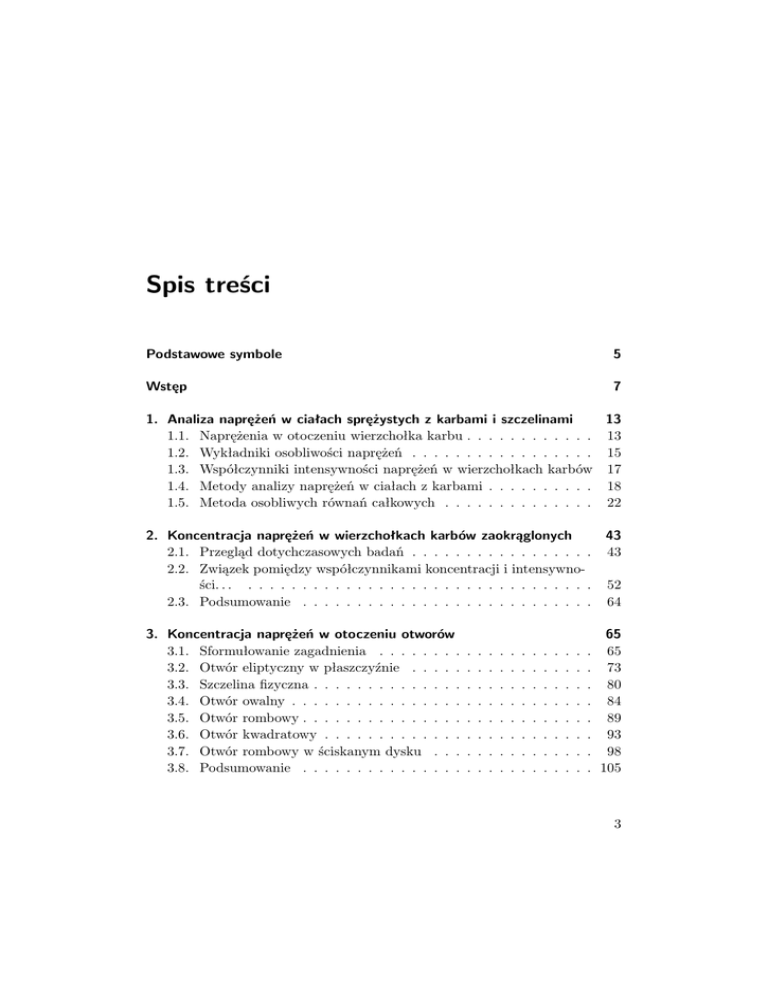 Spis treści Podstawowe symbole 5 Wstęp 7 1. Analiza naprężeń w ciałach sprężystych z karbami i szczelinami 13 1.1. Naprężenia w otoczeniu wierzchołka karbu . . . . . . . . . . . . 13 1.2. Wykładniki osobliwości naprężeń . . . . . . . . . . . . . . . . . 15 1.3. Współczynniki intensywności naprężeń w wierzchołkach karbów 17 1.4. Metody analizy naprężeń w ciałach z karbami . . . . . . . . . . 18 1.5. Metoda osobliwych równań całkowych . . . . . . . . . . . . . . 22 2. Koncentracja naprężeń w wierzchołkach karbów zaokrąglonych 2.1. Przegląd dotychczasowych badań . . . . . . . . . . . . . . . . . 2.2. Związek pomiędzy współczynnikami koncentracji i intensywności. . . . . . . . . . . . . . . . . . . . . . . . . . . . . . . . . . . 2.3. Podsumowanie . . . . . . . . . . . . . . . . . . . . . . . . . . . 3. Koncentracja naprężeń w otoczeniu otworów 3.1. Sformułowanie zagadnienia . . . . . . . . 3.2. Otwór eliptyczny w płaszczyźnie . . . . . 3.3. Szczelina fizyczna . . . . . . . . . . . . . . 3.4. Otwór owalny . . . . . . . . . . . . . . . . 3.5. Otwór rombowy . . . . . . . . . . . . . . . 3.6. Otwór kwadratowy . . . . . . . . . . . . . 3.7. Otwór rombowy w ściskanym dysku . . . 3.8. Podsumowanie . . . . . . . . . . . . . . . . . . . . . . . . . . . . . . . . . . . . . . . . . . . . . . . . . . . . . . . . . . . . . . . . . . . . . . . . . . . . . . . . . . . . . . . . . . . . . . . . . . . . . . . 43 43 52 64 65 . 65 . 73 . 80 . 84 . 89 . 93 . 98 . 105 3 4. Koncentracja naprężeń w płaszczyźnie sprężystej osłabionej. . . 4.1. Redukcja zadania do równania całkowego . . . . . . . . . . . . 4.2. Układ otworów eliptycznych . . . . . . . . . . . . . . . . . . . . 4.3. Układ szczelin fizycznych . . . . . . . . . . . . . . . . . . . . . 4.4. Układy otworów rombowych i owalnych . . . . . . . . . . . . . 4.5. Dwustronny, symetryczny karb zaokrąglony . . . . . . . . . . . 4.6. Współczynniki intensywności naprężeń w wierzchołku karbu . . . 4.7. Zastosowanie współczynników koncentracji i intensywności naprężeń . . . . . . . . . . . . . . . . . . . . . . . . . . . . . . . . . 4.8. Podsumowanie . . . . . . . . . . . . . . . . . . . . . . . . . . . 107 107 112 116 118 123 131 5. . . . . . 143 143 153 161 165 167 . . . . . . . . 169 169 175 180 185 7. Deformacyjne kryterium pękania ciał z karbami 7.1. Kryteria pękania ciał z karbami . . . . . . . . . . . . . . . . . 7.2. Rozwarcie wierzchołka karbu w płaskim stanie naprężenia . . 7.3. Rozwarcie wierzchołka karbu w płaskim stanie odkształcenia 7.4. Kryterium pękania ciał quasi-kruchych z karbami . . . . . . . 7.5. Podsumowanie . . . . . . . . . . . . . . . . . . . . . . . . . . . . . . . 187 187 190 199 207 208 Karby w krawędzi półpłaszczyzny 5.1. Krawędziowy karb w rozciąganej półpłaszczyźnie sprężystej 5.2. Półpłaszczyzna o krawędzi sinusoidalnej . . . . . . . . . . . 5.3. Układ okresowy zaokrąglonych karbów V . . . . . . . . . . 5.4. Okresowy układ ostrych karbów V . . . . . . . . . . . . . . 5.5. Podsumowanie . . . . . . . . . . . . . . . . . . . . . . . . . 6. Szczeliny w wierzchołku zaokrąglonego karbu V 6.1. Sformułowanie zadania . . . . . . . . . . . . . . . 6.2. Pojedyncza, symetryczna szczelina w wierzchołku 6.3. Dwie symetryczne szczeliny w wierzchołku karbu 6.4. Podsumowanie . . . . . . . . . . . . . . . . . . . . . . . karbu . . . . . . . . . . . . . . . . . . . . . 133 142 Bibliografia 209 Streszczenie 239 4
