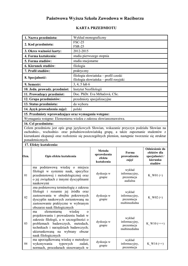 Państwowa Wyższa Szkoła Zawodowa w Raciborzu KARTA PRZEDMIOTU Wykład monograficzny FSC-25 2. Kod przedmiotu: FSR-25 2012-2015 3. Okres ważności karty: studia pierwszego stopnia 4. Forma kształcenia: studia stacjonarne 5. Forma studiów: 6. Kierunek studiów: filologia praktyczny 7. Profil studiów: filologia słowiańska – profil czeski 8. Specjalność: filologia słowiańska – profil rosyjski 3, 4, 5 lub 6 9. Semestr: 10. Jedn. prowadz. przedmiot: Instytut Neofilologii Doc. PhDr. Eva Mrhačová, CSc. 11. Prowadzący przedmiot: 12. Grupa przedmiotów: przedmioty specjalizacyjne 13. Status przedmiotu: do wyboru 14. Język prowadzenia zajęć: polski 15. Przedmioty wprowadzające oraz wymagania wstępne: Wymagania wstępne: Elementarna wiedza z zakresu słowianoznawstwa. 16. Cel przedmiotu: Celem przedmiotu jest opis grup językowych Słowian, wskazanie przyczyn podziału Słowian na zachodnio-, wschodnio- oraz południowosłowiańską grupę, a także zapoznanie studentów z kierunkami ekspansji oraz rozłożenie się poszczególnych plemion, następnie tworzenie się struktur ponadetnicznych. 17. Efekty kształcenia: 1. Nazwa przedmiotu: Ozn. 01 02 03 04 Opis efektu kształcenia ma podstawową wiedzę o miejscu filologii w systemie nauk, specyfice przedmiotowej i metodologicznej oraz o jej związkach z innymi dyscyplinami naukowymi zna podstawową terminologię z zakresu filologii i rozumie jej źródła oraz zastosowania w obrębie pokrewnych dyscyplin naukowych zorientowaną na zastosowanie praktyczne w wybranym obszarze nauk filologicznych ma elementarną wiedzę o projektowaniu i prowadzeniu badań w zakresie filologii, a w szczególności o problemach badawczych, metodach, technikach i narzędziach badawczych; ukierunkowaną na wybrany obszar nauk filologicznych ma uporządkowaną wiedzę o metodyce wykonywania typowych zadań, normach, procedurach stosowanych w Metoda sprawdzenia efektu kształcenia Forma prowadzenia zajęć Odniesienie do efektów dla specjalności / kierunku studiów dyskusja w grupie wykład informacyjny, prezentacja audialna K_W01 (+) dyskusja w grupie wykład informacyjny, prezentacja multimedialna K_W02 (+) dyskusja w grupie wykład informacyjny, prezentacja multimedialna K_W10 (+++) dyskusja w grupie wykład informacyjny, prezentacja K_W14 (++) multimedialna wybranej dziedzinie filologii ma świadomość poziomu swojej wiedzy i umiejętności, rozumie potrzebę ciągłego dokształcania się zawodowego i rozwoju osobistego, dyskusja w wykład, K_K01 (+) grupie pogadanka dokonuje samooceny własnych kompetencji i doskonali umiejętności, wyznacza kierunki własnego rozwoju i kształcenia 18. Formy i wymiar zajęć: W. 30 19. Treści kształcenia: Pochodzenie Słowian - koncepcja polska, rosyjska, niemiecka. Usytuowanie Słowian na ziemiach środkowej Europy, migracje Słowian, izolacja Słowian przez plemiona ugrofińskie. Pierwsze wzmianki o Słowianach w kronikach rzymskich, wizygockich, germańskich, frankońskich. Wpływy języków romańskich i germańskich na język Słowian (np. król < Karl). Rozwój grup spółgłoskowych i samogłoskowo-spółgłoskowych świadczących o odrębności językowej plemion słowiańskich do wieku IX. Język starocerkiewnosłowiański i pierwsze zabytki języka prasłowiańskiego (starocerkiewnosłowiańskiego). Misja Cyryla i Metodego. 20. Egzamin: nie, zal/o 21. Literatura podstawowa: Mały słownik kultury dawnych Słowian, red. Lech Leciejewicz, Wiedza Powszechna, Warszawa 1990. Hanna Dalewska-Greń, Języki słowiańskie, Wydawnictwo Naukowe PWN, Warszawa 2002. Zbigniew Gołąb, O pochodzeniu Słowian w świetle faktów językowych, Towarzystwo Autorów i Wydawców Prac Naukowych „Universitas”, Kraków 2004. 21. Literatura uzupełniająca: Leszek Bednarczuk (red.), Ignacy Ryszard Danka, Andrzej Pisowicz, Tadeusz Pobożniak, Józef Reczek, Jan Safarewicz, Wojciech Skalmowski, Języki indoeuropejskie, tom I, Państwowe Wydawnictwo Naukowe, Warszawa 1986. Leszek Bednarczuk (red.), Witold Mańczak, Jan Safarewicz, Franciszek Sławski, Wojciech Smoczyński, Aleksander Szulc, Języki indoeuropejskie, tom II, Państwowe Wydawnictwo Naukowe, Warszawa 1988. Jerzy Nalepa, Słowiańszczyzna północno-zachodnia. Podstawy jedności i jej rozpad, Poznańskie Towarzystwo Przyjaciół Nauk, Poznań 1968. Tadeusz Lehr-Spławiński, Władysław Kuraszkiewicz, Franciszek Sławski, Przegląd i charakterystyka języków słowiańskich, Państwowe Wydawnictwo Naukowe, Warszawa 1954. 23. Nakład pracy studenta potrzebny do osiągnięcia efektów kształcenia: Liczba godzin Lp. Forma zajęć kontaktowych / pracy studenta 30 1 Wykład 2 Ćwiczenia 3 Laboratorium 4 Projekt 5 Seminarium 6 - przygotowanie do zajęć 15 - przygotowanie do dyskusji 15 Inne (Ćwiczenia) Suma godzin 24. Suma wszystkich godzin: 26. Liczba punktów ECTS uzyskanych na zajęciach z bezpośrednim udziałem nauczyciela akademickiego: 28. Uwagi: 60 1 60 25. Liczba punktów ECTS: 27. Liczba punktów ECTS uzyskanych w wyniku samodzielnej pracy studenta: Zatwierdzono: ……………………………. ………………………………………………… (data i podpis prowadzącego) (data i podpis) 2 1