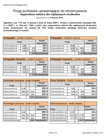 Wydział Nauk Pedagogicznych Progi punktowe uprawniające do otrzymywania stypendium rektora dla najlepszych studentów posiedzenie z 14 listopada 2016r. Zgodnie z art. 174 ust. 4 ustawy z dnia 27 licpa 2005 r. Prawo o szkolnictwie wyższym (Dz. U. z 2005 r. nr 164 poz. 1365, z późn. zm.) stypendium rektora dla najlepszych studentów może otrzymywać nie więcej niż 10% liczby studentów każdego kierunku studiów prowadzonego w uczelni. Pedagogika - studia I stopnia Progi Liczba punktów od Liczba punktów od Liczba punktów od 9,80 9,60 do 9,40 do Liczba punktów poniżej Pedagogika - studia II stopnia Kwota stypendium 300 zł 9,79 240 zł 9,59 200 zł 9,39 nie przyznano Pedagogika Specjalna - studia I stopnia Progi Liczba punktów od Liczba punktów od 9,84 9,52 do Liczba punktów od 9,12 do Liczba punktów poniżej Kwota stypendium 300 zł 9,83 240 zł 9,51 200 zł 9,11 nie przyznano Psychologia stosowana - studia II stopnia Kwota Progi stypendium Liczba punktów od 11,18 Liczba punktów od 9,88 do 11,17 Liczba punktów od 9,76 do 9,87 350 zł 300 zł 250 zł 9,75 nie przyznano Liczba punktów poniżej Psychologia stosowana - studia I stopnia Liczba punktów od 15,58 Liczba punktów od 9,42 do 15,57 Liczba punktów od 9,06 do Liczba punktów poniżej 9,41 9,05 Liczba punktów od Liczba punktów od Liczba punktów od 20,00 10,00 do 9,58 do Liczba punktów poniżej Kwota stypendium 350 zł 19,99 300 zł 9,99 250 zł 9,57 nie przyznano Pedagogika Specjalna - studia II stopnia Progi Liczba punktów od Liczba punktów od 10,00 9,81 do Liczba punktów od 9,58 do Liczba punktów poniżej Kwota stypendium 350 zł 9,99 300 zł 9,80 250 zł 9,57 nie przyznano Praca Socjalna - studia II stopnia Progi Liczba punktów od 9,94 Liczba punktów od 9,74 do Liczba punktów od 9,46 do Liczba punktów poniżej Kwota stypendium 350 zł 300 zł 9,93 250 zł 9,73 9,45 nie przyznano Sztuki nowoczesne - studia I stopnia Kwota stypendium Progi Progi 300 zł 240 zł 200 zł nie przyznano Progi Liczba punktów od Liczba punktów od Liczba punktów od Liczba punktów poniżej Strona 1/1 Kwota stypendium 11,06 300 zł 10,16 do 11,05 240 zł 9,76 do 10,15 200 zł 9,75 nie przyznano Sporządzono: 2016-11-14