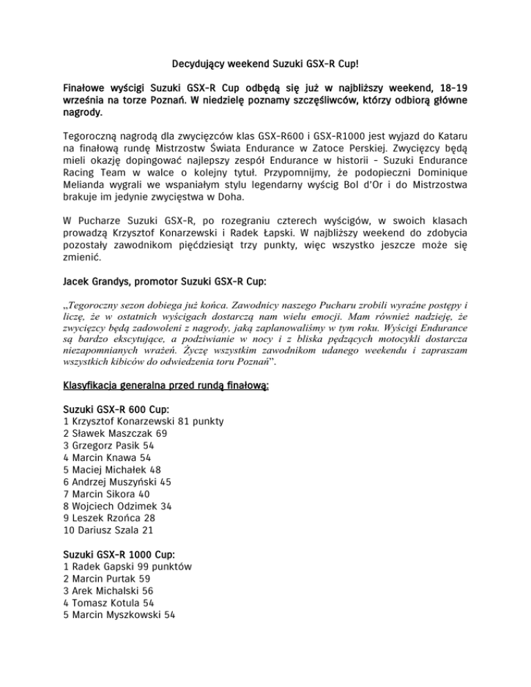 Decydujący weekend Suzuki GSX-R Cup! Finałowe wyścigi Suzuki GSX-R Cup odbędą się już w najbliższy weekend, 18-19 września na torze Poznań. W niedzielę poznamy szczęśliwców, którzy odbiorą główne nagrody. Tegoroczną nagrodą dla zwycięzców klas GSX-R600 i GSX-R1000 jest wyjazd do Kataru na finałową rundę Mistrzostw Świata Endurance w Zatoce Perskiej. Zwycięzcy będą mieli okazję dopingować najlepszy zespół Endurance w historii - Suzuki Endurance Racing Team w walce o kolejny tytuł. Przypomnijmy, że podopieczni Dominique Melianda wygrali we wspaniałym stylu legendarny wyścig Bol d’Or i do Mistrzostwa brakuje im jedynie zwycięstwa w Doha. W Pucharze Suzuki GSX-R, po rozegraniu czterech wyścigów, w swoich klasach prowadzą Krzysztof Konarzewski i Radek Łapski. W najbliższy weekend do zdobycia pozostały zawodnikom pięćdziesiąt trzy punkty, więc wszystko jeszcze może się zmienić. Jacek Grandys, promotor Suzuki GSX-R Cup: „Tegoroczny sezon dobiega już końca. Zawodnicy naszego Pucharu zrobili wyraźne postępy i liczę, że w ostatnich wyścigach dostarczą nam wielu emocji. Mam również nadzieję, że zwycięzcy będą zadowoleni z nagrody, jaką zaplanowaliśmy w tym roku. Wyścigi Endurance są bardzo ekscytujące, a podziwianie w nocy i z bliska pędzących motocykli dostarcza niezapomnianych wrażeń. Życzę wszystkim zawodnikom udanego weekendu i zapraszam wszystkich kibiców do odwiedzenia toru Poznań”. Klasyfikacja generalna przed rundą finałową: Suzuki GSX-R 600 Cup: 1 Krzysztof Konarzewski 81 punkty 2 Sławek Maszczak 69 3 Grzegorz Pasik 54 4 Marcin Knawa 54 5 Maciej Michałek 48 6 Andrzej Muszyński 45 7 Marcin Sikora 40 8 Wojciech Odzimek 34 9 Leszek Rzońca 28 10 Dariusz Szala 21 Suzuki GSX-R 1000 Cup: 1 Radek Gapski 99 punktów 2 Marcin Purtak 59 3 Arek Michalski 56 4 Tomasz Kotula 54 5 Marcin Myszkowski 54 6 Janusz Budek 32 7 Przemysław Bosek 32 8 Łukasz Szerszeń 30 9 Sebastian Sosna 25 10 Kamil Barański 25 Suzuki GRANDys duo Team www.grandysduo.com.pl www.suzuki-moto.pl