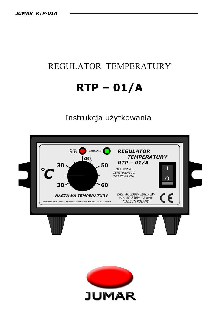 JUMAR RTP-01A REGULATOR TEMPERATURY RTP – 01/A Instrukcja użytkowania 1 JUMAR RTP-01A Dziękujemy za wybór naszego produktu. Niniejsza instrukcja ma na celu ułatwić Państwu instalację sterownika oraz zapoznać się z obsługą i bezpiecznym użytkowaniem urządzenia. Przed instalacją urządzenia prosimy o dokładne przeczytanie instrukcji i zapoznanie się z działaniem sterownika. W przypadku pytań prosimy o kontakt z firmą JUMAR. P.P.U.H JUMAR Jerzy Podhajski ul. Opawska 112 47-400 Racibórz tel./fax 32-415-80-39 tel. 32-415-54-24 Biuro e-mail: [email protected] Serwis e-mail: [email protected] www.ju-mar.eu 2 JUMAR RTP-01A ZASTOSOWANIE Regulator temperatury przeznaczony jest do załączania pompy obiegowej centralnego ogrzewania po osiągnięciu zadanej temperatury. Temperatura załączenia regulowana jest w zakresie od 20 do 60 ºC. Histereza jest ustalona na stałe i wynosi 1,5 ºC, a opóźnienie ponownego załączenia pompy wynosi 45 sekund. Opóźnienie jest celowo ustawione w takim przedziale czasowym ,aby ochronić silnik pompy przed zbyt częstym załączaniem i wyłączaniem podczas rozruchu instalacji centralnego ogrzewania. MONTAŻ Ponieważ w urządzeniu występuje napięcie niebezpieczne, montażu powinna dokonać osoba posiadająca odpowiednie uprawnienia. 1. Mocowanie regulatora: - regulator montujemy na ścianie za pomocą dwóch wkrętów (kołki rozporowe z wkrętami dołączone są do aparatu) - przewody wyprowadzone z regulatora przymocować do ściany uchwytami. 2. Podłączenie przewodu zasilającego pompę CO: - z puszki zaciskowej silnika pompy demontujemy pokrywę osłaniającą zaciski - do zacisku ( i ) montujemy przewód koloru żółto-zielonego - do zacisku ( N ) montujemy przewód w kolorze niebieskim - do zacisku ( L ) montujemy przewód w kolorze brązowym Sprawdzamy poprawność podłączenia przewodów i mocujemy pokrywę puszki zaciskowej pompy. 3. Mocowanie czujnika temperatury: - czujnik umieszczamy na nieosłoniętej rurze możliwie jak najbliżej kotła dociskając go opaską zaciskową (jest w opakowaniu). - owinąć materiałem izolacyjnym miejsca mocowania czujnika z rurą 3 JUMAR RTP-01A 4. Podłączenie regulatora do zasilania: – po zabezpieczeniu przewodów przed zerwaniem przewód zasilający z wtyczką należy podłączyć do gniazda sieciowego 230V/50 Hz koniecznie z bolcem uziemiającym. SYGNALIZACJA PRACY POMPY SYGNALIZACJA ZASILANIA 158 PRACA POMPY C o 30 gniazdo bezpiecznika ZASILANIE 40 REGULATOR TEMPERATURY RTP - 01/A 50 DLA POMP CENTRALNEGO OGRZEWANIA 20 60 0 0 ZAS. AC 230V/ 50Hz/ 2W NASTAWA TEMPERATURY WY. AC 230V/ 1A max Producent: PPUH "JUMAR" 47-400 RACIBÓRZ ul. OPAWSKA 112 tel. 0-32 415-80-39 MADE IN POLAND PRZEWÓD CZUJNIKA TEMPERATURY PRZEWÓD POMPY C.O. WYŁĄCZNIK ZASILANIA PRZEWÓD ZASILAJĄCY 5. Obsługa regulatora: - Wyłącznikiem regulatora włączamy regulator (dioda zielona świeci się). - Gałką potencjometru ustawiamy temperaturę włączenia pompy CO. - Pompa załączana jest gdy temperatura w miejscu mocowania czujnika jest wyższa od nastawionej, co jest sygnalizowane świeceniem diody czerwonej. DANE TECHNICZNE Nastawa temperatury 20 - 60 ºC Histereza (różnica załącz-wyłącz) 1,5 ºC Opóźnienie 45 sek Napięcie zasilania 230 V 50 Hz Pobór mocy <2W Wyjście 230 V / 3(1) A Klasa ochrony II / IP 40 Masa 0,6 kg Wymiary 168 x 100 x 50 Nr PKWiU 33.20.70–15.00 Temperatura pracy otoczenia 0 – 40 ºC 4 JUMAR RTP-01A BEZPIECZEŃSTWO Regulator jest zaprojektowany, wyprodukowany i przetestowany zgodnie z wymogami Europejskich Standardów Bezpieczeństwa (PN–EN 60730-1/12-2002). q Regulator należy podłączyć do instalacji elektrycznej poprzez gniazdko wyposażone w styk ochronny PE. Nie wolno stosować rozgałęźników lub listwy przyłączeniowej. q Należy uważać, żeby przewód przyłączeniowy nie dotykał gorących części kotła CO. q Nie uderzać w regulator ciężkimi przedmiotami. q Nie używać regulatora do innych celów niż sterowanie pompą CO. q Nie wkładać wtyczki przewodu przyłączeniowego do wody lub innych płynów. q Nie nadwyrężać przewodów regulatora. Nie przenosić urządzenia trzymając za przewód oraz nie ciągnąć przewodu podczas rozłączania z gniazdka. q Jeżeli przewód zasilający ulegnie uszkodzeniu, to powinien być wymieniony przez producenta lub wskazany przez niego specjalistyczny zakład naprawczy w celu uniknięcia zagrożenia. q Osoby nieupoważnione nie mogą dokonywać jakichkolwiek napraw regulatora. q Demontowanie (rozkręcanie) regulatora jest niedopuszczalne. q Wszelkie naprawy powinny być wykonywane tylko przez producenta lub wskazany przez niego specjalistyczny zakład naprawczy. q Dopuszcza się wymianę bezpiecznika, który znajduje się w specjalnie oznaczonym gnieździe z boku urządzenia. Należy pamiętać o wcześniejszym odłączeniu wtyczki przewodu przyłączeniowego z gniazdka zasilającego. q Regulatora nie mogą obsługiwać dzieci. 5 JUMAR RTP-01A KONSERWACJA URZĄDZENIA 1. Przed czyszczeniem urządzenia należy wyjąć wtyczkę przewodu przyłączeniowego z gniazdka zasilającego. 2. Regulator nie jest przewidziany do częściowego lub całkowitego zanurzenia w wodzie podczas czyszczenia. 3. Do czyszczenia regulatora nie używać agresywnych detergentów w postaci emulsji, mleczka, past itp. Mogą one między innymi usunąć naniesione informacyjne symbole graficzne takie jak podziałki, oznaczenia, znaki 4. Czyścić urządzenie przy pomocy miękkiej ściereczki zwilżonej płynem ostrzegawcze itp. myjącym. 5. Nie czyścić wnętrza regulatora. PROBLEMY I ICH ROZWIĄZYWANIE Objaw uszkodzenia Należy sprawdzić q Należy sprawdzić czy kabel zasilający jest prawidłowo podłączony do gniazdka elektrycznego. 1. Regulator nie działa. q Należy upewnić się czy w instalacji elektrycznej jest napięcie q Należy sprawdzić czy nie przepalił się bezpiecznik. Jest to bezpiecznik 1,6 A. Opóźnienie jest celowo 