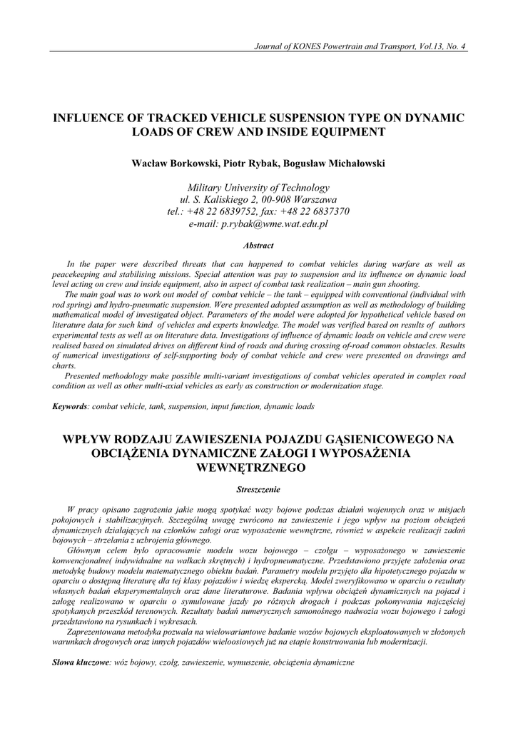 Journal of KONES Powertrain and Transport, Vol.13, No. 4 INFLUENCE OF TRACKED VEHICLE SUSPENSION TYPE ON DYNAMIC LOADS OF CREW AND INSIDE EQUIPMENT Wacáaw Borkowski, Piotr Rybak, Bogusáaw Michaáowski Military University of Technology ul. S. Kaliskiego 2, 00-908 Warszawa tel.: +48 22 6839752, fax: +48 22 6837370 e-mail: [email protected] Abstract In the paper were described threats that can happened to combat vehicles during warfare as well as peacekeeping and stabilising missions. Special attention was pay to suspension and its influence on dynamic load level acting on crew and inside equipment, also in aspect of combat task realization – main gun shooting. The main goal was to work out model of combat vehicle – the tank – equipped with conventional (individual with rod spring) and hydro-pneumatic suspension. Were presented adopted assumption as well as methodology of building mathematical model of investigated object. Parameters of the model were adopted for hypothetical vehicle based on literature data for such kind of vehicles and experts knowledge. The model was verified based on results of authors experimental tests as well as on literature data. Investigations of influence of dynamic loads on vehicle and crew were realised based on simulated drives on different kind of roads and during crossing of-road common obstacles. Results of numerical investigations of self-supporting body of combat vehicle and crew were presented on drawings and charts. Presented methodology make possible multi-variant investigations of combat vehicles operated in complex road condition as well as other multi-axial vehicles as early as construction or modernization stage. Keywords: combat vehicle, tank, suspension, input function, dynamic loads WPàYW RODZAJU ZAWIESZENIA POJAZDU GĄSIENICOWEGO NA OBCIĄĩENIA DYNAMICZNE ZAàOGI I WYPOSAĩENIA WEWNĉTRZNEGO Streszczenie W pracy opisano zagroĪenia jakie mogą spotykaü wozy bojowe podczas dziaáaĔ wojennych oraz w misjach pokojowych i stabilizacyjnych. Szczególną uwagĊ zwrócono na zawieszenie i jego wpáyw na poziom obciąĪeĔ dynamicznych dziaáających na czáonków zaáogi oraz wyposaĪenie wewnĊtrzne, równieĪ w aspekcie realizacji zadaĔ bojowych – strzelania z uzbrojenia gáównego. Gáównym celem byáo opracowanie modelu wozu bojowego – czoágu – wyposaĪonego w zawieszenie konwencjonalne( indywidualne na waákach skrĊtnych) i hydropneumatyczne. Przedstawiono przyjĊte zaáoĪenia oraz metodykĊ budowy modelu matematycznego obiektu badaĔ. Parametry modelu przyjĊto dla hipotetycznego pojazdu w oparciu o dostĊpną literaturĊ dla tej klasy pojazdów i wiedzĊ ekspercką. Model zweryfikowano w oparciu o rezultaty wáasnych badaĔ eksperymentalnych oraz dane literaturowe. Badania wpáywu obciąĪeĔ dynamicznych na pojazd i zaáogĊ realizowano w oparciu o symulowane jazdy po róĪnych drogach i podczas pokonywania najczĊĞciej spotykanych przeszkód terenowych. Rezultaty badaĔ numerycznych samonoĞnego nadwozia wozu bojowego i zaáogi przedstawiono na rysunkach i wykresach. Zaprezentowana metodyka pozwala na wielowariantowe badanie wozów bojowych eksploatowanych w záoĪonych warunkach drogowych oraz innych pojazdów wieloosiowych juĪ na etapie konstruowania lub modernizacji. Sáowa kluczowe: wóz bojowy, czoág, zawieszenie, wymuszenie, obciąĪenia dynamiczne W. Borkowski, P. Rybak, B. Michaáowski 1. Wprowadzenie Minione i wspóáczesne konflikty zbrojne (m.in. Angola, Bliski Wschód, Czeczenia, Jugosáawia, Afganistan, Irak) potwierdzają tezĊ, Īe wozy bojowe (czoági, bojowe wozy piechoty) stanowią i bĊdą nadal stanowiü podstawowy Ğrodek walki wojsk lądowych. Przeznaczeniem czoágu na wspóáczesnym i przyszáym polu walki jest m. in. wykonywanie zadaĔ w warunkach bezpoĞredniego zagroĪenia – rys.1.1: Ğrodkami poraĪającymi przeciwnika; wynikającymi z poruszania siĊ w terenie z duĪymi prĊdkoĞciami. Obszary 1, 2, 3 i 4 odnoszą siĊ do zagroĪeĔ od Ğrodków ogniowych przeciwnika, a obszar 5 związany jest z oddziaáywaniem min przeciwpancernych i obciąĪeĔ dynamicznych od nierównoĞci terenowych. Rys 1.1. Obszary oddziaáywania zagroĪeĔ na pojazd bojowy Fig. 1.1. Fig. 1.1. Areas of threats acting on combat vehicle O wartoĞci czoágu decydują jego gáówne cechy bojowe, tzn.: siáa ognia, ruchliwoĞü i opancerzenie – rys.1.2, które w myĞl zasady áaĔcucha powinny byü ogniwami o takiej samej wytrzymaáoĞci. RUCHLIWOĝû SIàA OGNIA OPANCERZENIE WARTOĝû BOJOWA WARTOĝû BOJOWA Rys. 1.2. Gáówne cechy bojowe czoágu Fig. 1.2. Main combat features of the tank Siáa ognia czoágu charakteryzuje nie tylko rodzaj, iloĞü i jakoĞü uzbrojenia, lecz równieĪ efektywnoĞü pocisków oraz jakoĞü systemu stabilizacji i kierowania ogniem. OkreĞla ona moĪliwoĞü niszczenia z pewnej odlegáoĞci wozów bojowych, Ğrodków ogniowych i innych obiektów opancerzonych w dowolnych warunkach klimatycznych i meteorologicznych, w dzieĔ i w nocy. Opancerzenie czoágu chroni w okreĞlonym stopniu zaáogĊ, uzbrojenie, amunicjĊ, mechanizmy i urządzenia umieszczone wewnątrz kadáuba i wieĪy przed Ğrodkami ogniowymi przeciwnika. Opancerzenie charakteryzują: gruboĞü páyt pancernych, kąty ich pochylenia, rodzaj materiaáu, z których jest wykonana kompozycja osáony pancernej, jak równieĪ technologia wykonania pancerza oraz systemy ochrony aktywnej. Pod pojĊciem ruchliwoĞci rozumiemy zespóá cech charakteryzujących zdolnoĞü jazdy i manewrowania wozu bojowego na polu walki na moĪliwym do wystĊpowania i o dowolnym ksztaácie podáoĪu. Jako najistotniejsze z tych cech naleĪy wymieniü: 92 Influence of Tracked Vehicle Suspension Type on Dynamic Loads of Crew and Inside Equipment – parametry charakteryzujące ruch prostoliniowy, – zwrotnoĞü, – zdolnoĞü pokonywania terenu. RuchliwoĞü czoágu decyduje o tempie wykonywania zadaĔ bojowych. Jest ona równieĪ nierozerwalnie zwi
