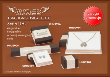 Seria UHU eleganckie i oryginalne w nowej, atrakcyjnej cenie UHU2906 UHU2914 UHU2908 UHU2901 UHU2904 Copyright © 2007 Mares Packaging Co. Zapraszamy do obejrzenia pude³ek serii UHU i wielu innych na stronie www www.bizuteria.mares.pl Seria UHU Promocja modeli serii UHU. Iloœci w promocji ograniczone. Symbol UHU2901 Stara cena 1.62 UHU2904 1.68 UHU2906 2.24 UHU2908 3.00 UHU2914 4.85 Nowa cena 1.21 1.28 1.85 2.36 3.63 Mares Packaging Co. ul. Obornicka 277 61-691 Poznañ tel. 061 842 23 96 fax 061 842 29 19 e-mail: [email protected] www.bizuteria.mares.pl
