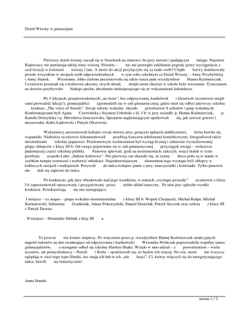 Dzień Wiosny w gimnazjum Pierwszy dzień wiosny zaczął się w Stawkach na zimowo, bo przy mrozie i padającym śniegu. Najstarsi Kujawiacy nie pamiętają takiej zimy wiosną. Niestety – nic nie pomogło zaklinanie pogody przez wyciągnięcie z szaf kreacji w kolorach wiosny i lata. A może do akcji przyłączyło się za mało osób? Ciepłe barwy dominowały przede wszystkim w strojach osób odpowiedzialnych w tym roku szkolnym za Dzień Wiosny – Anny Przybylskiej i Anny Stanek. Wiosennie, żółto-zielono prezentowała się także nasza pani wicedyrektor Hanna Kaźmierczak. Uczniowie postarali się o kolorowe akcenty swych ubrań, dzięki temu chociaż w szkole było wiosennie. Tymczasem na dworze przybywało białego puchu, absolutnie niekojarzącego się ze wskazaniami kalendarza. Po 5 lekcjach, przeprowadzonych ,,na luzie”, bez odpytywania, kartkówek i klasówek (uczniowie mogli sami prowadzić lekcje!), gimnazjaliści zgromadzili się w sali gimnastycznej, gdzie miał się odbyć pierwszy szkolny konkurs ,,The voice of Stawki”. Swoje talenty wokalne chciało przedstawić 8 solistów i grup wokalnych. Konferansjerami byli Agata Czerwińska i Szymon Urbański z kl. I b; w jury zasiedli: p. Hanna Kaźmierczak, p. Kamila Drużyńska i p. Mirosława Januszewska. Sprzętem nagłaśniającym opiekowali się, jak zawsze gotowi i niezawodni, Kuba Łątkowski i Patryk Olszewski. Wykonawcy prezentowali kolejno swoje utwory przy gorącym aplauzie publiczności, która bawiła się wspaniale. Niektórzy uczniowie dokumentowali przebieg koncertu telefonami komórkowymi, fotografował także niestrudzenie szkolny paparazzi. Przełomowym wydarzeniem był występ licznej i zabawnie wystylizowanej grupy chłopców z klasy III b. Od swego pojawienia się w sali gimnastycznej przyciągali uwagę – zwłaszcza piękniejszej części szkolnej publiki. Panowie śpiewali, grali na instrumentach, tańczyli, wręcz hulali w rytm przeboju zespołu Lider ,,Suknie kolorowe”. Nie pierwszy raz okazało się, że rytmy disco polo są w stanie w szybkim tempie rozruszać i rozbawić młodzież. Najzabawniejszym elementem tego występu byli chłopcy w kobiecych strojach i makijażach. Porywali do tańca kolejno: panie z jury, nauczycielki i koleżanki. Tylko panowie nie dali się zaprosić do tańca. Po konkursie, gdy jury obradowało nad jego wynikiem, w ramach ,,występu gwiazdy” uczniowie z klasy I b zaprezentowali opracowany i przygotowany przez siebie układ taneczny. Po nim jury ogłosiło wyniki konkursu. Przedstawiają się one następująco: I miejsce – ex aequo – grupa wokalno-instrumentalna z klasy III b: Wojtek Chojnacki, Michał Kulpa, Michał Kurnatowski, Sebastian Gradusiak, Adam Pokorzyński, Daniel Danielak, Patryk Styczek oraz solista z klasy III c Patryk Dawiec. II miejsce – Dominika Melnik z klay III a. To jeszcze nie koniec imprezy. Po wręczeniu przez p. wicedyrektor Hannę Kaźmierczak atrakcyjnych nagród (talonów na dni zwalniające od odpytywania i kartkówek) Weronika Wódczak poprowadziła wspólny taniec gimnazjalistów, a następnie odbył się szkolny Harlem Shake. Wzięło w nim udział – z powodzeniem – wielu uczniów, ale pomysłodawcy – Patryk i Kuba – spodziewali się, że będzie ich więcej. No cóż, może nie wszyscy oglądają w sieci tego typu filmiki, nie znają ich lub to ich ,,nie kręci”. Ci, którzy włączyli się do energetyzującego tańca, bawili się fantastycznie! Anna Stanek strona 1 / 2 Dzień Wiosny w gimnazjum strona 2 / 2
