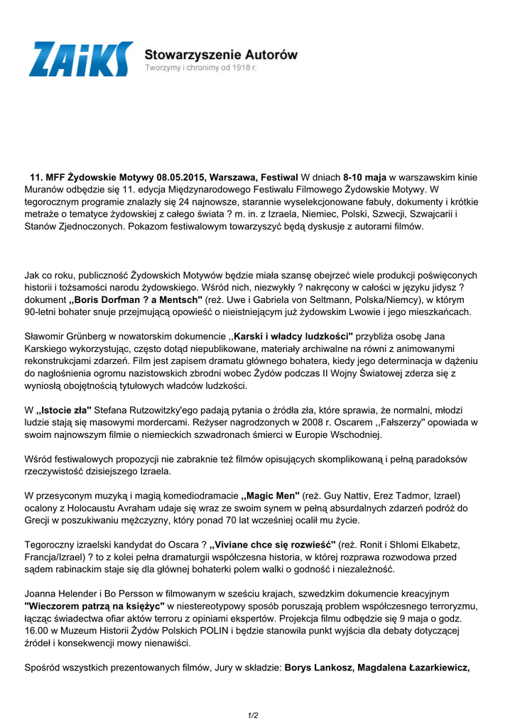 11. MFF Żydowskie Motywy 08.05.2015, Warszawa, Festiwal W dniach 8-10 maja w warszawskim kinie Muranów odbędzie się 11. edycja Międzynarodowego Festiwalu Filmowego Żydowskie Motywy. W tegorocznym programie znalazły się 24 najnowsze, starannie wyselekcjonowane fabuły, dokumenty i krótkie metraże o tematyce żydowskiej z całego świata ? m. in. z Izraela, Niemiec, Polski, Szwecji, Szwajcarii i Stanów Zjednoczonych. Pokazom festiwalowym towarzyszyć będą dyskusje z autorami filmów. Jak co roku, publiczność Żydowskich Motywów będzie miała szansę obejrzeć wiele produkcji poświęconych historii i tożsamości narodu żydowskiego. Wśród nich, niezwykły ? nakręcony w całości w języku jidysz ? dokument ,,Boris Dorfman ? a Mentsch'' (reż. Uwe i Gabriela von Seltmann, Polska/Niemcy), w którym 90-letni bohater snuje przejmującą opowieść o nieistniejącym już żydowskim Lwowie i jego mieszkańcach. Sławomir Grünberg w nowatorskim dokumencie ,,Karski i władcy ludzkości'' przybliża osobę Jana Karskiego wykorzystując, często dotąd niepublikowane, materiały archiwalne na równi z animowanymi rekonstrukcjami zdarzeń. Film jest zapisem dramatu głównego bohatera, kiedy jego determinacja w dążeniu do nagłośnienia ogromu nazistowskich zbrodni wobec Żydów podczas II Wojny Światowej zderza się z wyniosłą obojętnością tytułowych władców ludzkości. W ,,Istocie zła'' Stefana Rutzowitzky'ego padają pytania o źródła zła, które sprawia, że normalni, młodzi ludzie stają się masowymi mordercami. Reżyser nagrodzonych w 2008 r. Oscarem ,,Fałszerzy'' opowiada w swoim najnowszym filmie o niemieckich szwadronach śmierci w Europie Wschodniej. Wśród festiwalowych propozycji nie zabraknie też filmów opisujących skomplikowaną i pełną paradoksów rzeczywistość dzisiejszego Izraela. W przesyconym muzyką i magią komediodramacie ,,Magic Men'' (reż. Guy Nattiv, Erez Tadmor, Izrael) ocalony z Holocaustu Avraham udaje się wraz ze swoim synem w pełną absurdalnych zdarzeń podróż do Grecji w poszukiwaniu mężczyzny, który ponad 70 lat wcześniej ocalił mu życie. Tegoroczny izraelski kandydat do Oscara ? ,,Viviane chce się rozwieść'' (reż. Ronit i Shlomi Elkabetz, Francja/Izrael) ? to z kolei pełna dramaturgii współczesna historia, w której rozprawa rozwodowa przed sądem rabinackim staje się dla głównej bohaterki polem walki o godność i niezależność. Joanna Helender i Bo Persson w filmowanym w sześciu krajach, szwedzkim dokumencie kreacyjnym "Wieczorem patrzą na księżyc" w niestereotypowy sposób poruszają problem współczesnego terroryzmu, łącząc świadectwa ofiar aktów terroru z opiniami ekspertów. Projekcja filmu odbędzie się 9 maja o godz. 16.00 w Muzeum Historii Żydów Polskich POLIN i będzie stanowiła punkt wyjścia dla debaty dotyczącej źródeł i konsekwencji mowy nienawiści. Spośród wszystkich prezentowanych filmów, Jury w składzie: Borys Lankosz, Magdalena Łazarkiewicz, 1/2 Jacek Petrycki wytypuje laureatów czterech głównych nagród festiwalu, w tym tej najważniejszej ? Złotego Warszawskiego Feniksa. Ponadto, filmy festiwalowe będą rywalizowały o 3 Nagrody Specjalne oraz o Nagrodę Publiczności. Na wszystkie seanse festiwalowe wstęp bezpłatny. Organizatorem festiwalu jest Stowarzyszenie Żydowskie Motywy. Więcej informacji: www.jewishmotifs.org.pl www.facebook.com/jewishmotifs ? wróć do listy wydarzeń Wszelkie prawa zastrzeżone 2017 ZAiKS / data wygenerowania strony 08.03.2017 11:44:41 PDF ze strony: http://www.zaiks.org.pl/wydarzenia,338 2/2