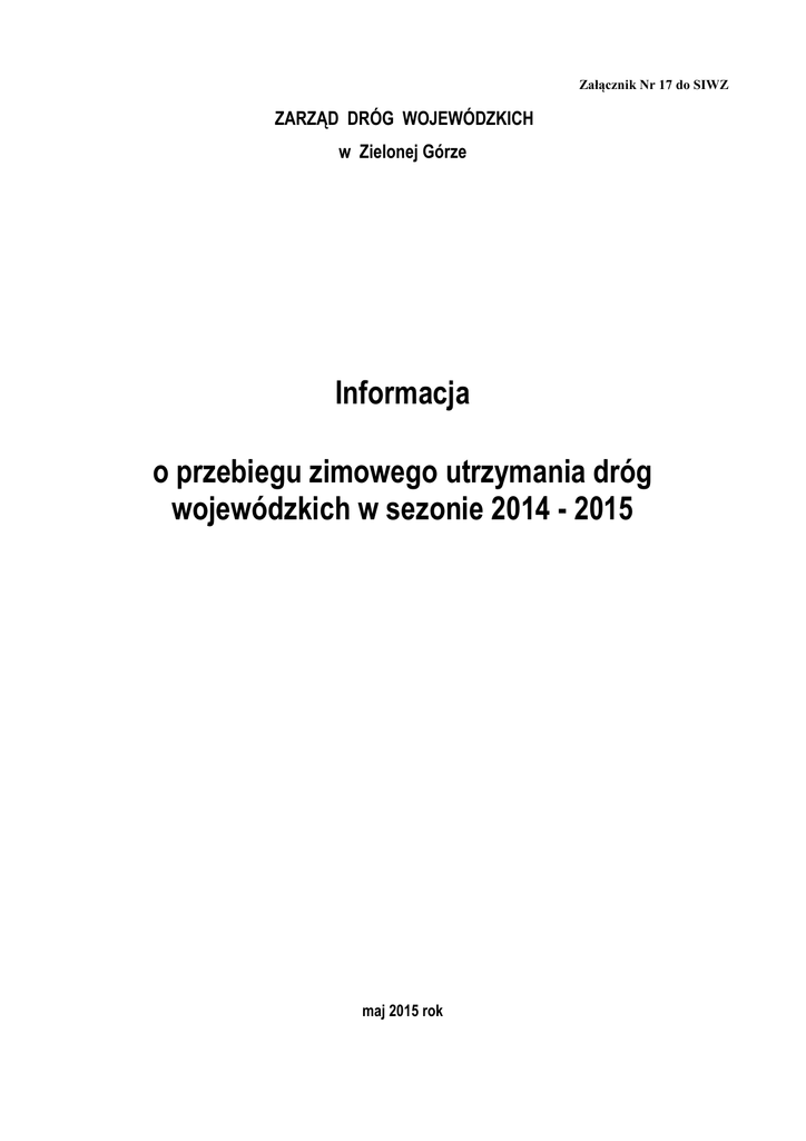 Załącznik Nr 17 do SIWZ ZARZĄD DRÓG WOJEWÓDZKICH w Zielonej Górze Informacja o przebiegu zimowego utrzymania dróg wojewódzkich w sezonie 2014 - 2015 maj 2015 rok I. WSTĘP Zimowe utrzymanie dróg polega na wykonywaniu prac, których celem jest zmniejszenie i ograniczenie zakłóceń ruchu drogowego wywoływanych takimi czynnikami atmosferycznymi, jak śliskość zimowa oraz opady śniegu. Do zimowego utrzymania dróg zalicza się między innymi: - działania organizacyjno-techniczne realizowane przez służby liniowe oraz przedsiębiorstwa wykonawcze, - przygotowanie materiałów oraz sprzętu do usuwania śliskości, - obsługę meteorologiczną, - usuwanie śniegu z dróg, - usuwanie śliskości zimowej poprzez zastosowanie materiałów uszorstniających oraz środków chemicznych (sól, chlorek wapnia), - prace porządkowe po sezonie zimowym. II. ZASADY PROWADZENIA PRAC ZIMOWEGO UTRZYMANIA NA DROGACH WOJEWÓDZKICH W SEZONIE 2013/2014 Zarząd Dróg Wojewódzkich w Zielonej Górze do 31.12.2014 r. administrował około 1 560 kilometrami dróg wojewódzkich na terenie województwa lubuskiego. Od dnia 01.01.2015 r. fragmenty dróg wojewódzkich nr 279, 280, 281, 282, 283 o całkowitej długości ok. 51 km zostały przejęte przez miasto Zielona Góra. Zarząd obecnie administruje ok. 1509 kilometrami dróg wojewódzkich. Na skutek połączenia miasta Zielona Góra na prawach powiatu z gminą wiejską Zielona Góra, a co za tym idzie, ze zmianą granic administracyjnych Zielonej Góry, zarządcą dróg wojewódzkich przebiegających przez tereny gminy wiejskiej Zielona Góra z dniem 29.12.2014 r. na mocy prawa stał się prezydent miasta. Zimowym utrzymaniem dróg w sezonie 2014/2015 objęta była cała sieć dróg wojewódzkich. Z uwagi na ograniczone nakłady z budżetu na utrzymanie dróg, prace polegające na odśnieżaniu i zwalczaniu śliskości zimowej prowadzone były w zróżnicowanym zakresie. W zależności od natężenia ruchu i znaczenia drogi w układzie komunikacyjnym wyodrębnione zostały standardy utrzymania zimowego sieci drogowej. Zarząd Dróg Wojewódzkich przyjął standardy określone przez Generalną Dyrekcję Dróg Krajowych i Autostrad. Na drogach wojewódzkich naszego województwa wprowadzono w sezonie zimowym 2014/2015 trzy standardy zimowego utrzymania, i tak: do 31.12.2014 r.: * 3 standardem objęto * 4 standardem objęto * 5 standardem objęto - 1 100 km - 393 km 67 km od 01.01.2015 r. * 3 standardem objęto * 4 standardem objęto * 5 standardem objęto - 1 054 km - 388 km 67 km Niżej podajemy zasady odśnieżania i usuwania gołoledzi w poszczególnych standardach: 3 standard Jezdnia odśnieżana jest na całej szerokości. Zwalczanie śliskości prowadzone jest przez posypanie tylko wyznaczonych miejsc, takich jak np. skrzyżowania z innymi drogami i liniami kolejowymi, przystanki komunikacyjne, odcinki dróg o pochyleniu podłużnym ponad 4 %. Zakładany czas odśnieżenia drogi nie może przekraczać 6 godzin po ustaniu opadów, z tym, że dopuszcza się po intensywnych opadach pozostawanie na jezdni lokalnych zasp i „języków” śniegu utrudniających ruch pojazdów. Zwalczanie śliskości prowadzone jest przez posypywanie wyznaczonych miejsc w czasie nie przekraczającym 6 godzin od wystąpienia zjawiska powodującego śliskość. 4 standard Jezdnia odśnieżana jest na całej szerokości. Zwalczanie śliskości prowadzone jest przez posypywanie na odcinkach decydujących o możliwości ruchu. Zakładany czas odśnieżania nie może przekraczać 8 godzin po ustaniu opadów, z tym, że dopuszcza się po intensywnych opadach pozostawanie na jezdni zajeżdżonego śniegu i „języków” lodowych utrudniających ruch. Dopuszcza się przerwy w komunikacji do 8 godzin. 5 standard Jezdnia odśnieżona, w miejscach zasp odśnieżony co najmniej jeden pas ruchu z wykonaniem mijanek. Po intensywnych opadach mogą występować zaspy, zajeżdżony śnieg, nabój śnieżny. Dopuszcza się przerwy w komunikacji do 24 godzin. Jezdnia posypywana na odcinkach decydujących o możliwości ruchu nie później niż w ciągu 8 godzin od stwierdzenia występowania zjawiska gołoledzi czy śliskości pośniegowej. Załącznik nr 1 przedstawia w km ilość dróg wojewódzkich w podziale na standardy zimowego utrzymania w poszczególnych rejonach, uwzględniające zmiany od 01.01.2015 r. Akcja czynna utrzymania dróg prowadzona była przez: - 3 Rejony Dróg Wojewódzkich w Kłodawie, Kożuchowie i Zielonej Górze - 11 Obwodów Drogowych w Kłodawie, Drezdenku, Sulęcinie, Ośnie Lub., Kożuchowie, Lubsku, Sławie, Żaganiu, Zielonej Górze, Bobrowicach i Babimoście. III ZABEZPIECZENIE SPRZĘTOWO – MATERIAŁOWE Ilość sprzętu do zimowego utrzymania dróg w zimie 2013/2014 - 49 szt. pługo - piaskarek - 9 szt. pługów - 14 szt. ładowaczy Powyższa ilość sprzętu obejmuje również 5 zestawów posypywarek wraz z nośnikiem i pługiem oraz materiałem (sól i piasek) zakupionym przez wykonawcę w ramach podpisanych umów na kompleksowe zimowe utrzymanie. W taki sposób utrzymywane będzie ok. 132,9 km dróg wojewódzkich. Są to odcinki dróg: nr 279, nr 280, nr 281, nr 282, nr 283 w powiecie zielonogórskim (do 31.12.2014 r. łącznie 108 km, a od 01.01.2015 r. – łącznie 57 km), nr 138, nr 286, nr 285 w powiecie krośnieńskim (łącznie 10,7 km) oraz nr 278, nr 305, nr 324 w powiecie wschowskim (łącznie 14,2 km). W 2014 r. Zarząd Dróg Wojewódzkich w Zielonej Górze zakupił 12 szt. fabrycznie nowych posypywarko-solarek o pojemności 7 m3 przeznaczonych do zwalczania śliskości zimowej oraz 3 szt. fabrycznie nowych pługów drogowych jednostronnych przeznaczonych do zgarniania śniegu: puszystego, zbitego oraz mokrego. W sezonie 2014/2015 do usuwania i łagodzenia skutków śliskości zimowej przewidziano następujące materiały: - chlorek sodu NaCl solanka – roztwór NaCl, sól zwilżona, chlorek wapnia techniczny (CaCl2), materiały uszorstn