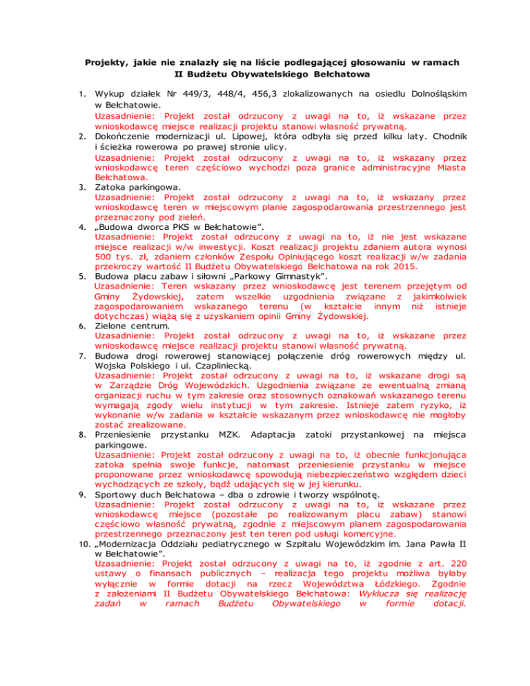 Projekty, jakie nie znalazły się na liście podlegającej głosowaniu w ramach II Budżetu Obywatelskiego Bełchatowa 1. Wykup działek Nr 449/3, 448/4, 456,3 zlokalizowanych na osiedlu Dolnośląskim w Bełchatowie. Uzasadnienie: Projekt został odrzucony z uwagi na to, iż wskazane przez wnioskodawcę miejsce realizacji projektu stanowi własność prywatną. 2. Dokończenie modernizacji ul. Lipowej, która odbyła się przed kilku laty. Chodnik i ścieżka rowerowa po prawej stronie ulicy. Uzasadnienie: Projekt został odrzucony z uwagi na to, iż wskazany przez wnioskodawcę teren częściowo wychodzi poza granice administracyjne Miasta Bełchatowa. 3. Zatoka parkingowa. Uzasadnienie: Projekt został odrzucony z uwagi na to, iż wskazany przez wnioskodawcę teren w miejscowym planie zagospodarowania przestrzennego jest przeznaczony pod zieleń. 4. „Budowa dworca PKS w Bełchatowie”. Uzasadnienie: Projekt został odrzucony z uwagi na to, iż nie jest wskazane miejsce realizacji w/w inwestycji. Koszt realizacji projektu zdaniem autora wynosi 500 tys. zł, zdaniem członków Zespołu Opiniującego koszt realizacji w/w zadania przekroczy wartość II Budżetu Obywatelskiego Bełchatowa na rok 2015. 5. Budowa placu zabaw i siłowni „Parkowy Gimnastyk”. Uzasadnienie: Teren wskazany przez wnioskodawcę jest terenem przejętym od Gminy Żydowskiej, zatem wszelkie uzgodnienia związane z jakimkolwiek zagospodarowaniem wskazanego terenu (w kształcie innym niż istnieje dotychczas) wiążą się z uzyskaniem opinii Gminy Żydowskiej. 6. Zielone centrum. Uzasadnienie: Projekt został odrzuc ony z uwagi na to, iż wskazane przez wnioskodawcę miejsce realizacji projektu stanowi własność prywatną. 7. Budowa drogi rowerowej stanowiącej połączenie dróg rowerowych między ul. Wojska Polskiego i ul. Czapliniecką. Uzasadnienie: Projekt został odrzucony z uwagi na to, iż wskazane drogi są w Zarządzie Dróg Wojewódzkich. Uzgodnienia związane ze ewentualną zmianą organizacji ruchu w tym zakresie oraz stosownych oznakowań wskazanego terenu wymagają zgody wielu instytucji w tym zakresie. Istnieje zatem ryzyko, iż wykonanie w/w zadania w kształcie wskazanym przez wnioskodawcę nie mogłoby zostać zrealizowane. 8. Przeniesienie przystanku MZK. Adaptacja zatoki przystankowej na miejsca parkingowe. Uzasadnienie: Projekt został odrzucony z uwagi na to, iż obecnie funkcjonująca zatoka spełnia swoje funkcje, natomiast przeniesienie przystanku w miejsce proponowane przez wnioskodawcę spowodują niebezpieczeństwo względem dzieci wychodzących ze szkoły, bądź udających się w jej kierunku. 9. Sportowy duch Bełchatowa – dba o zdrowie i tworzy wspólnotę. Uzasadnienie: Projekt został odrzucony z uwagi na to, iż wskazane przez wnioskodawcę miejsce (pozostałe po realizowanym placu zabaw) stanowi częściowo własność prywatną, zgodnie z miejscowym planem zagospodarowania przestrzennego przeznaczony jest ten teren pod usługi komercyjne. 10. „Modernizacja Oddziału pediatrycznego w Szpitalu Wojewódzkim im. Jana Pawła II w Bełchatowie”. Uzasadnienie: Projekt został odrzucony z uwagi na to, iż zgodnie z art. 220 ustawy o finansach publicznych – realizacja tego projektu możliwa byłaby wyłącznie w formie dotacji na rzecz Województwa Łódzkiego. Zgodnie z założeniami II Budżetu Obywatelskiego Bełchatowa: Wyklucza się realizację zadań w ramach Budżetu Obywatelskiego w formie dotacji. 11. Przyłącze domów jednorodzinnych do sieci cieplnej. Uzasadnienie: Projekt został odrzucony z uwagi na to, iż zadanie może być realizowane wyłącznie przez PEC Sp. z o.o. 12. Chodnik osiedlowy. Uzasadnienie: Projekt został odrzucony z uwagi na to, iż wskazane przez wnioskodawcę miejsce realizacji projektu stanowi częściowo własność prywatną. 13. Ścianka wspinaczkowa w Bełchatowie. Uzasadnienie: Projekt został odrzucony z uwagi na to, iż nie jest wskazane miejsce realizacji w/w zadania. Lista w/w projektów została zaakceptowana przez Zespół Opiniujący w składzie: 1. 2. 3. 4. 5. 6. 7. Włodzimierz Kuliński – Wiceprzewodniczący Rady Miejskiej w Bełchatowie Grzegorz Gryczka – Wiceprzewodniczący Rady Miejskiej w Bełchatowie Dorota Pędziwiatr – Radna Rady Miejskiej w Bełchatowie Barbara Rudnicka – Radna Rady Miejskiej w Bełchatowie Sławomir Komidzierski – Radny Rady Miejskiej w Bełchatowie Grzegorz Siedlecki – Radny Rady Miejskiej w Bełchatowie Marta Blada – Kierownik Referatu - Kancelaria Główna