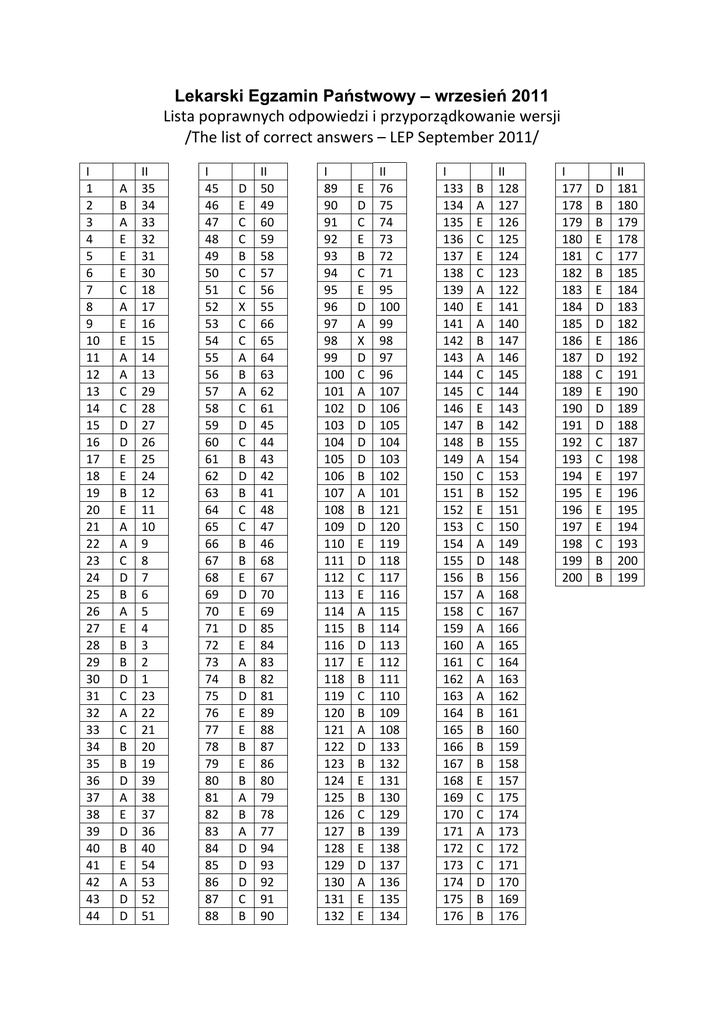 Lekarski Egzamin Państwowy – wrzesień 2011 Lista poprawnych odpowiedzi i przyporządkowanie wersji /The list of correct answers – LEP September 2011/ I 1 2 3 4 5 6 7 8 9 10 11 12 13 14 15 16 17 18 19 20 21 22 23 24 25 26 27 28 29 30 31 32 33 34 35 36 37 38 39 40 41 42 43 44 A B A E E E C A E E A A C C D D E E B E A A C D B A E B B D C A C B B D A E D B E A D D II 35 34 33 32 31 30 18 17 16 15 14 13 29 28 27 26 25 24 12 11 10 9 8 7 6 5 4 3 2 1 23 22 21 20 19 39 38 37 36 40 54 53 52 51 I 45 46 47 48 49 50 51 52 53 54 55 56 57 58 59 60 61 62 63 64 65 66 67 68 69 70 71 72 73 74 75 76 77 78 79 80 81 82 83 84 85 86 87 88 D E C C B C C X C C A B A C D C B D B C C B B E D E D E A B D E E B E B A B A D D D C B II 50 49 60 59 58 57 56 55 66 65 64 63 62 61 45 44 43 42 41 48 47 46 68 67 70 69 85 84 83 82 81 89 88 87 86 80 79 78 77 94 93 92 91 90 I 89 90 91 92 93 94 95 96 97 98 99 100 101 102 103 104 105 106 107 108 109 110 111 112 113 114 115 116 117 118 119 120 121 122 123 124 125 126 127 128 129 130 131 132 E D C E B C E D A X D C A D D D D B A B D E D C E A B D E B C B A D B E B C B E D A E E II 76 75 74 73 72 71 95 100 99 98 97 96 107 106 105 104 103 102 101 121 120 119 118 117 116 115 114 113 112 111 110 109 108 133 132 131 130 129 139 138 137 136 135 134 I 133 134 135 136 137 138 139 140 141 142 143 144 145 146 147 148 149 150 151 152 153 154 155 156 157 158 159 160 161 162 163 164 165 166 167 168 169 170 171 172 173 174 175 176 B A E C E C A E A B A C C E B B A C B E C A D B A C A A C A A B B B B E C C A C C D B B II 128 127 126 125 124 123 122 141 140 147 146 145 144 143 142 155 154 153 152 151 150 149 148 156 168 167 166 165 164 163 162 161 160 159 158 157 175 174 173 172 171 170 169 176 I 177 178 179 180 181 182 183 184 185 186 187 188 189 190 191 192 193 194 195 196 197 198 199 200 D B B E C B E D D E D C E D D C C E E E E C B B II 181 180 179 178 177 185 184 183 182 186 192 191 190 189 188 187 198 197 196 195 194 193 200 199