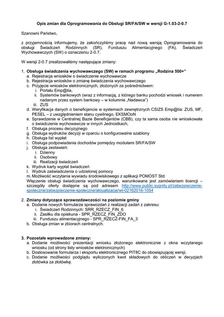 Opis zmian dla Oprogramowania do Obsługi SR/FA/SW w wersji G-1.03-2-0.7 Szanowni Państwo, z przyjemnością informujemy, że zakończyliśmy pracę nad nową wersją Oprogramowania do obsługi Świadczeń Rodzinnych (SR), Funduszu Alimentacyjnego (FA), Świadczeń Wychowawczych (SW) o oznaczeniu 2-0.7. W wersji 2-0.7 zrealizowaliśmy następujące zmiany: 1. Obsługa świadczenia wychowawczego (SW) w ramach programu „Rodzina 500+” a. Rejestracja wniosków o świadczenie wychowawcze b. Rejestracja wniosków o zmianę świadczenia wychowawczego c. Przyjęcie wniosków elektronicznych, złożonych za pośrednictwem: i. Portalu Emp@tia, ii. Systemów bankowych (wraz z informacją, z którego banku pochodzi wniosek i numerem nadanym przez system bankowy – w kolumnie „Nadawca”) iii. ZUS d. Weryfikacja danych o beneficjencie w systemach zewnętrznych CSIZS Emp@tia: ZUS, MF, PESEL – z uwzględnieniem stanu cywilnego, EKSMOoN e. Sprawdzenie w Centralnej Bazie Beneficjentów (CBB), czy ta sama osoba nie wnioskowała o świadczenie wychowawcze w innych Jednostkach, f. Obsługa procesu decyzyjnego g. Obsługa wydruków decyzji w oparciu o konfigurowalne szablony h. Obsługa list wypłat i. Obsługa podpowiadania dochodów pomiędzy modułami SR/FA/SW j. Obsługa zestawień: i. Dzienny ii. Osobowy iii. Realizacji świadczeń k. Wydruk karty wypłat świadczeń l. Wydruk zaświadczenia o udzielonej pomocy m. Możliwość wczytania wywiadu środowiskowego z aplikacji POMOST Std. Włączenie obsługi świadczenia wychowawczego, warunkowane jest zamówieniem licencji – szczegóły oferty dostępne są pod adresem http://www.public.sygnity.pl/zabezpieczeniespoleczne/zabezpieczenie-spoleczne/aktualizacje/wt-02162016-1054 2. Zmiany dotyczące sprawozdawczości na poziomie gminy a. Dodanie nowych formularze sprawozdań z realizacji zadań z zakresu: i. Świadczeń Rodzinnych: SRR_RZECZ_FIN_6 ii. Zasiłku dla opiekuna - SPR_RZECZ_FIN_ZDO iii. Funduszu alimentacyjnego - SPR_RZECZ-FIN_FA_3 b. Obsługa zmian w zbiorach centralnych. 3. Pozostałe wprowadzone zmiany: a. Dodanie możliwości prezentacji wniosku złożonego elektronicznie z okna wczytanego wniosku (od strony listy wniosków elektronicznych) b. Dostosowanie formularza i eksportu elektronicznego PIT8C do obowiązującej wersji. c. Dodanie możliwości podglądu wyliczonych kwot składowych do obliczeń w decyzjach złotówka za złotówkę.