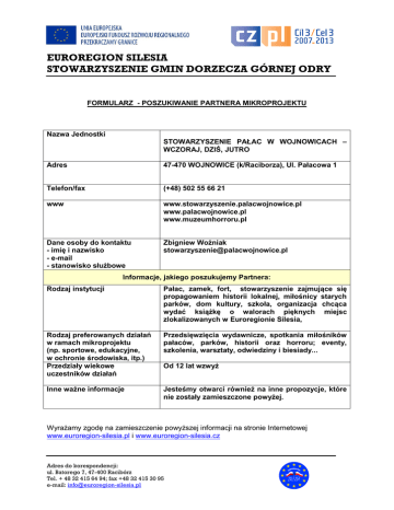 EUROREGION SILESIA STOWARZYSZENIE GMIN DORZECZA GÓRNEJ ODRY FORMULARZ - POSZUKIWANIE PARTNERA MIKROPROJEKTU Nazwa Jednostki STOWARZYSZENIE PAŁAC W WOJNOWICACH – WCZORAJ, DZIŚ, JUTRO Adres 47-470 WOJNOWICE (k/Raciborza), Ul. Pałacowa 1 Telefon/fax (+48) 502 55 66 21 www www.stowarzyszenie.palacwojnowice.pl www.palacwojnowice.pl www.muzeumhorroru.pl Dane osoby do kontaktu - imię i nazwisko - e-mail - stanowisko służbowe Zbigniew Woźniak [email protected] Informacje, jakiego poszukujemy Partnera: Rodzaj instytucji Pałac, zamek, fort, stowarzyszenie zajmujące się propagowaniem historii lokalnej, miłośnicy starych parków, dom kultury, szkoła, organizacja chcąca wydać książkę o walorach pięknych miejsc zlokalizowanych w Euroregionie Silesia, Rodzaj preferowanych działań w ramach mikroprojektu (np. sportowe, edukacyjne, w ochronie środowiska, itp.) Przedziały wiekowe uczestników działań Przedsięwzięcia wydawnicze, spotkania miłośników pałaców, parków, historii oraz horroru; eventy, szkolenia, warsztaty, odwiedziny i biesiady... Inne ważne informacje Jesteśmy otwarci również na inne propozycje, które nie zostały zamieszczone powyżej. Od 12 lat wzwyż Wyrażamy zgodę na zamieszczenie powyższej informacji na stronie Internetowej www.euroregion-silesia.pl i www.euroregion-silesia.cz Adres do korespondencji: ul. Batorego 7, 47-400 Racibórz Tel. + 48 32 415 64 94; fax +48 32 415 30 95 e-mail: [email protected]