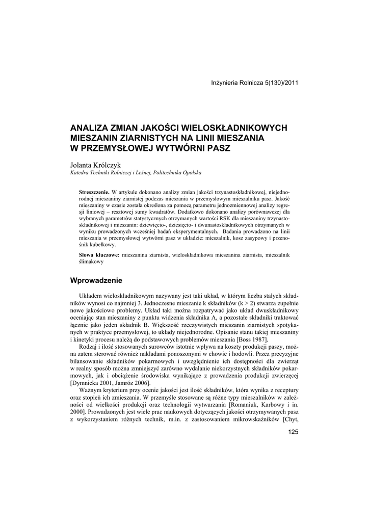 Inżynieria Rolnicza 5(130)/2011 ANALIZA ZMIAN JAKOŚCI WIELOSKŁADNIKOWYCH MIESZANIN ZIARNISTYCH NA LINII MIESZANIA W PRZEMYSŁOWEJ WYTWÓRNI PASZ Jolanta Królczyk Katedra Techniki Rolniczej i Leśnej, Politechnika Opolska Streszczenie. W artykule dokonano analizy zmian jakości trzynastoskładnikowej, niejednorodnej mieszaniny ziarnistej podczas mieszania w przemysłowym mieszalniku pasz. Jakość mieszaniny w czasie została określona za pomocą parametru jednozmiennowej analizy regresji liniowej – resztowej sumy kwadratów. Dodatkowo dokonano analizy porównawczej dla wybranych parametrów statystycznych otrzymanych wartości RSK dla mieszaniny trzynastoskładnikowej i mieszanin: dziewięcio-, dziesięcio- i dwunastoskładnikowych otrzymanych w wyniku prowadzonych wcześniej badań eksperymentalnych. Badania prowadzono na linii mieszania w przemysłowej wytwórni pasz w układzie: mieszalnik, kosz zasypowy i przenośnik kubełkowy. Słowa kluczowe: mieszanina ziarnista, wieloskładnikowa mieszanina ziarnista, mieszalnik ślimakowy Wprowadzenie Układem wieloskładnikowym nazywany jest taki układ, w którym liczba stałych składników wynosi co najmniej 3. Jednoczesne mieszanie k składników (k > 2) stwarza zupełnie nowe jakościowo problemy. Układ taki można rozpatrywać jako układ dwuskładnikowy oceniając stan mieszaniny z punktu widzenia składnika A, a pozostałe składniki traktować łącznie jako jeden składnik B. Większość rzeczywistych mieszanin ziarnistych spotykanych w praktyce przemysłowej, to układy niejednorodne. Opisanie stanu takiej mieszaniny i kinetyki procesu należą do podstawowych problemów mieszania [Boss 1987]. Rodzaj i ilość stosowanych surowców istotnie wpływa na koszty produkcji paszy, można zatem sterować również nakładami ponoszonymi w chowie i hodowli. Przez precyzyjne bilansowanie składników pokarmowych i uwzględnienie ich dostępności dla zwierząt w realny sposób można zmniejszyć zarówno wydalanie niekorzystnych składników pokarmowych, jak i obciążenie środowiska wynikające z prowadzenia produkcji zwierzęcej [Dymnicka 2001, Jamróz 2006]. Ważnym kryterium przy ocenie jakości jest ilość składników, która wynika z receptury oraz stopień ich zmieszania. W przemyśle stosowane są różne typy mieszalników w zależności od wielkości produkcji oraz technologii wytwarzania [Romaniuk, Karbowy i in. 2000]. Prowadzonych jest wiele prac naukowych dotyczących jakości otrzymywanych pasz z wykorzystaniem różnych technik, m.in. z zastosowaniem mikrowskaźników [Chyt, 125 Jolanta Królczyk Karbowy 2009; Karbowy, Rynkiewicz 2011]. Prace badawcze dotyczą również analiz techniczno-ekonomicznych produkcji pasz pełnoporcjowych w gospodarstwach rodzinnych [Chyt i in. 2011]. Stosunkowo niewiele prac dotyczy analizy procesu mieszania dla układów wieloskładnikowych – mieszanek pasz dla ptaków [Węgrzyn 2006]. W trakcie transportu, zasypu do zbiornika lub innych operacji dynamicznych jednorodny układ ziarnisty może ulegać częściowemu rozdzieleniu i w rezultacie poszczególne partie mieszanki mogą różnić się składem, wpływając na pogorszenie jakości otrzymywanej mieszanki [Axe 1995; Makse 1999; Boss i in. 2000]. Cel badań Celem badań była analiza zmian jakości trzynastoskładnikowej mieszaniny ziarnistej o nazwie Euro RL (składającej się z 13 składników) w czasie 30 minut mieszania na linii mieszania w przemysłowej wytwórni pasz za pomocą parametru jednozmiennowej analizy regresji liniowej – resztowej sumy kwadratów. Dodatkowo dokonano analizy porównawczej dla wybranych parametrów statystycznych otrzymanych wartości RSK dla mieszaniny trzynastoskładnikowej (Euro RL) i mieszanin: dziewięcio- (Ekonomik Z), dziesięcio(RL Ekonomiczna) i dwunastoskładnikowych (BP Ekonomicznej) otrzymanych w wyniku prowadzonych wcześniej badań eksperymentalnych. Metodyka badań Do badań wykorzystano mieszalnik przemysłowy z komorą nieruchomą z pionowym mieszadłem o działaniu okresowym. Były to badania prowadzone na linii mieszania w układzie: mieszalnik, kosz zasypowy i przenośnik kubełkowy w przemysłowej wytwórni pasz. Badano cztery rodzaje mieszanek paszowych różniących się proporcjami składników i składem (9, 10, 12 oraz 13 składników) (tab. 1). Masy mieszanin zasypanych do mieszalnika wyniosły odpowiednio 2000 kg, 2200 kg, 2099,5 kg, 2000 kg. Mieszanie zasypanego materiału ziarnistego następowało w wyniku ruchu mieszadła ślimakowego oraz w wyniku zewnętrznej recyrkulacji składników poprzez przenośnik kubełkowy. Zasypany do mieszalnika materiał ziarnisty wysypywał się w miejscu spustu z mieszalnika i kierowany był do kosza zasypowego, a następnie poprzez przenośnik kubełkowy zasypywany był z powrotem do wnętrza mieszalnika. W czasie przyjętego mieszania trwającego 30 minut pobierano próby do badań. Jeden pełny cykl mieszania obejmował: zasyp do mieszalnika, mieszanie i wysyp z mieszalnika i był to proces ciągły trwający 30 minut. Z tego tez względu można mówić o procesie przejścia wielokrotnego. Z uwagi na specyficzną dla tego procesu technologicznego recyrkulację mieszanki, próby do badań pobierano w miejscu wysypu z mieszalnika w trakcie całego procesu o odstępach 30 sekundowych. Tak uzyskane próby do badań ręcznie rozdzielano na poszczególne komponenty i następnie ważono. Poglądowy model mieszalnika pasz przedstawiono na rys. 1, a schemat z wymiarami na rys. 2 i tab. 2. 126 Analiza zmian jakości... Tabela 1. Skład surowcowy badanych mieszanek paszowych Table 1. Material composition of the researched feed mixtures Nazwa mieszanki Komponenty mieszanin ziarnistych Dari (sorgo białe) Groch zielony Groch żółty Jęczmień Kardi (krokosz) Kukurydza Owies łuszczony Peluszka Proso żółte Pszenica Ryż biały Słonecznik czarny Sorgo Wyka brązowa Suma Ekonomik Z RL Ekonomiczna BP Ekonomiczna Euro RL 1,25 5,00 29,00 16,00