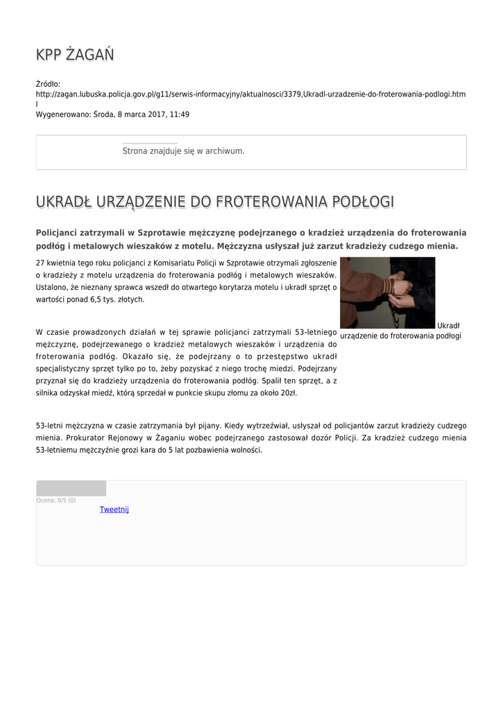 KPP ŻAGAŃ Źródło: http://zagan.lubuska.policja.gov.pl/g11/serwis-informacyjny/aktualnosci/3379,Ukradl-urzadzenie-do-froterowania-podlogi.htm l Wygenerowano: Środa, 8 marca 2017, 11:49 Strona znajduje się w archiwum. UKRADŁ URZĄDZENIE DO FROTEROWANIA PODŁOGI Policjanci zatrzymali w Szprotawie mężczyznę podejrzanego o kradzież urządzenia do froterowania podłóg i metalowych wieszaków z motelu. Mężczyzna usłyszał już zarzut kradzieży cudzego mienia. 27 kwietnia tego roku policjanci z Komisariatu Policji w Szprotawie otrzymali zgłoszenie o kradzieży z motelu urządzenia do froterowania podłóg i metalowych wieszaków. Ustalono, że nieznany sprawca wszedł do otwartego korytarza motelu i ukradł sprzęt o wartości ponad 6,5 tys. złotych. Ukradł W czasie prowadzonych działań w tej sprawie policjanci zatrzymali 53-letniego urządzenie do froterowania podłogi mężczyznę, podejrzewanego o kradzież metalowych wieszaków i urządzenia do froterowania podłóg. Okazało się, że podejrzany o to przestępstwo ukradł specjalistyczny sprzęt tylko po to, żeby pozyskać z niego trochę miedzi. Podejrzany przyznał się do kradzieży urządzenia do froterowania podłóg. Spalił ten sprzęt, a z silnika odzyskał miedź, którą sprzedał w punkcie skupu złomu za około 20zł. 53-letni mężczyzna w czasie zatrzymania był pijany. Kiedy wytrzeźwiał, usłyszał od policjantów zarzut kradzieży cudzego mienia. Prokurator Rejonowy w Żaganiu wobec podejrzanego zastosował dozór Policji. Za kradzież cudzego mienia 53-letniemu mężczyźnie grozi kara do 5 lat pozbawienia wolności. Ocena: 0/5 (0) Tweetnij