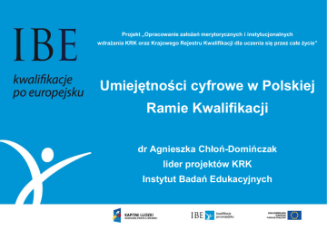 Projekt „Opracowanie założeń merytorycznych i instytucjonalnych wdrażania KRK oraz Krajowego Rejestru Kwalifikacji dla uczenia się przez całe życie” Umiejętności cyfrowe w Polskiej Ramie Kwalifikacji dr Agnieszka Chłoń-Domińczak lider projektów KRK Instytut Badań Edukacyjnych Główne punkty Nowe podejście do edukacji z perspektywy systemu kwalifikacji Komputer (nie)oswojony? Polska Rama Kwalifikacji dla określenia efektów uczenia się Miejsce kompetencji cyfrowych w PRK Budowanie zintegrowanego systemu kwalifikacji – nowe podejście do edukacji Edukacja oparta na efektach uczenia się – nowy impuls dla rozwoju społeczeństwa wiedzy Poprawa jakości edukacji Otwarcie edukacji na potrzeby rynku pracy Wzrost odsetka kształcących się dorosłych Odpowiedź na problemy wynikające z procesów globalizacji oraz zmian demograficznych Wykorzystywanie technologii informacyjno-komunikacyjnych Międzynarodowe Badanie Kompetencji Dorosłych (PIAAC) pozwoliło na pierwszą, międzynarodowo porównywalną, ocenę wykorzystania TIK przez dorosłych W Polsce odsetek osób rozwiązujących test na komputerze jest najniższy spośród 23 krajów uczestniczących w badaniu 50,2% osób rozwiązywało zadania w wersji komputerowej 19,5% osób zadeklarowało brak doświadczenia z komputerem 23,8% odmówiło udziału w wersji komputerowej 6,5% nie zaliczyło testu podstaw obsługi komputera Wśród osób młodych (16-24) 12% odmówiło, a 7% nie miało niezbędnych podstaw obsługi komputera (tylko w Japonii mniejszy odsetek rozwiązujących test na komputerze) W Polsce tylko 37,9% osób w wieku 16-24 osiągnęło poziom 2 lub 3 podczas gdy średnia OECD to 50,6%. Porównywalnie niski wynik w grupie osób młodych mają tylko Stany Zjednoczone Pracujący Polacy rzadziej niż w innych krajach korzystają z komputera w pracy (46% nigdy nie korzysta wobec 30% w krajach OECD) APopulacja 16-65 lat A A A Szwecja Finlandia Holandia Norwegia Dania Australia Kanada Niemcy Wielka Brytania Japonia Belgia OECD 22 Czechy Austria USA Korea Estonia Słowacja Irlandia Polska Cypr Hiszpania Włochy Francja A A A Struktura Polskiej Ramy Kwalifikacji Umiejętności cyfrowe w PRK Na poziomie uniwersalnym, PRK nie odnosi się bezpośrednio do umiejętności cyfrowych, ale umiejętności te są niezbędne do: Wykonywania zadań i rozwiązywania problemów, w tym w złożonych i nietypowych warunkach Komunikowania się z otoczeniem (w tym z wykorzystaniem poczty elektronicznej, portali społecznościowych itp.) Uczenia się i samorozwoju Umiejętności te są odpowiednio scharakteryzowane na wszystkich poziomach PRK Umiejętności cyfrowe w PRK W odniesieniu do edukacji ogólnej (poziomy 1-4), umiejętności cyfrowe stanowią element charakterystyk poziomów odnoszących się do: Wiedzy: struktury wypowiedzi (rozumianych również jako elementy programowania) Umiejętności: Komunikowania się Tworzenia i odbierania wypowiedzi Wyszukiwania i przetwarzania informacji Indywidualnego uczenia się według wskazówek Na poziomie 5. oraz w szkolnictwie wyższym (poziomy 6-8) bezpośrednio wskazane są umiejętności doboru i stosowania właściwych metod i narzędzi, z wykorzystaniem technologii informacyjno-komunikacyjnych Podsumowanie Rozwój umiejętności cyfrowych należy do jednego z najważniejszych wyzwań stojących przed systemem kwalifikacji w Polsce Polska Rama Kwalifikacji traktuje umiejętności cyfrowe jako element niezbędny do komunikowania się, analizowania i przetwarzania informacji, uczenia się Umiejętności cyfrowe należą do kompetencji horyzontalnych i powinny być uwzględnione w różnego typu kwalifikacjach w systemach oświaty, szkolnictwa wyższego, a także w edukacji pozaformalnej Dziękuję za uwagę Projekt systemowy „Opracowanie założeń merytorycznych i instytucjonalnych wdrażania Krajowych Ram Kwalifikacji oraz Krajowego Rejestru Kwalifikacji dla uczenia się przez całe życie” Projekt współfinansowany ze środków Unii Europejskiej w ramach Europejskiego Funduszu Społecznego Instytut Badań Edukacyjnych Biuro Projektu Krajowych Ram Kwalifikacji ul. Górczewska 8, 01-180 Warszawa tel.: (22) 241 71 70, e-mail: [email protected]